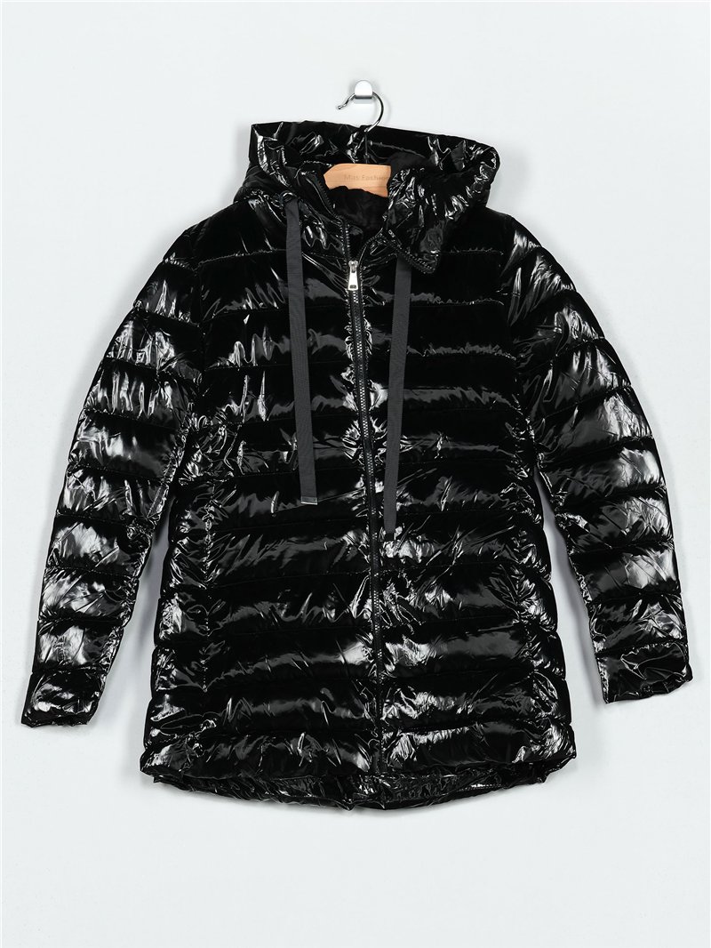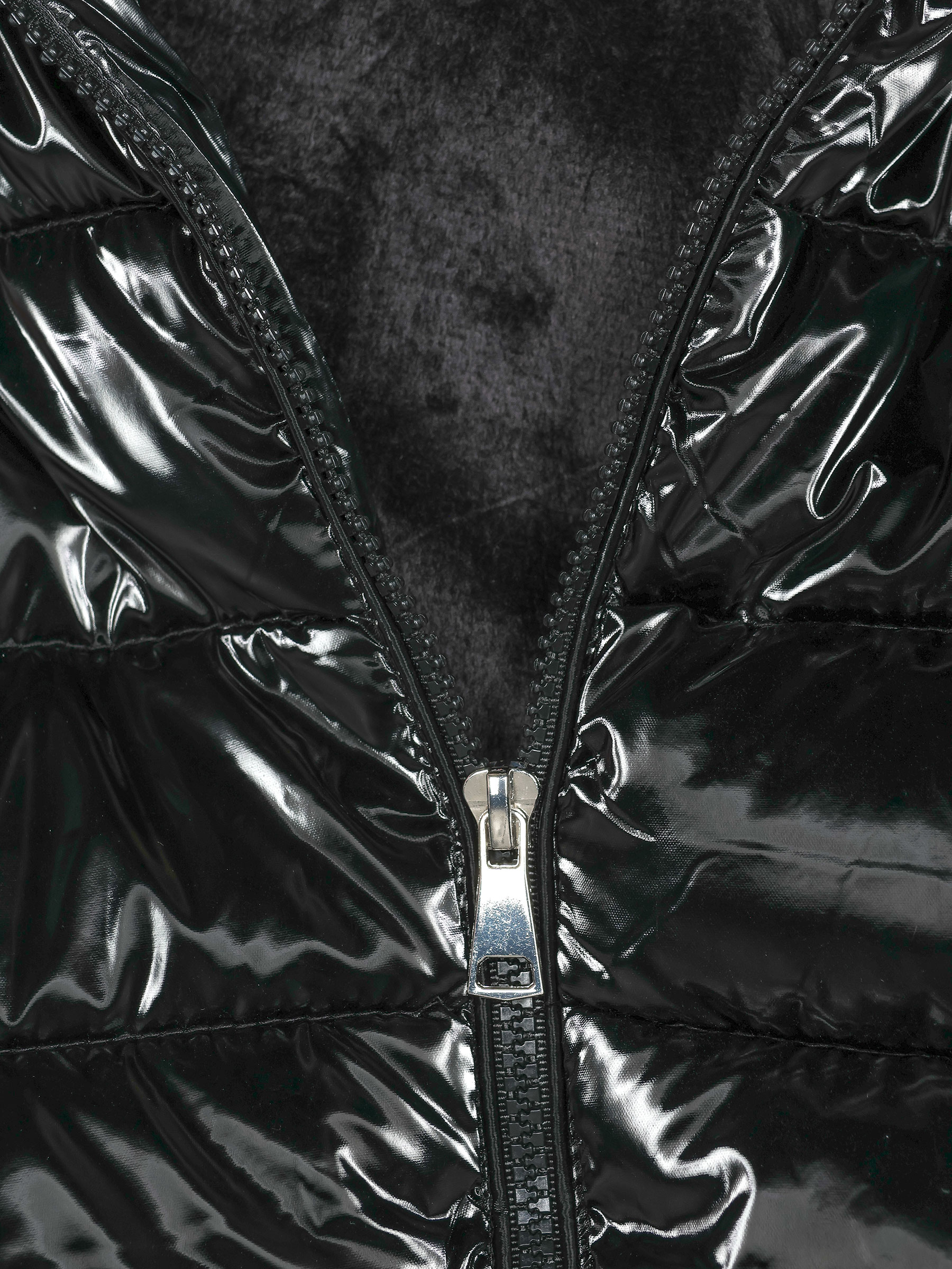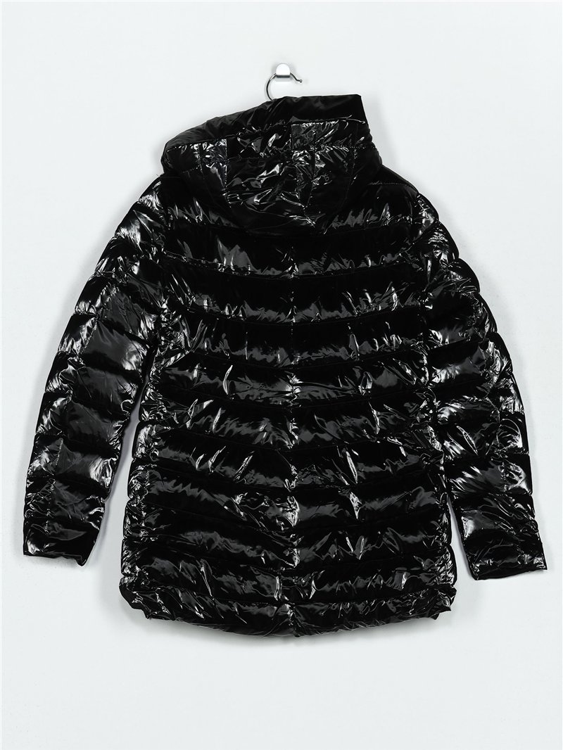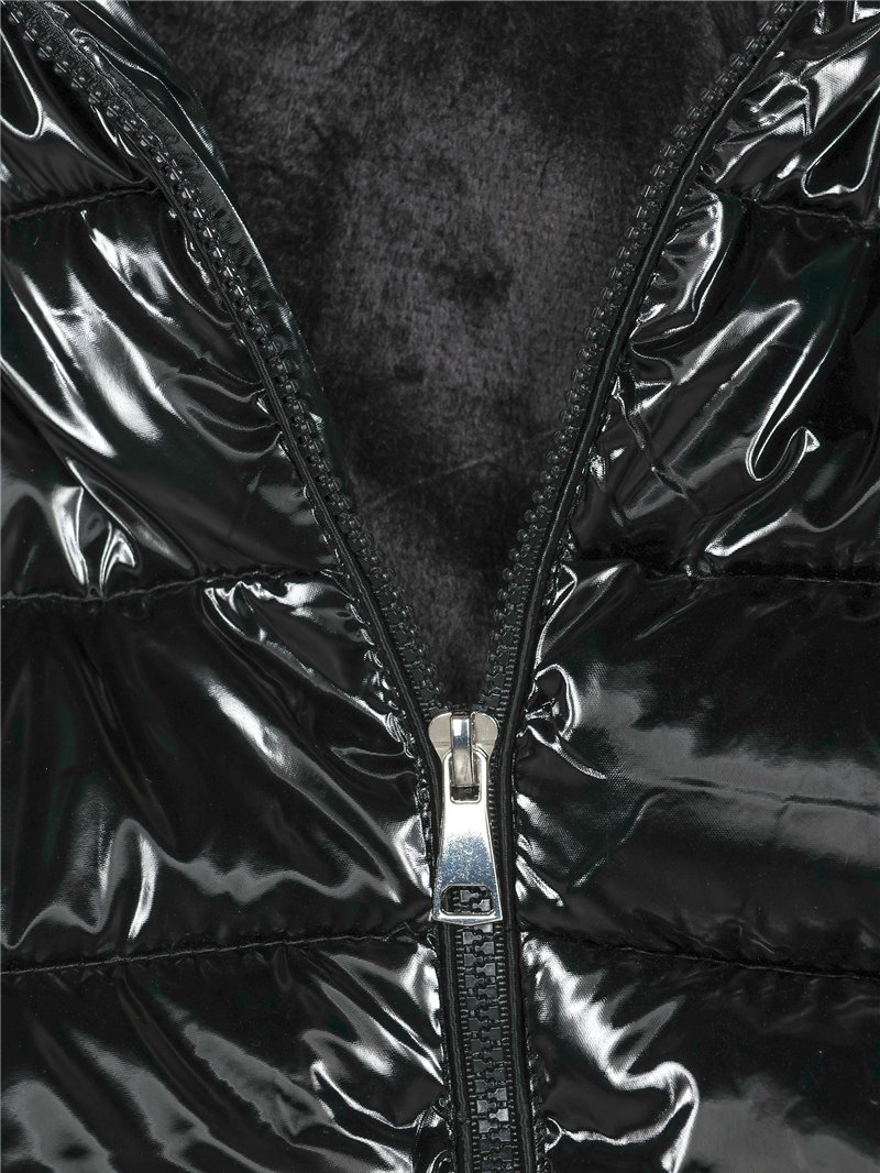 Anorak efecto charol. Acolchado. Water repellent. Acabado interior efecto pelo combinado a tono. Capucha no desmontable. Bolsillos laterales con cremallera. Cuello subido. Manga larga. Cierre de cremallera central.
