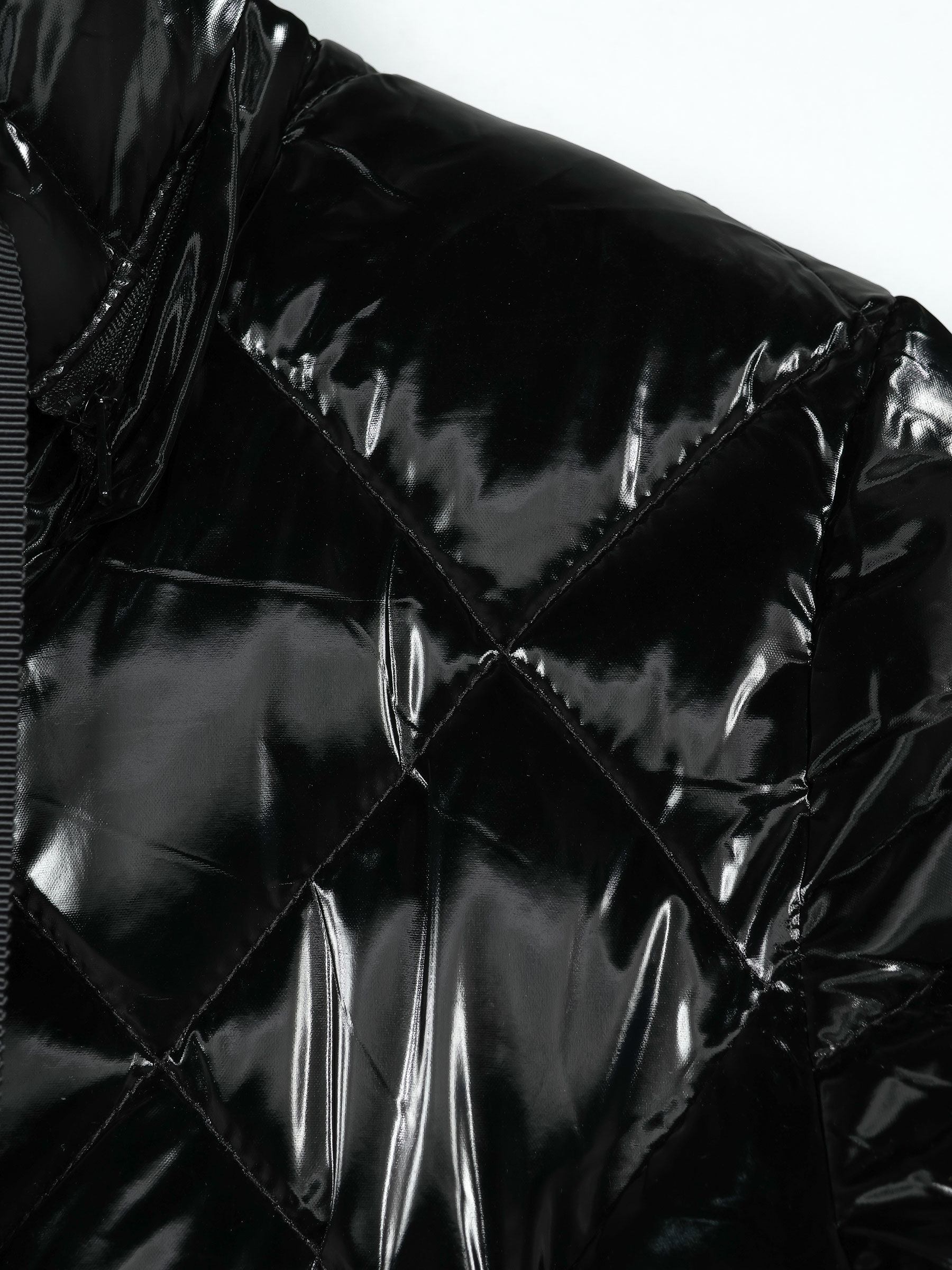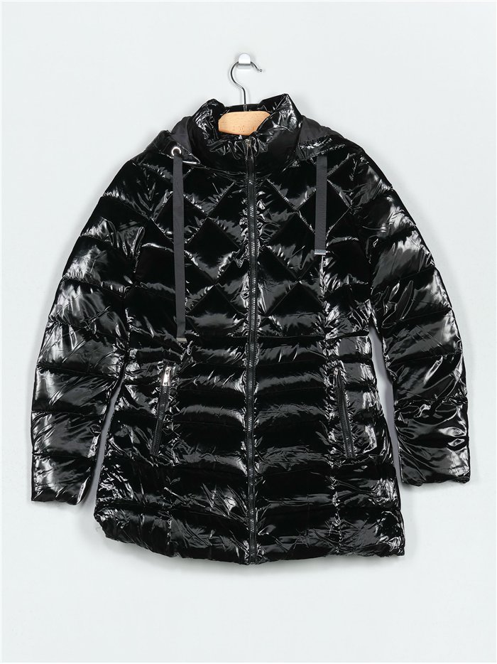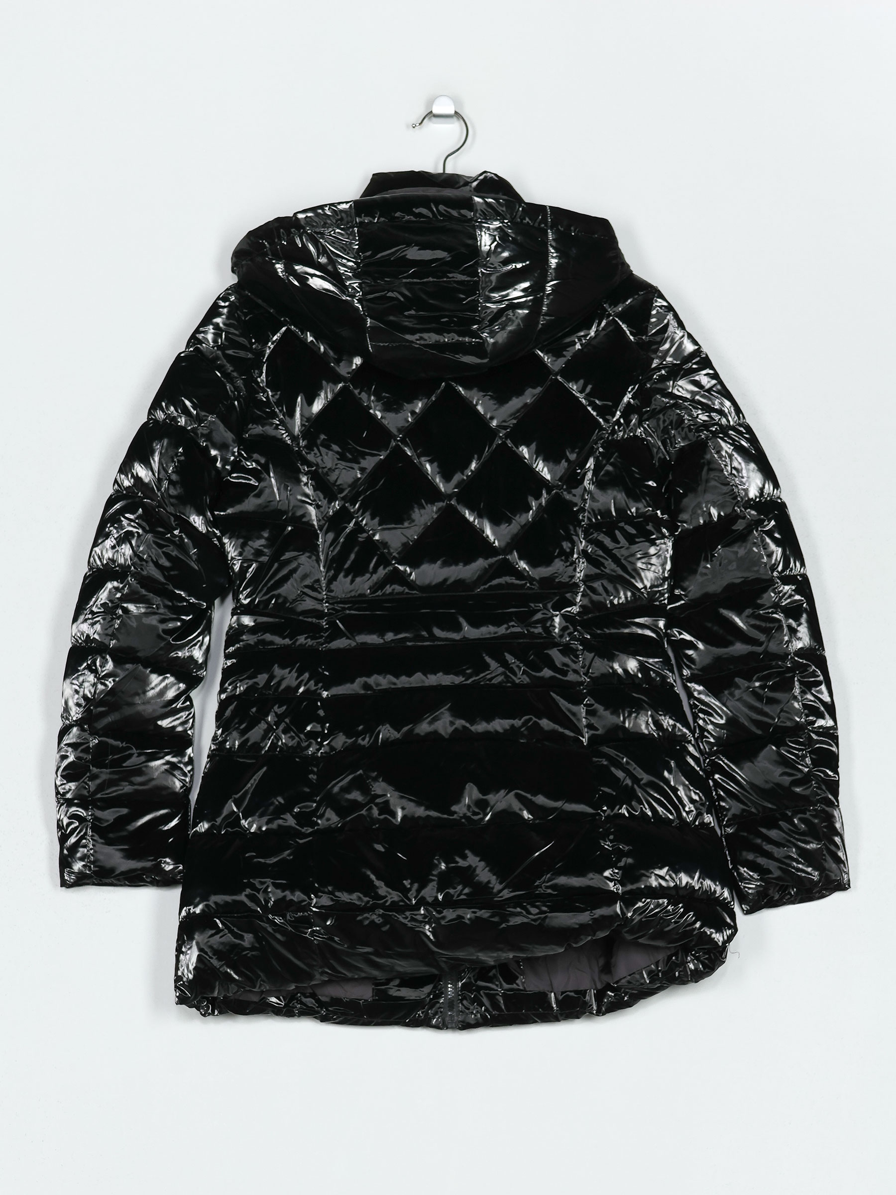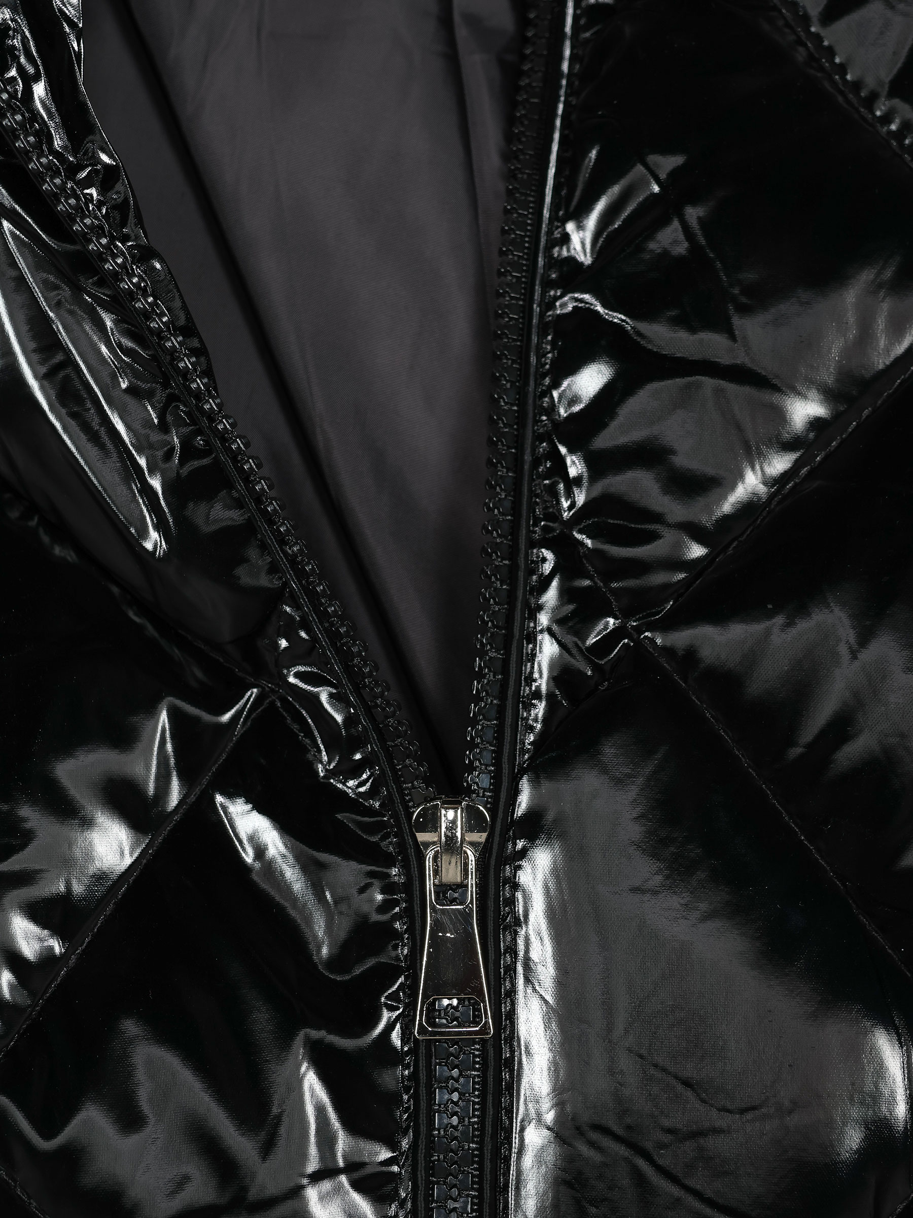 Anorak largo por encima de la rodilla. Water repellent. Efecto charol. Acolchado. Capucha desmontable. Bolsillos laterales con cremallera. Cuello subido. Cierre con cremallera central. Manga larga.