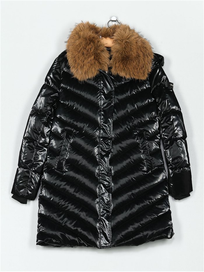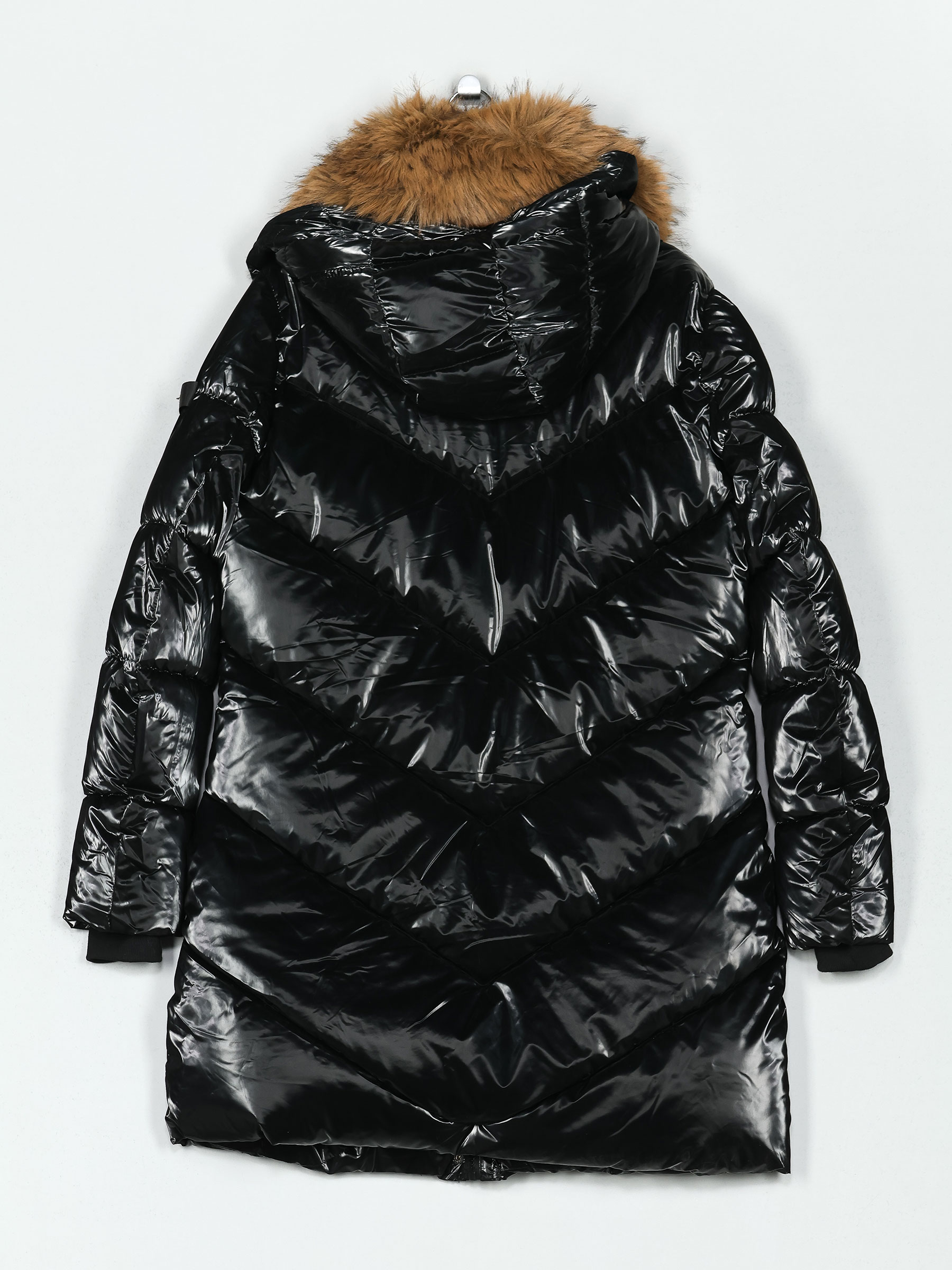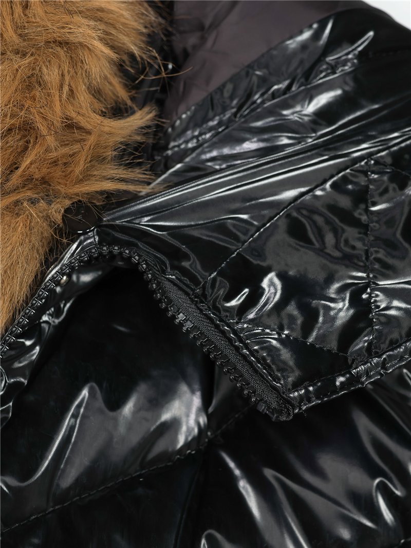 Detalles de anorak amplio acharolado water repellent cuello pelo MF-AF-83202-1-BLACK