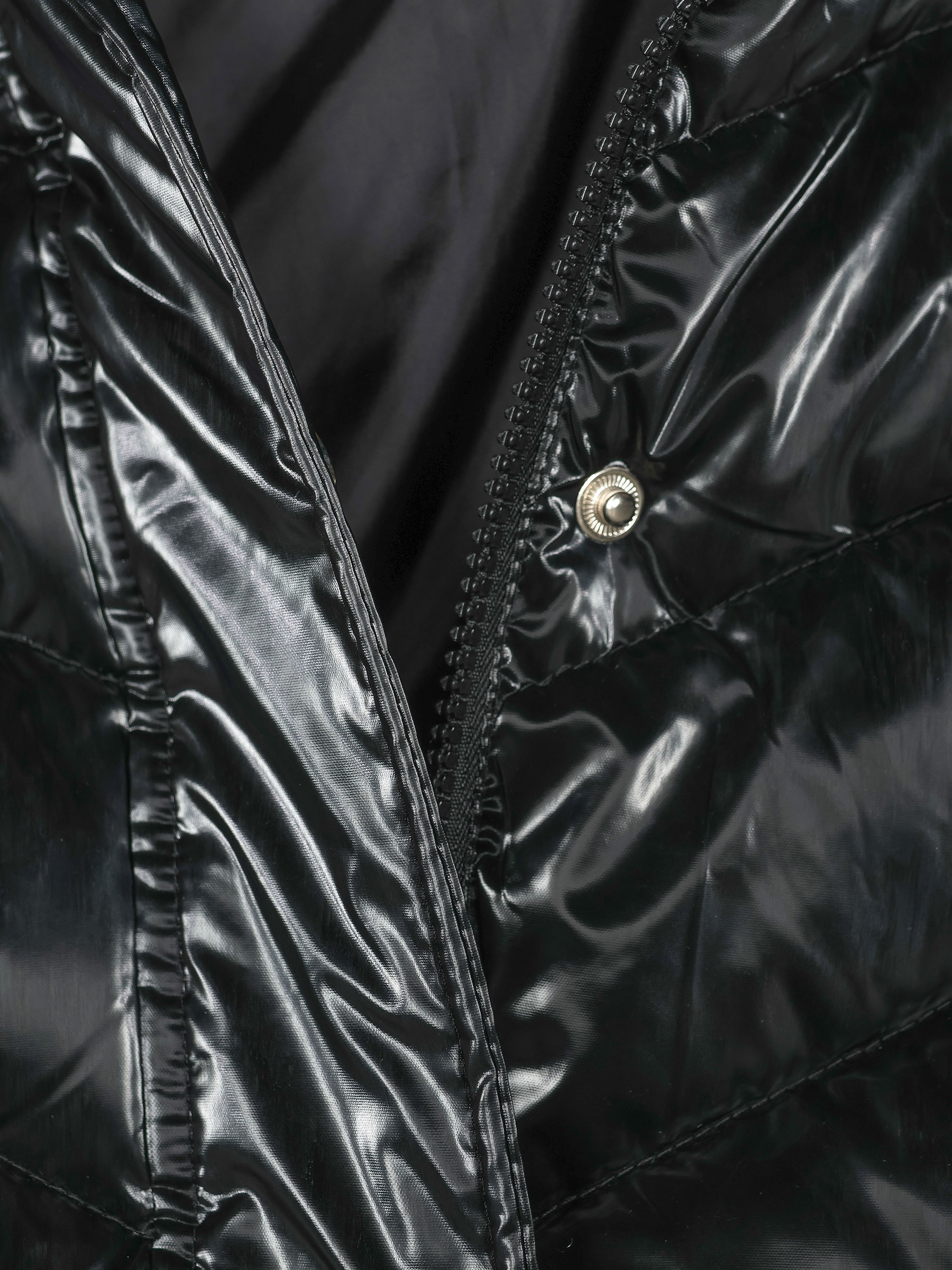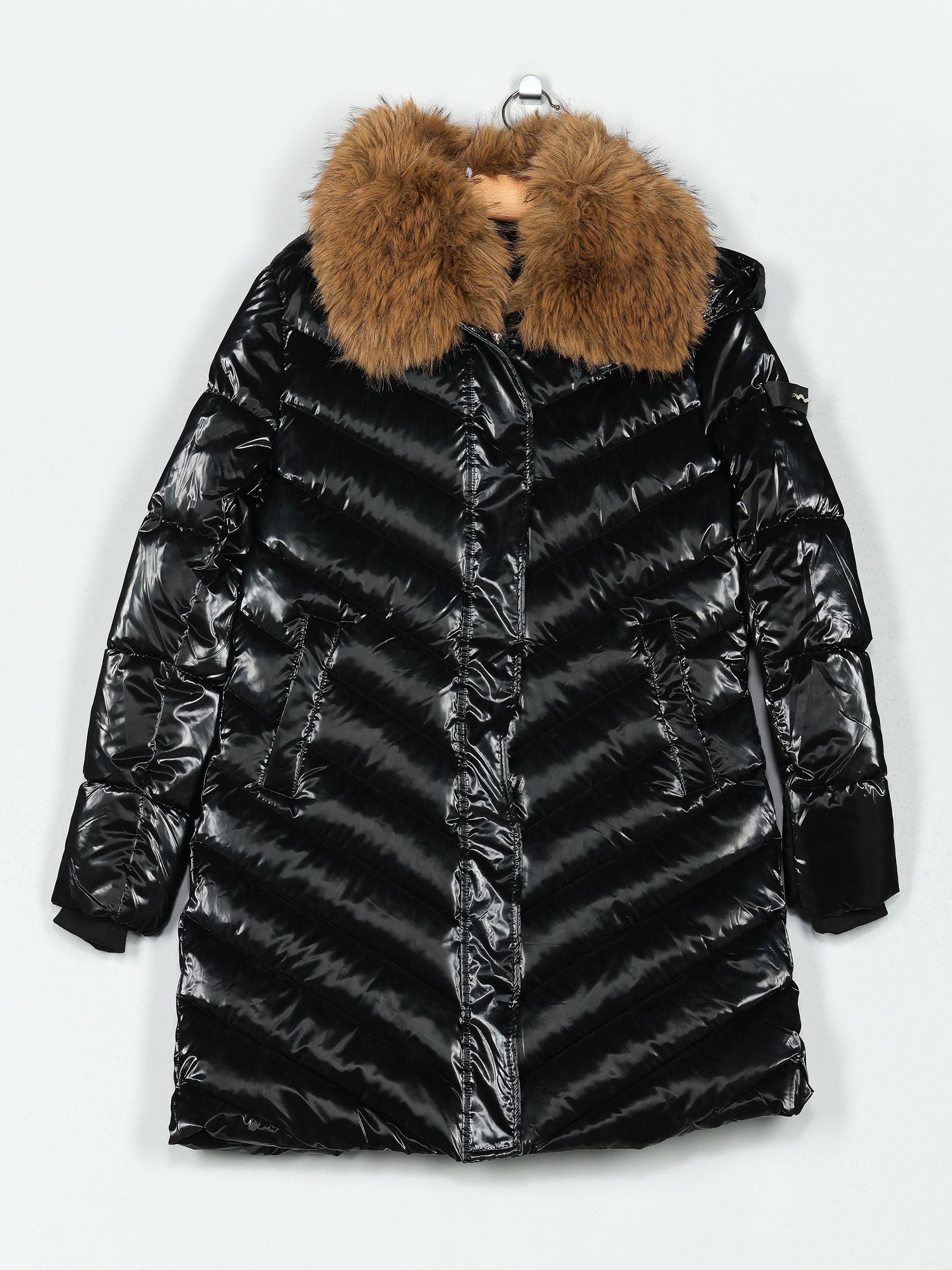 Anorak amplio largo por encima de la rodilla. Acolchado. Efecto charol. Water repellent. Capucha no desmontable con pelo extraíble. Bolsillos laterales. Manga larga acabada en puño elástico. Cierre con cremallera central y botones de presión.
