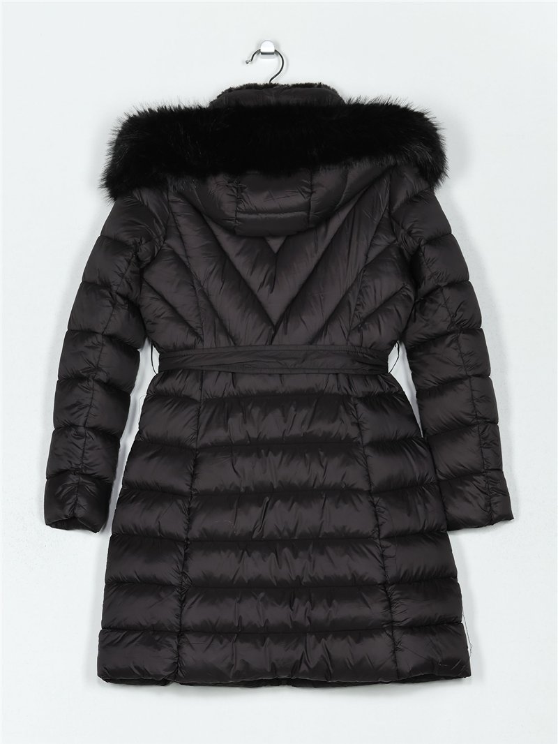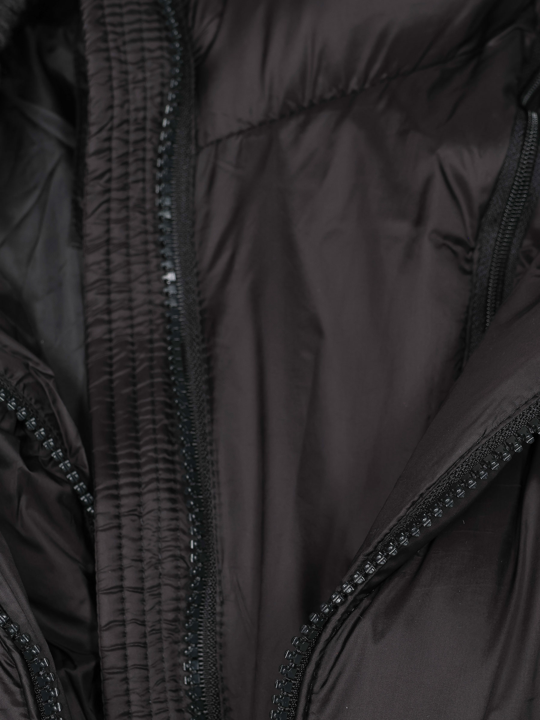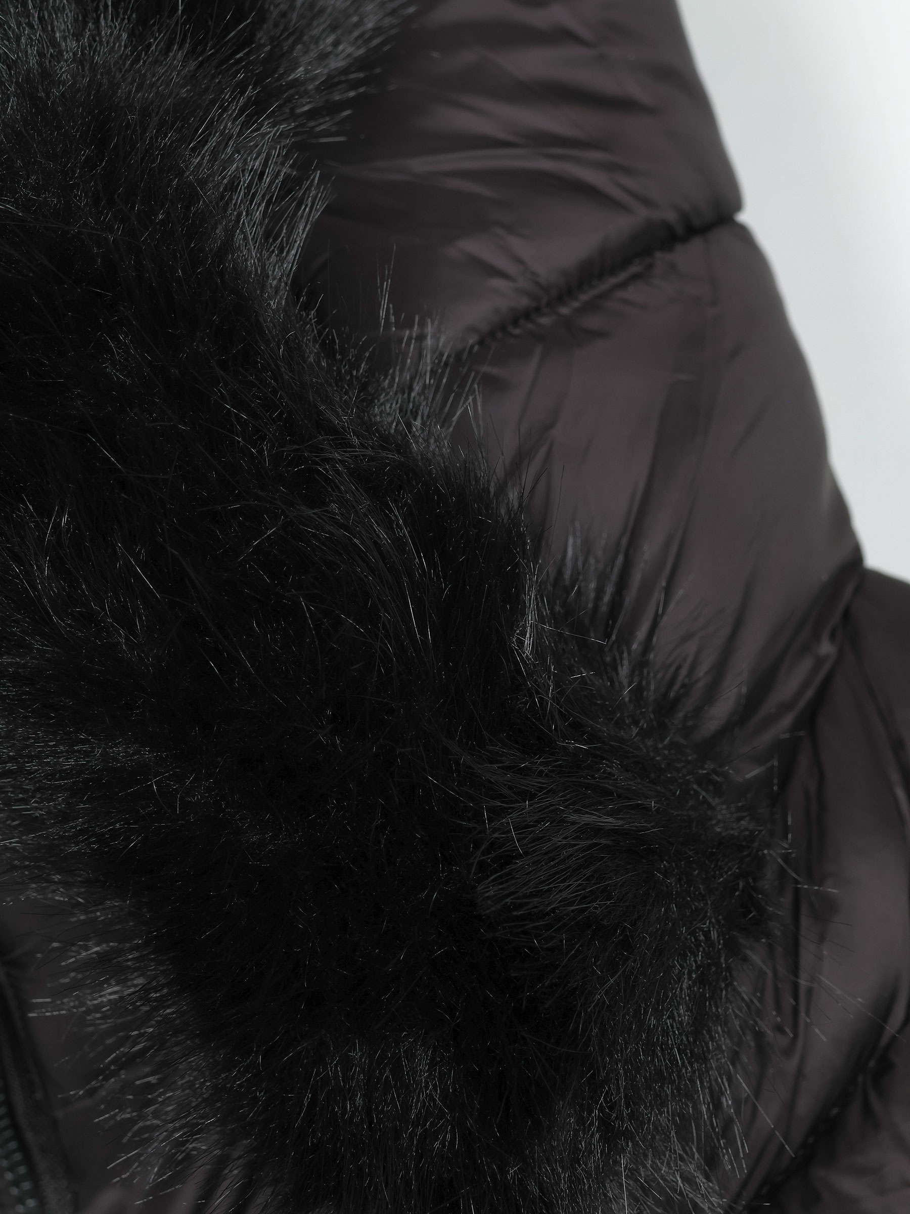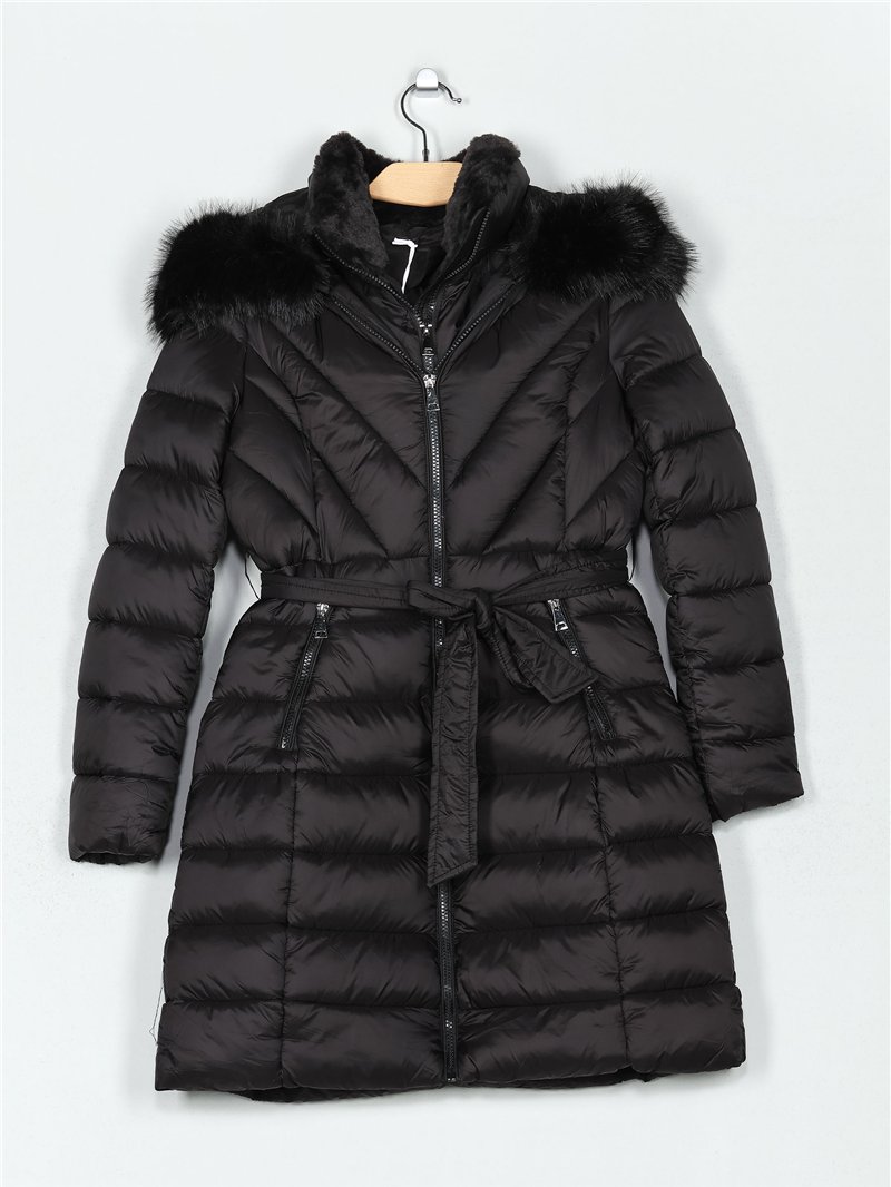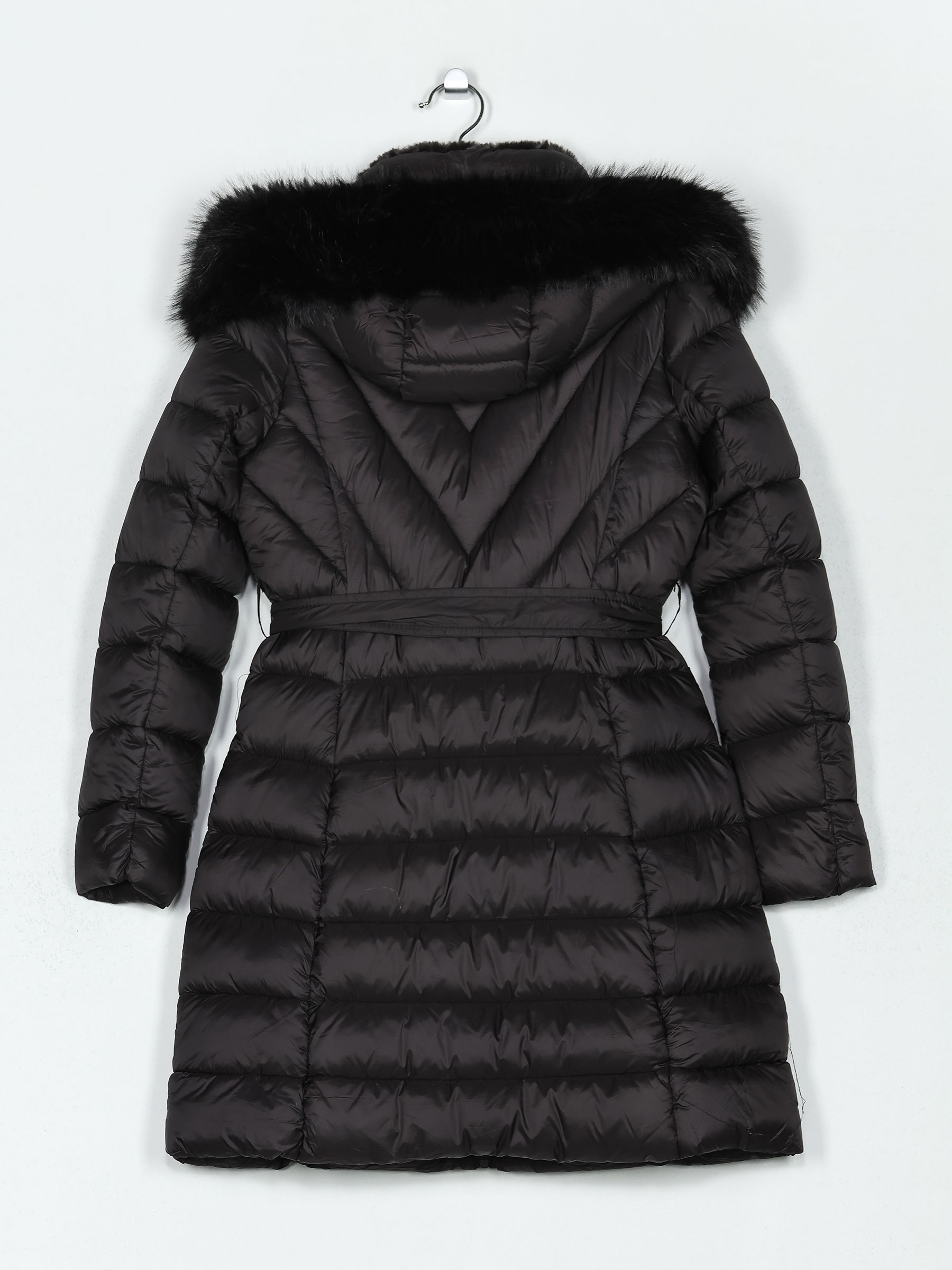 Anorak largo por encima de la rodilla. Acolchado. Detalle cinturón a juego. Bolsillos laterales. Cuello subido desmontable. Capucha no desmontable con pelo extraíble. Manga larga. Cierre con cremallera central.