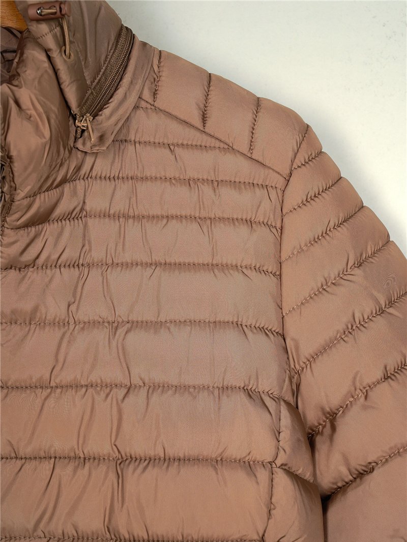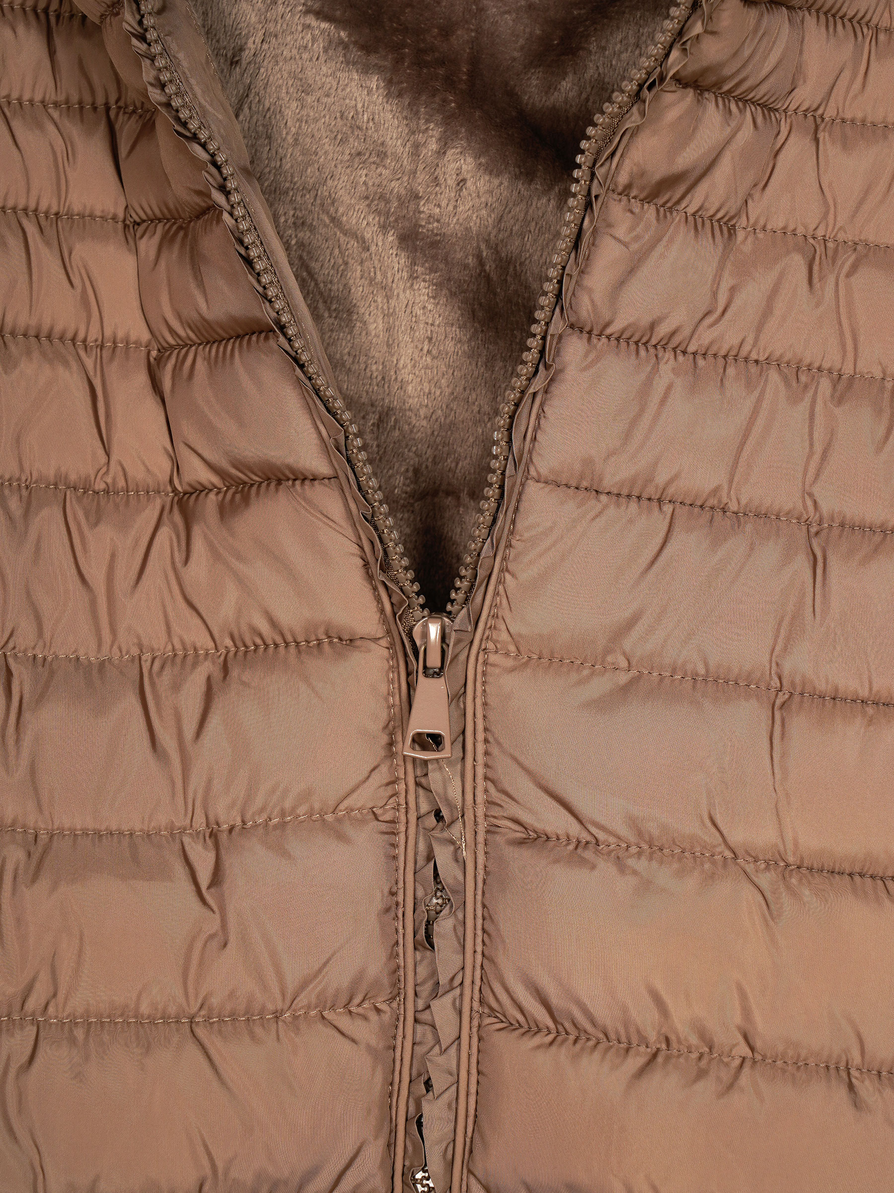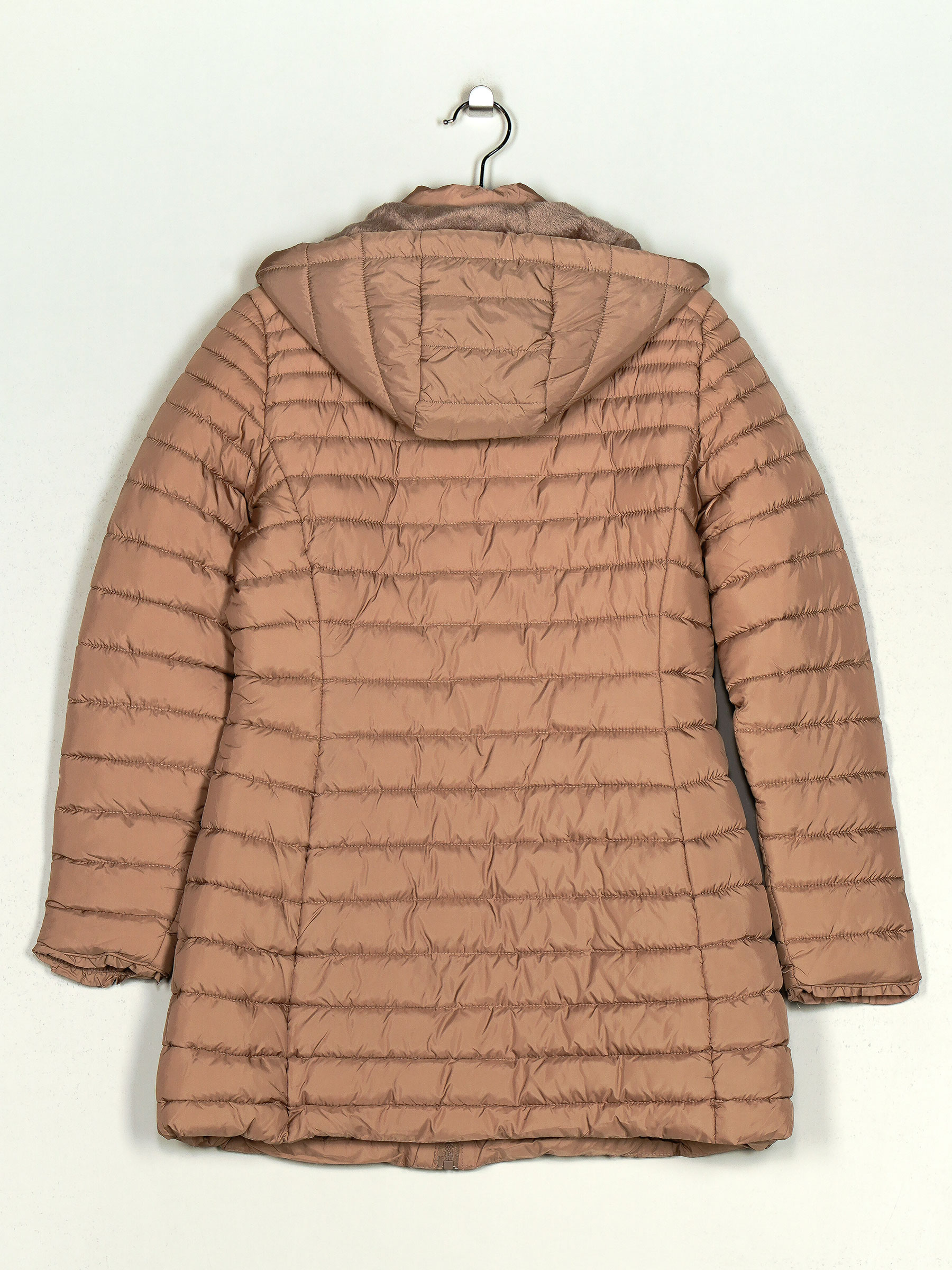 Anorak largo por encima de la rodilla. Acolchado. Bolsillos laterales con cremalleras invisibles. Acabado interior efecto pelo combinado a tono. Capucha desmontable. Cuello subido. Manga larga. Cierre con cremallera central.