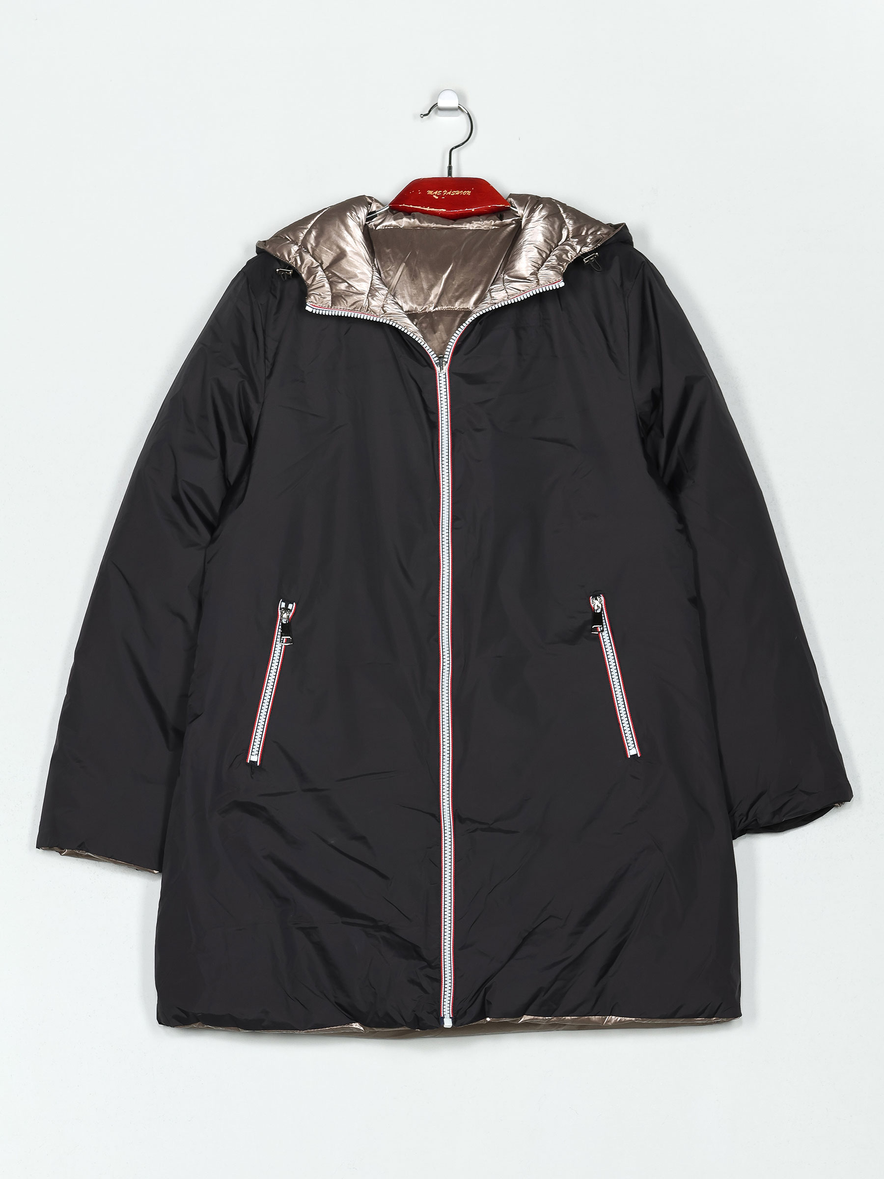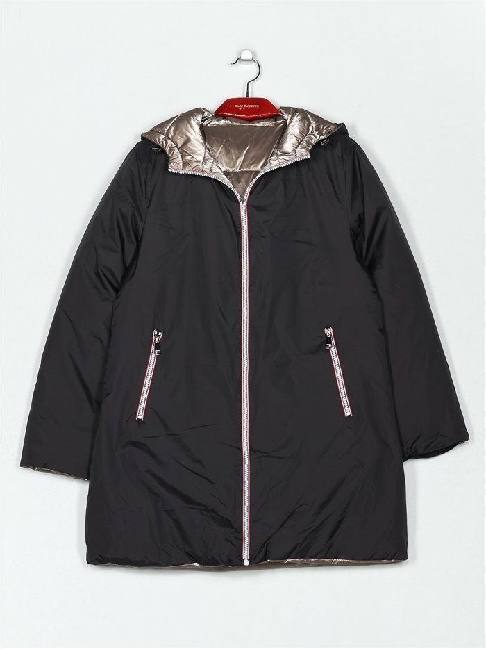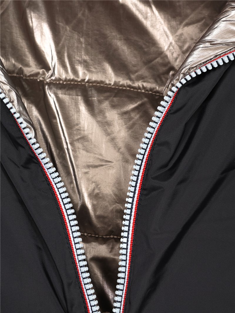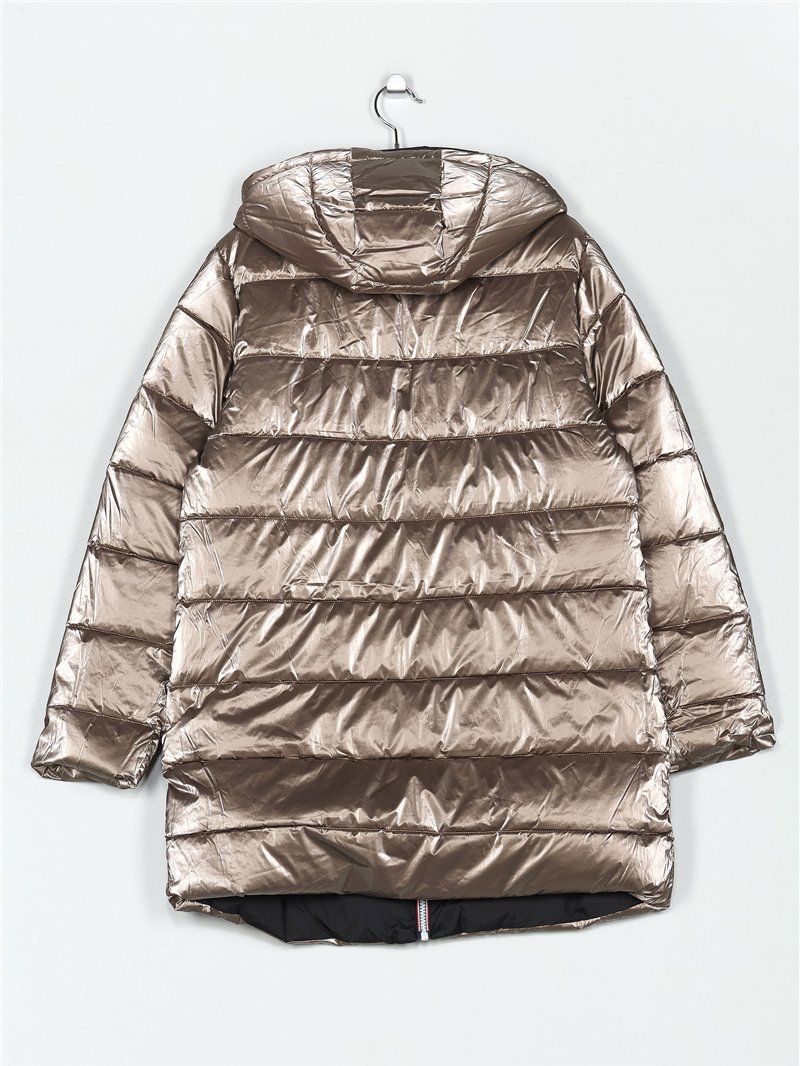 Anorak metalizado largo por encima de la rodilla. Reversible. Capucha no desmontable. Bolsillos laterales. Manga larga. Cierre de cremallera central.