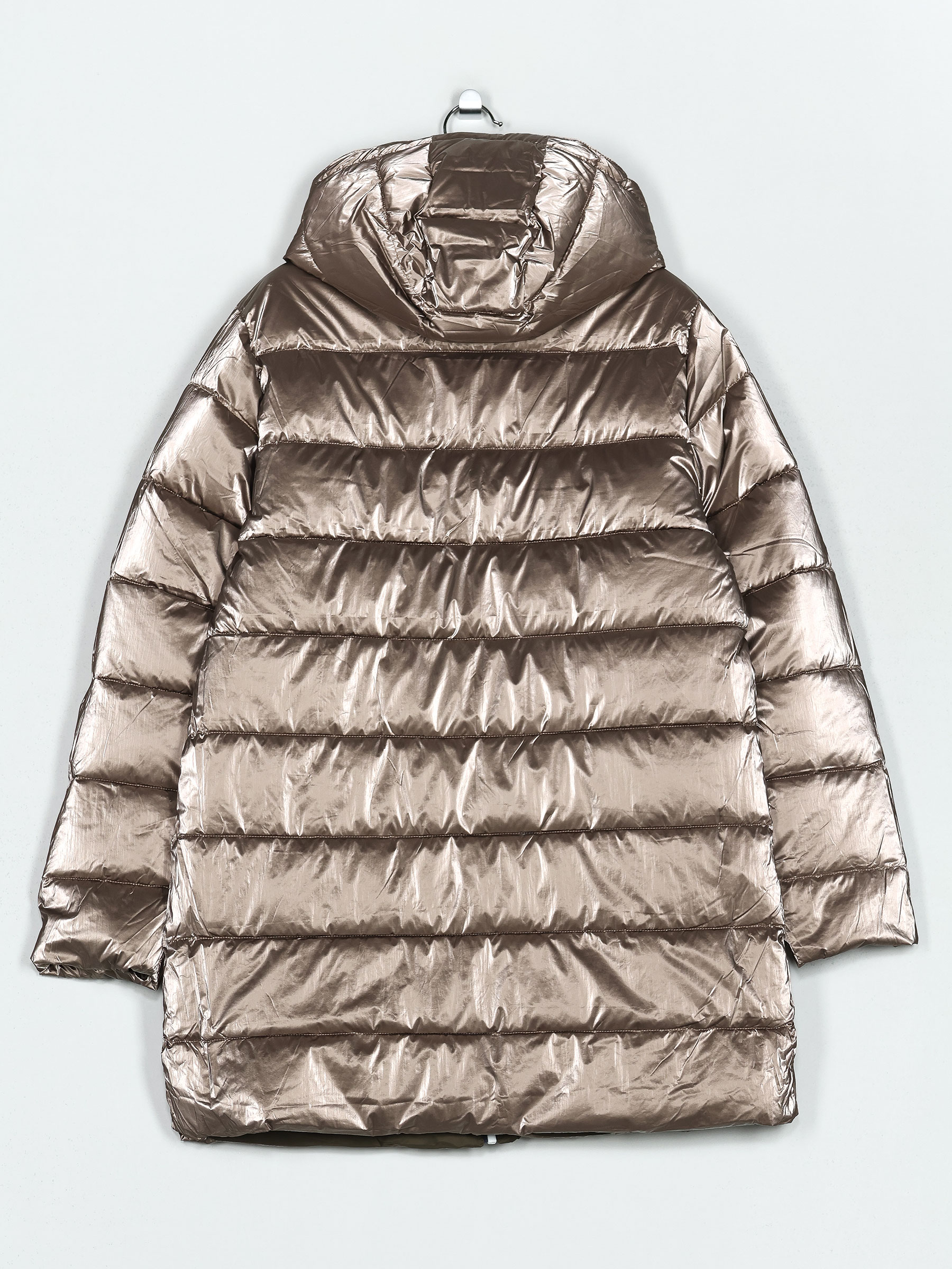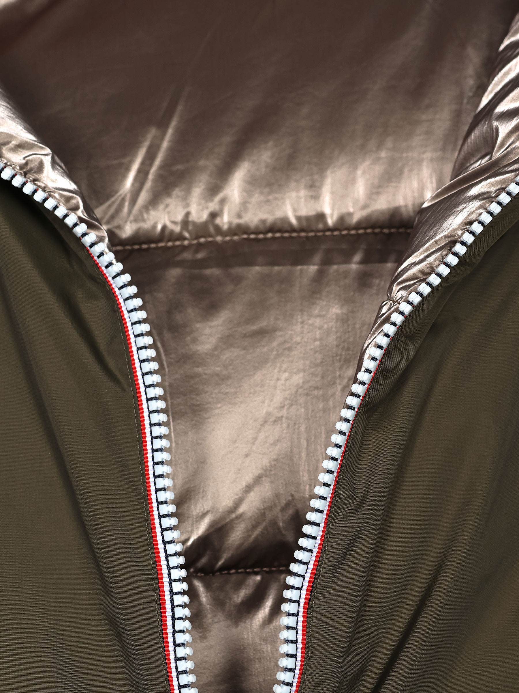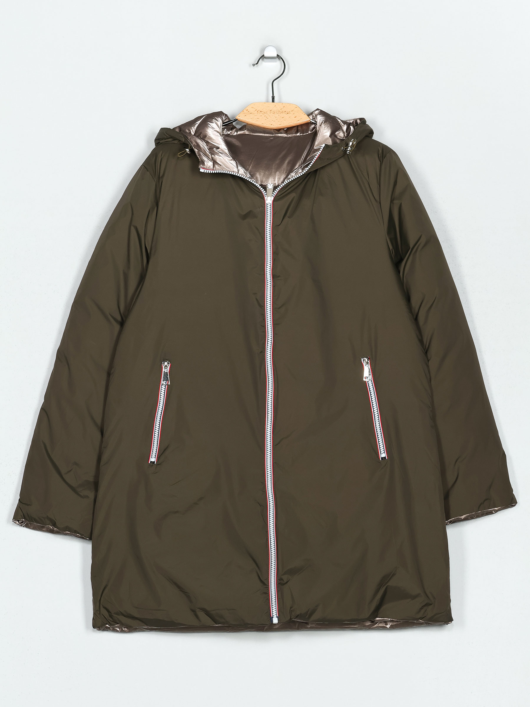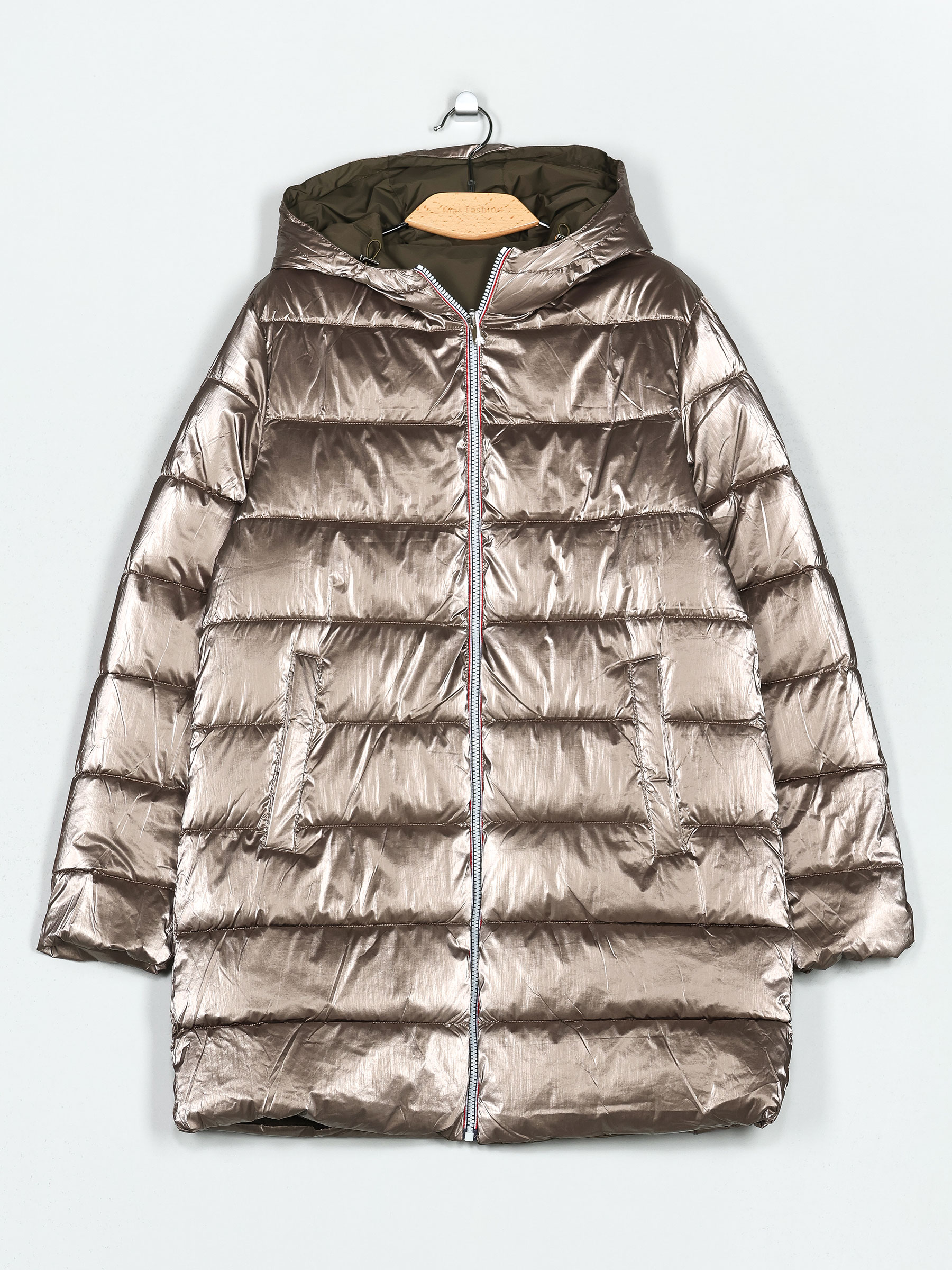 Anorak metalizado largo por encima de la rodilla. Reversible. Capucha no desmontable. Bolsillos laterales. Manga larga. Cierre de cremallera central.