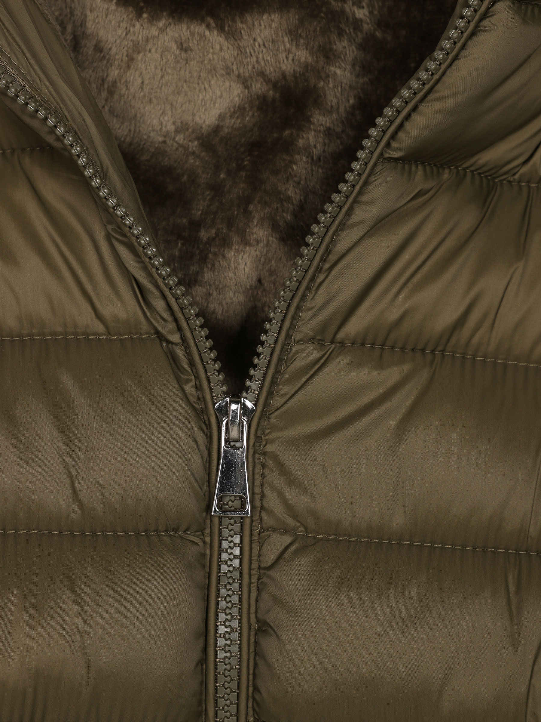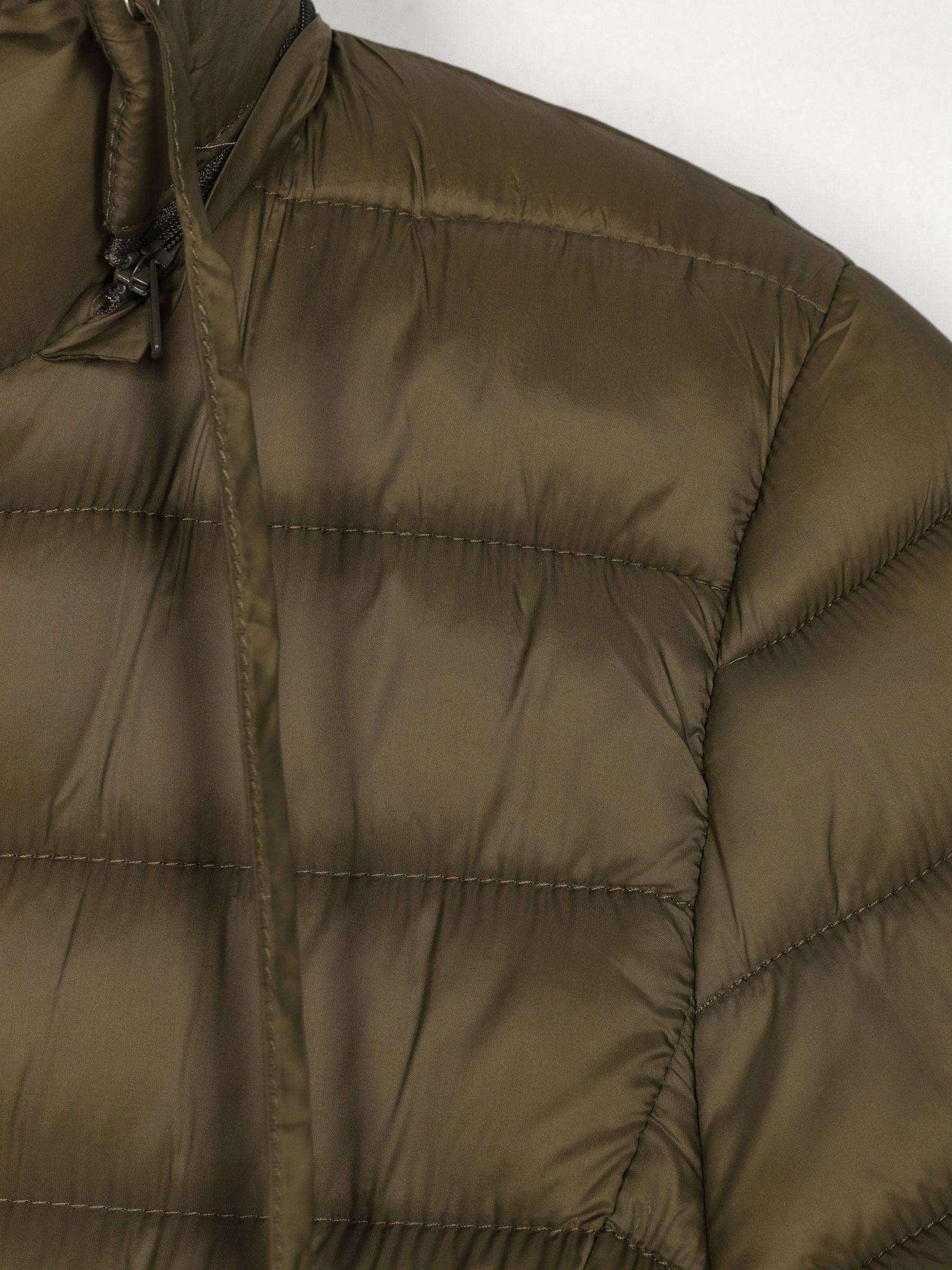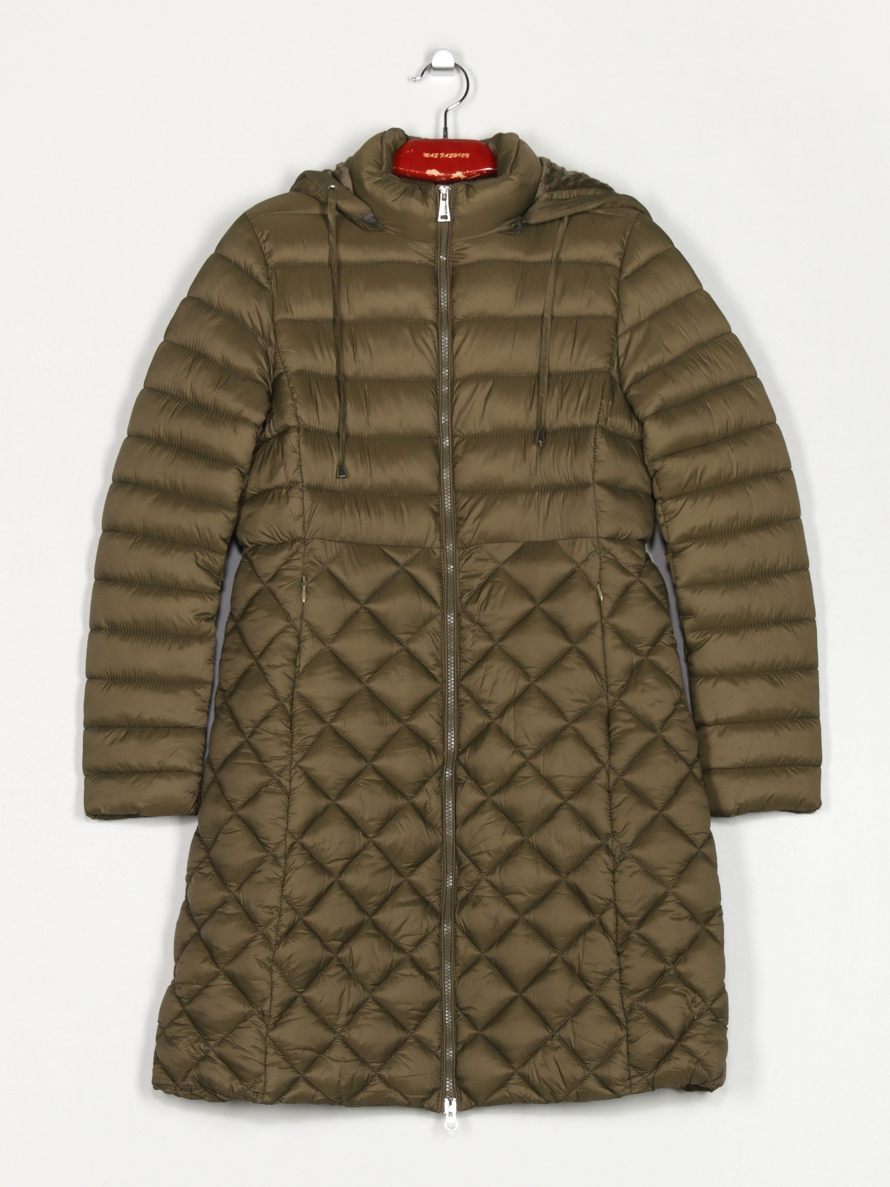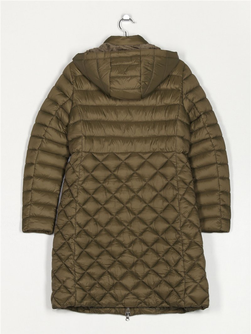 Anorak largo por encima de la rodilla. Acolchada. Bolsillos laterales con cremalleras invisibles. Acabado interior efecto pelo combinado a tono. Capucha desmontable. Cuello subido. Manga larga. Cierre con cremallera central.