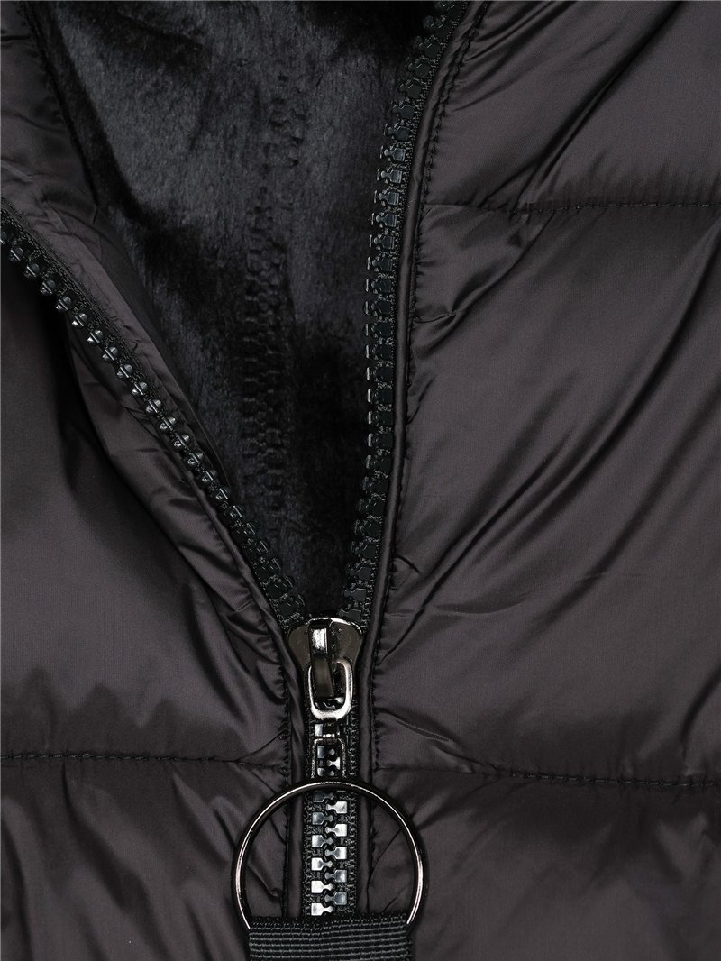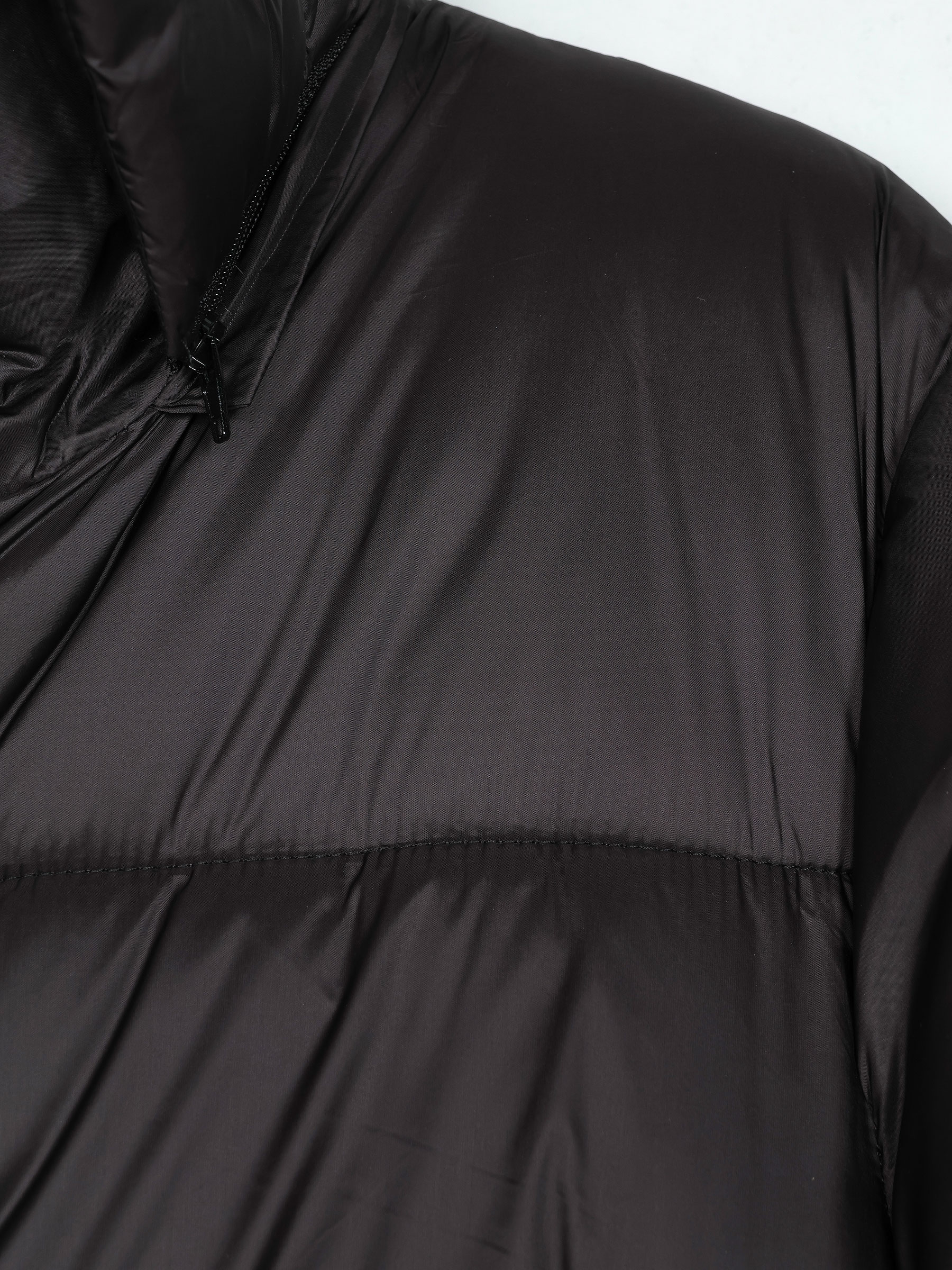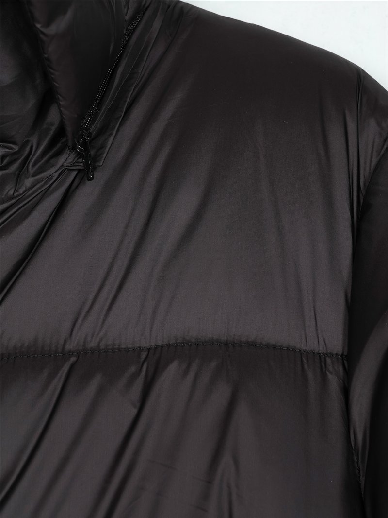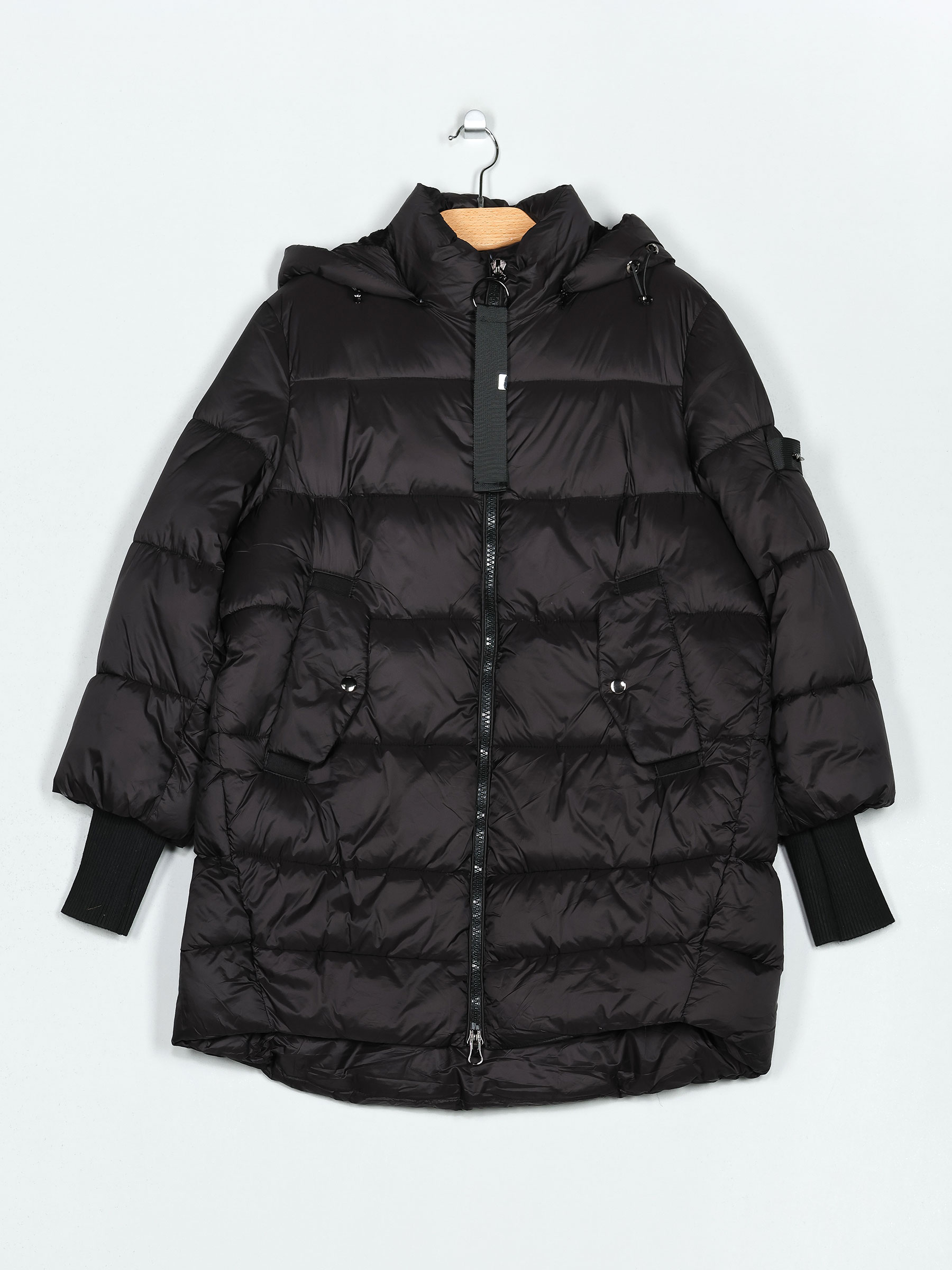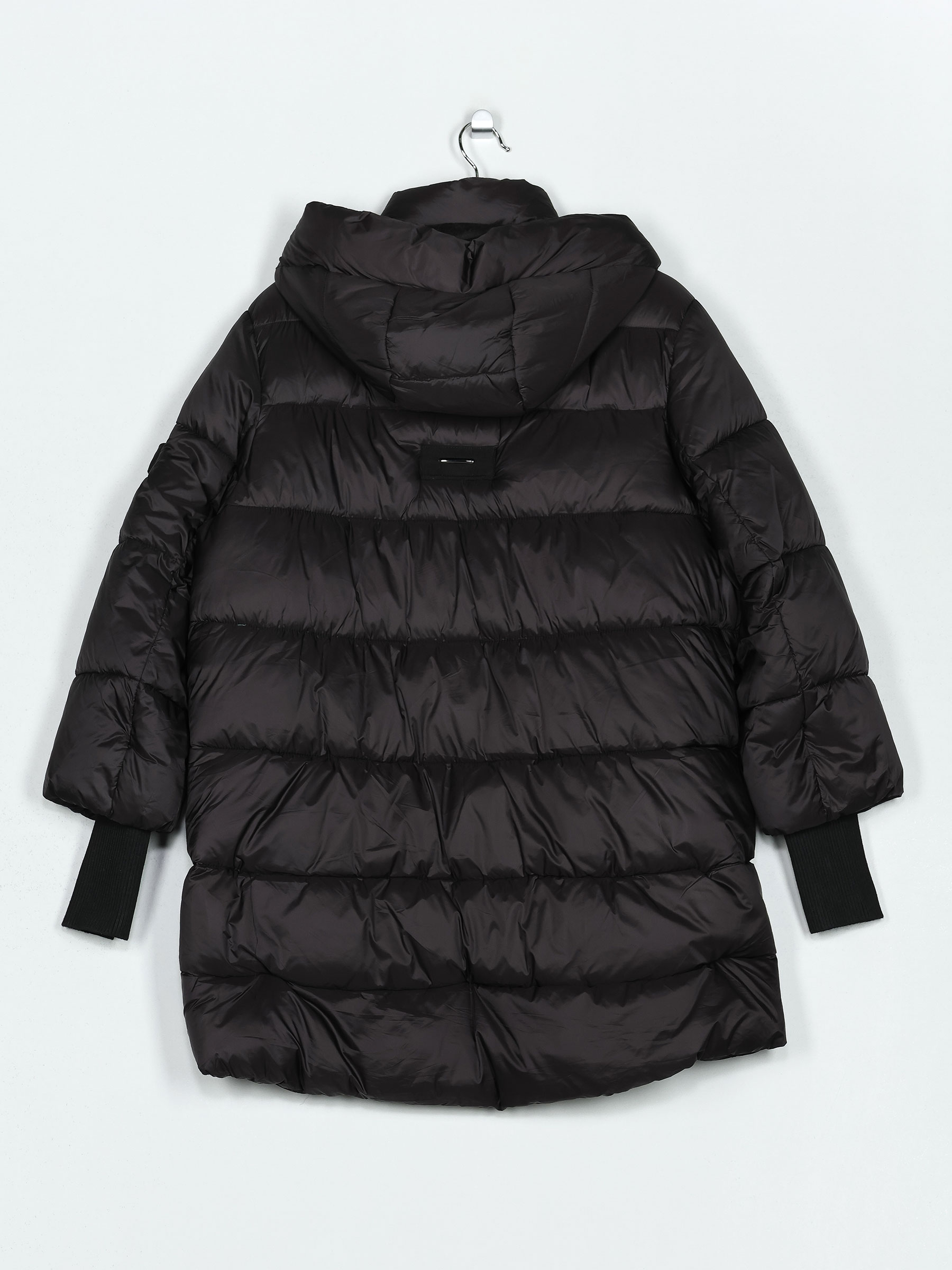 Anorak amplio largo por encima de la rodilla. Capucha desmontable. Bolsillos laterales con botones de presión. Cuello subido. Cierre con cremallera central. Manga larga acabada en puño elástico.