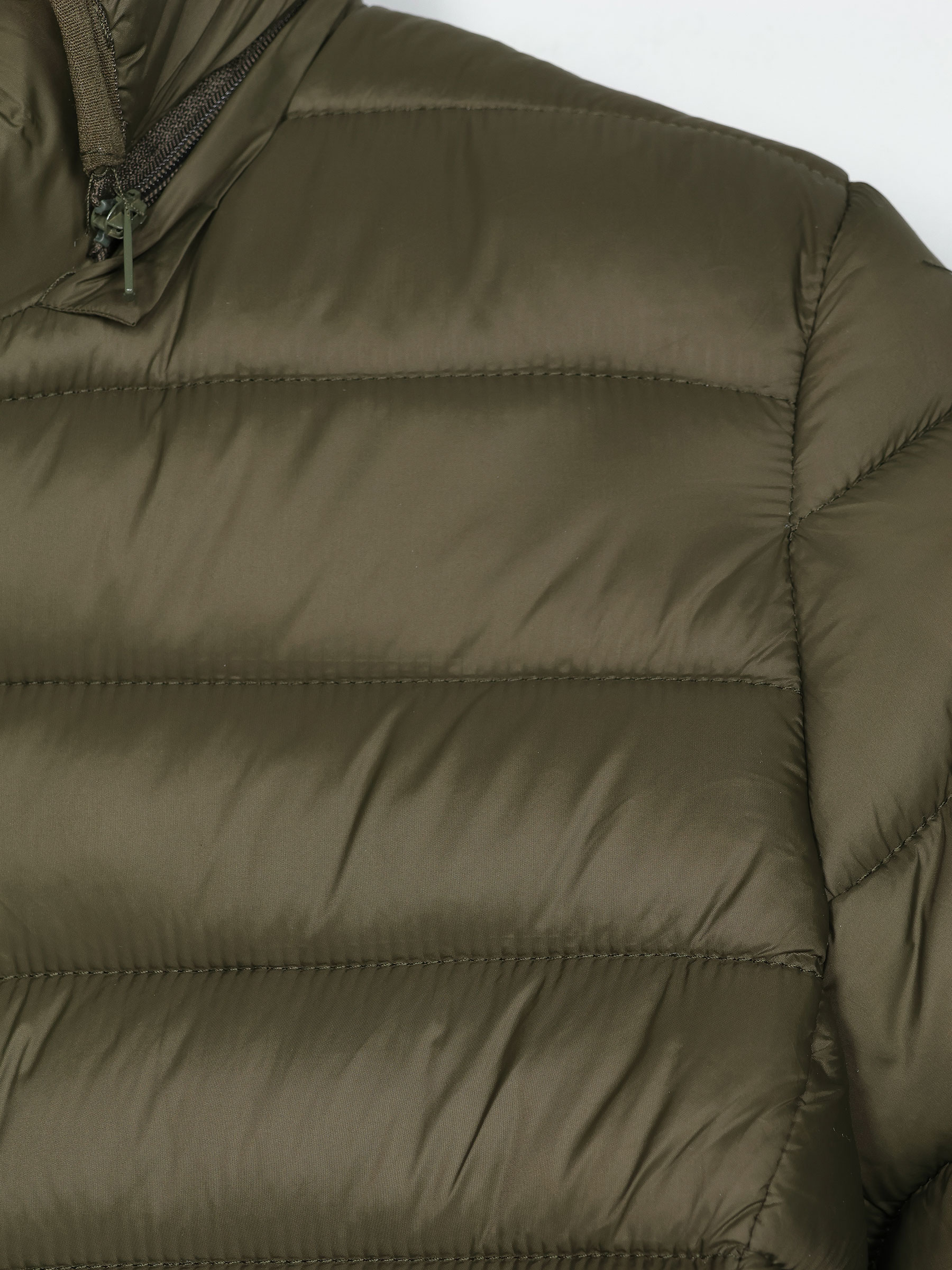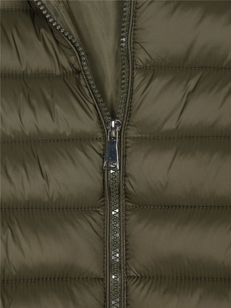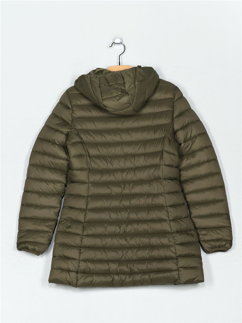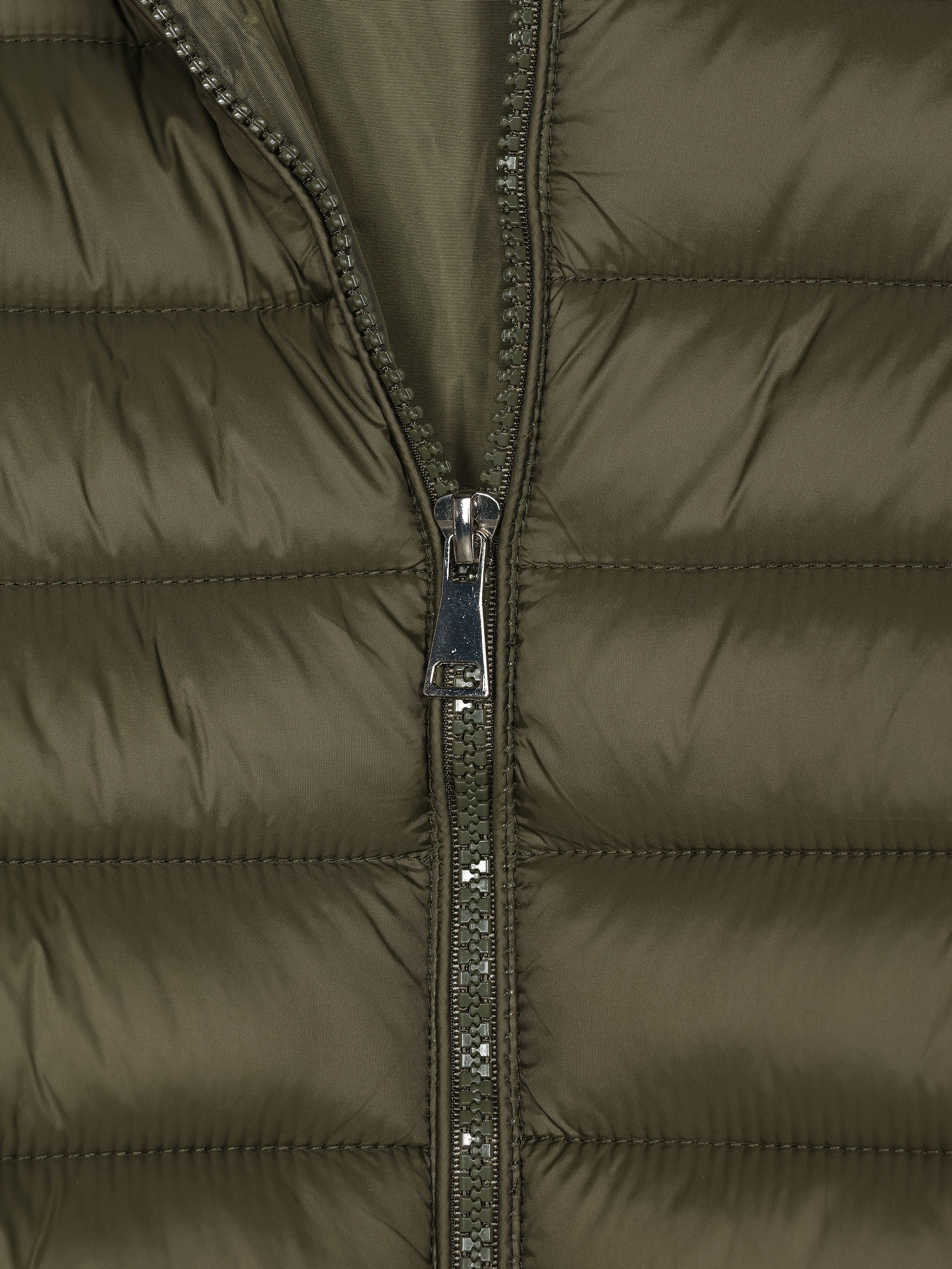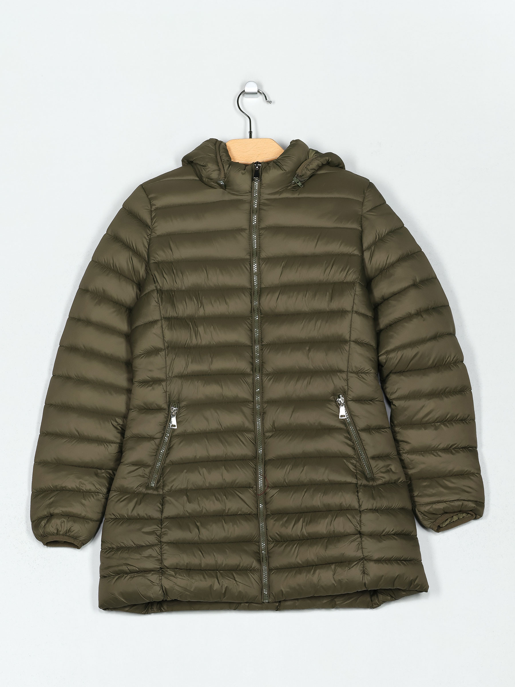 Anorak acolchado. Capucha desmontable. Bolsillos laterales con cremalleras. Cuello subido. Cierre con cremallera central. Manga larga.