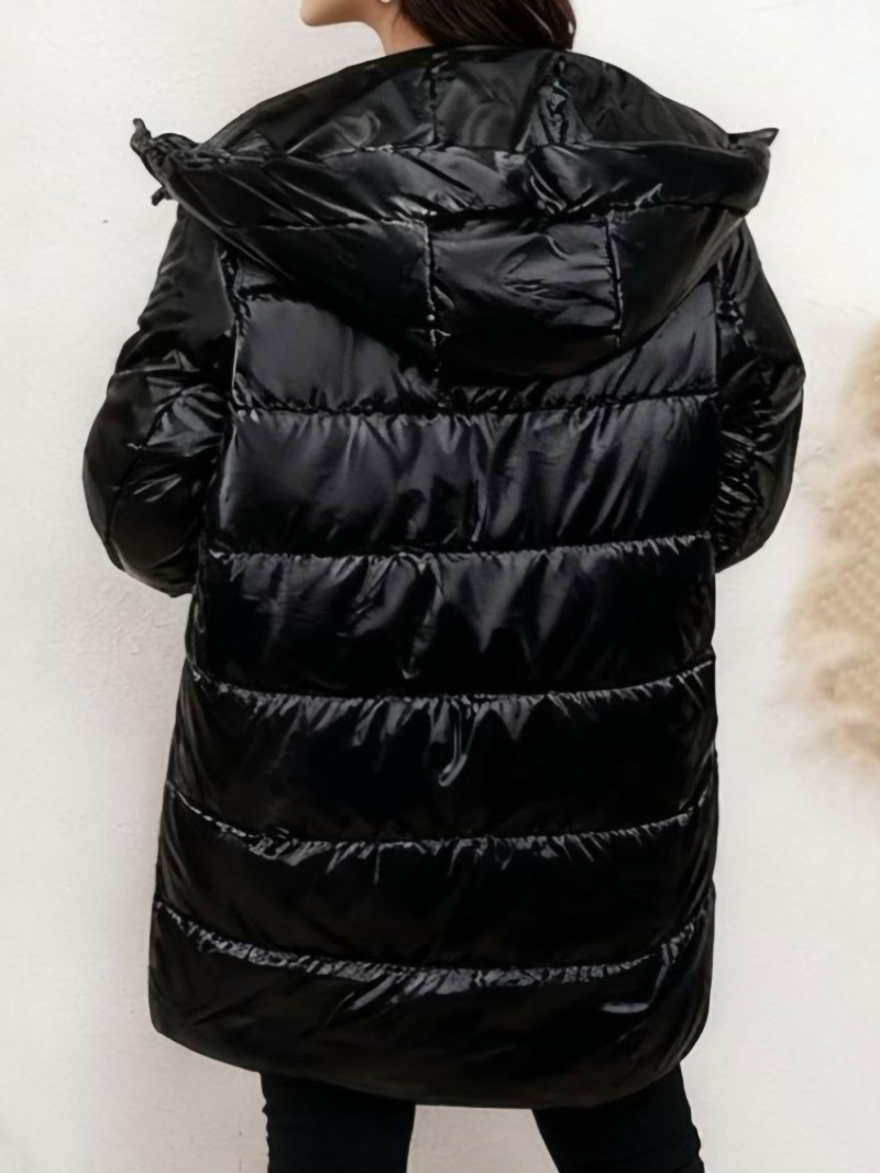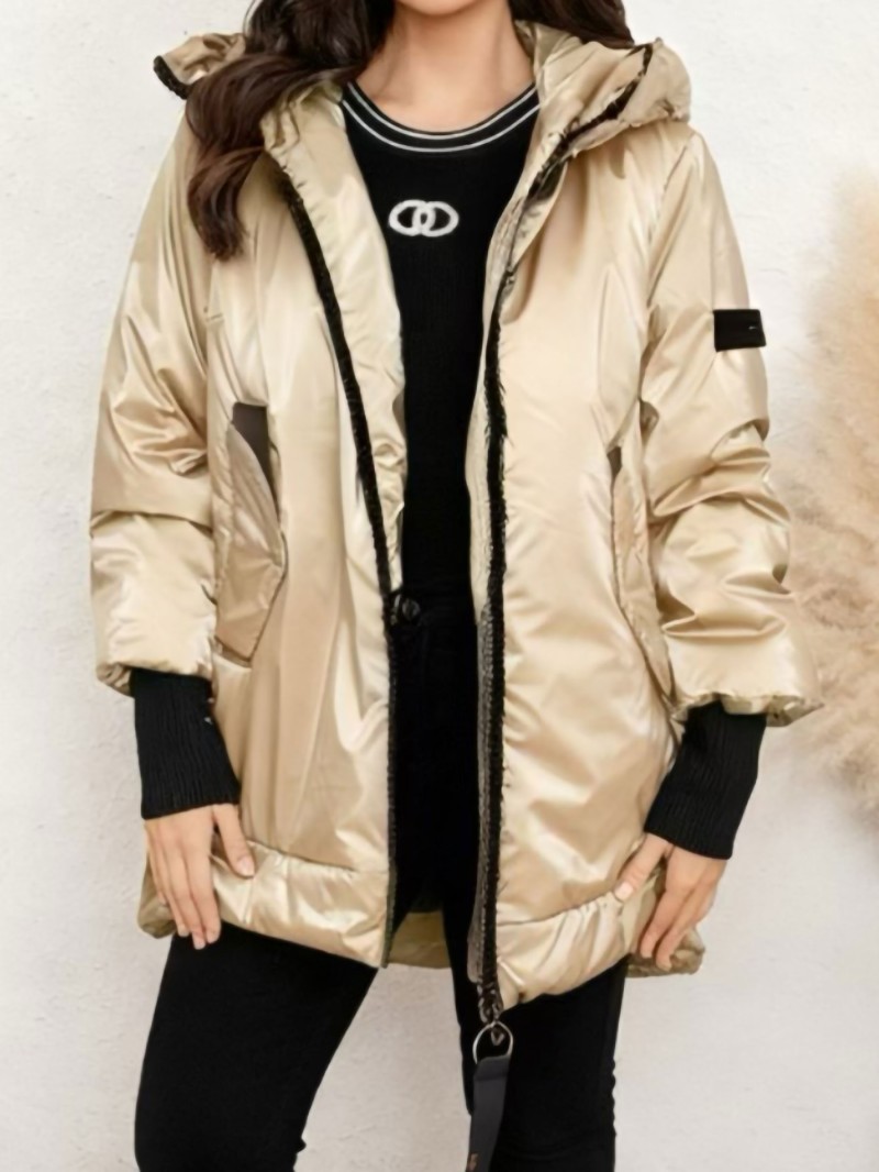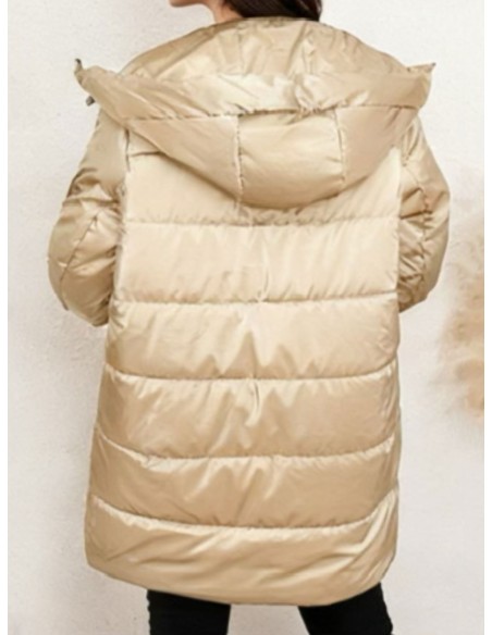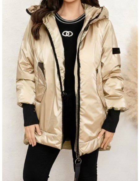 Anorak amplio. Efecto metalizado. Capucha no desmontable. Bolsillos laterales con botones de imán. Cuello subido. Cierre con cremallera central. Manga larga acabada en puño elástico.