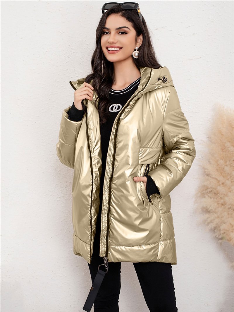 Anorak amplio. Efecto metalizado. Capucha no desmontable. Bolsillos laterales. Cuello subido. Cierre con cremallera central. Manga larga acabada en puño elástico.