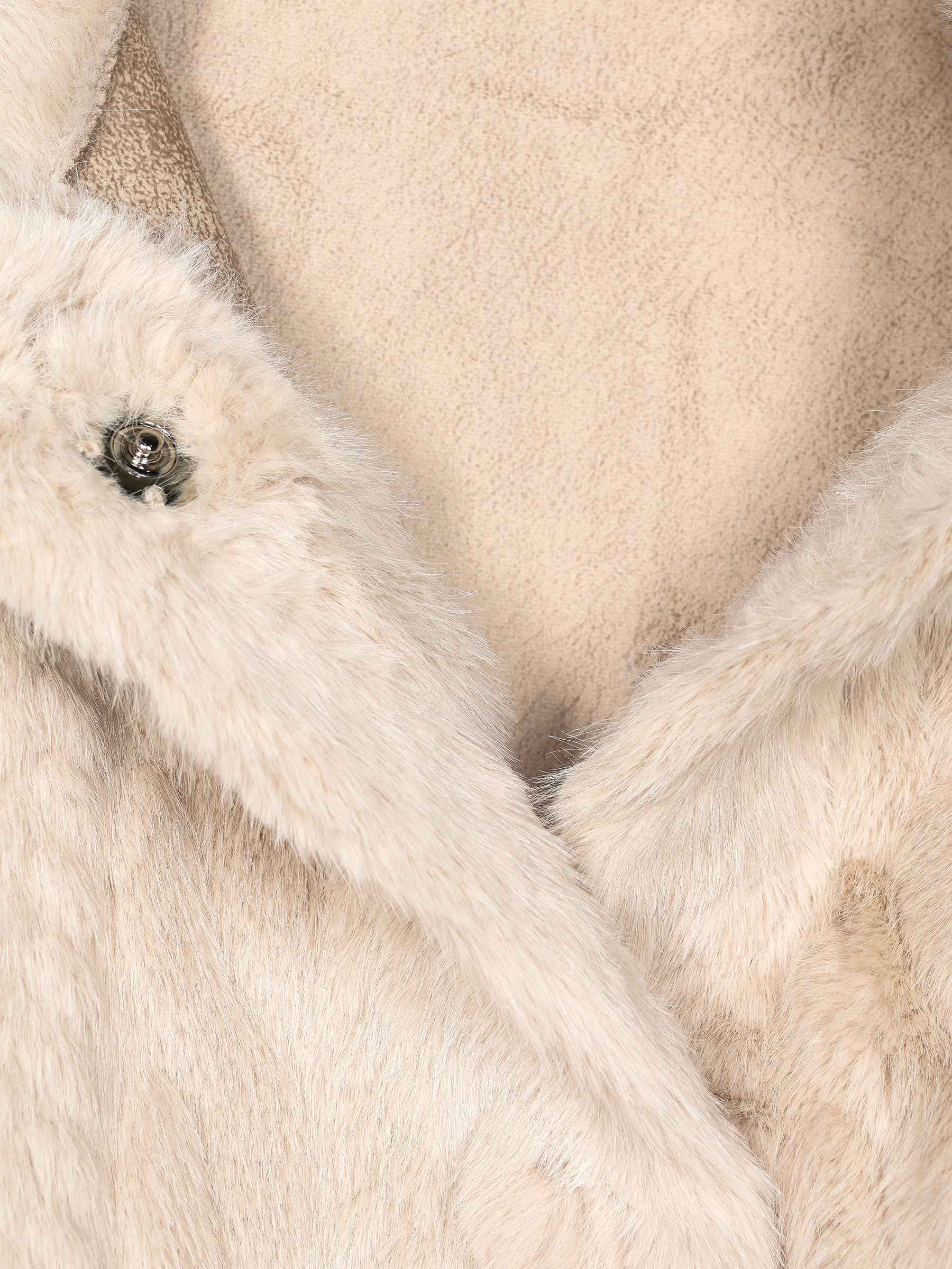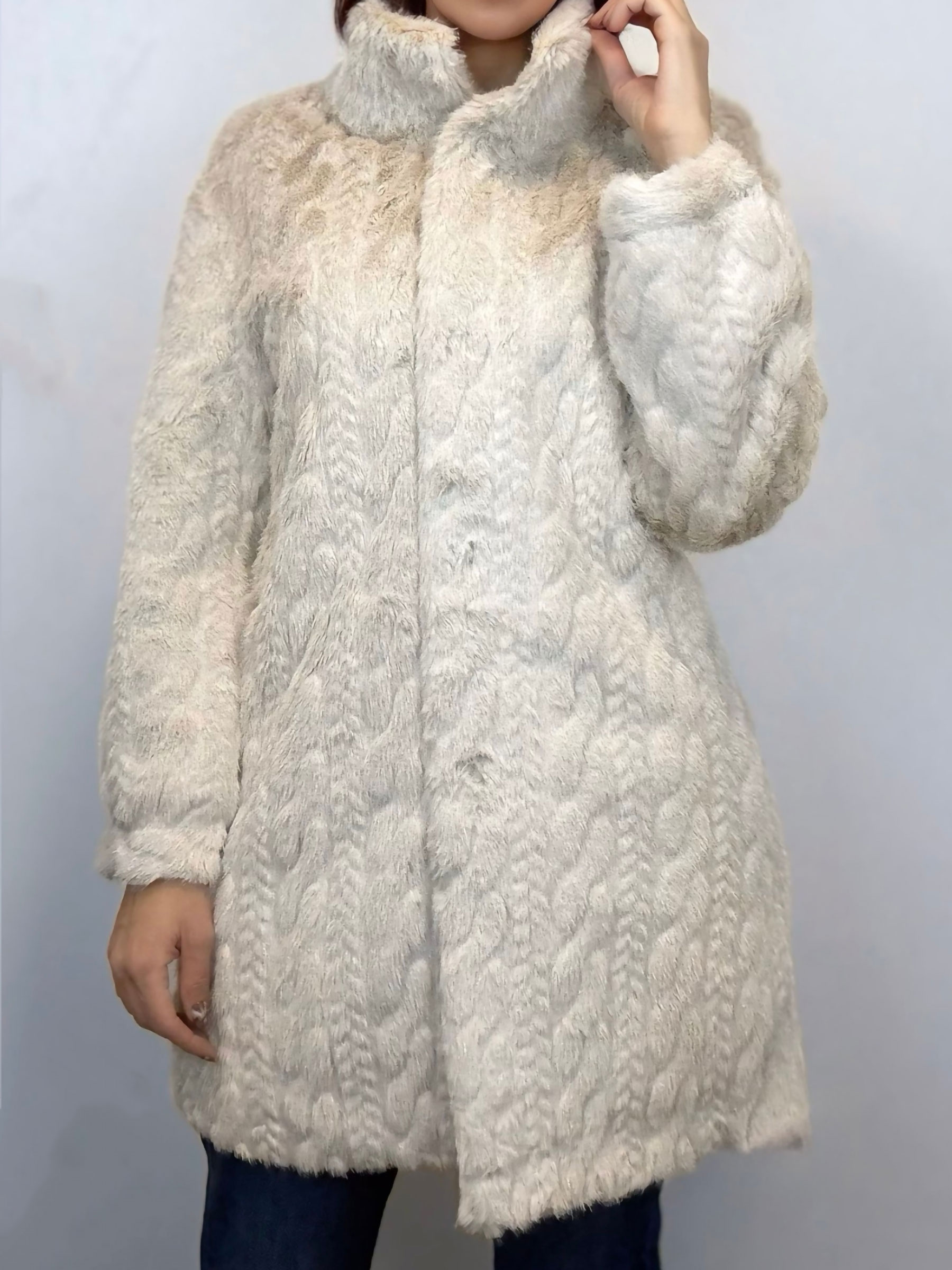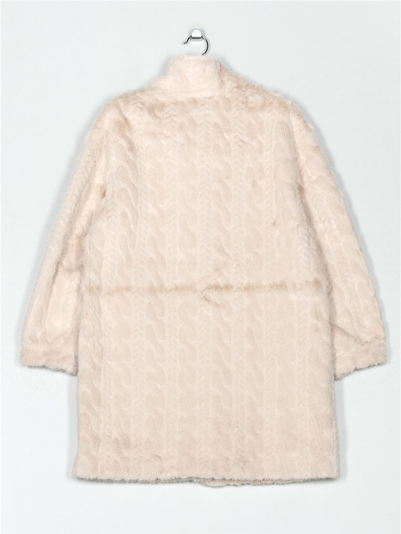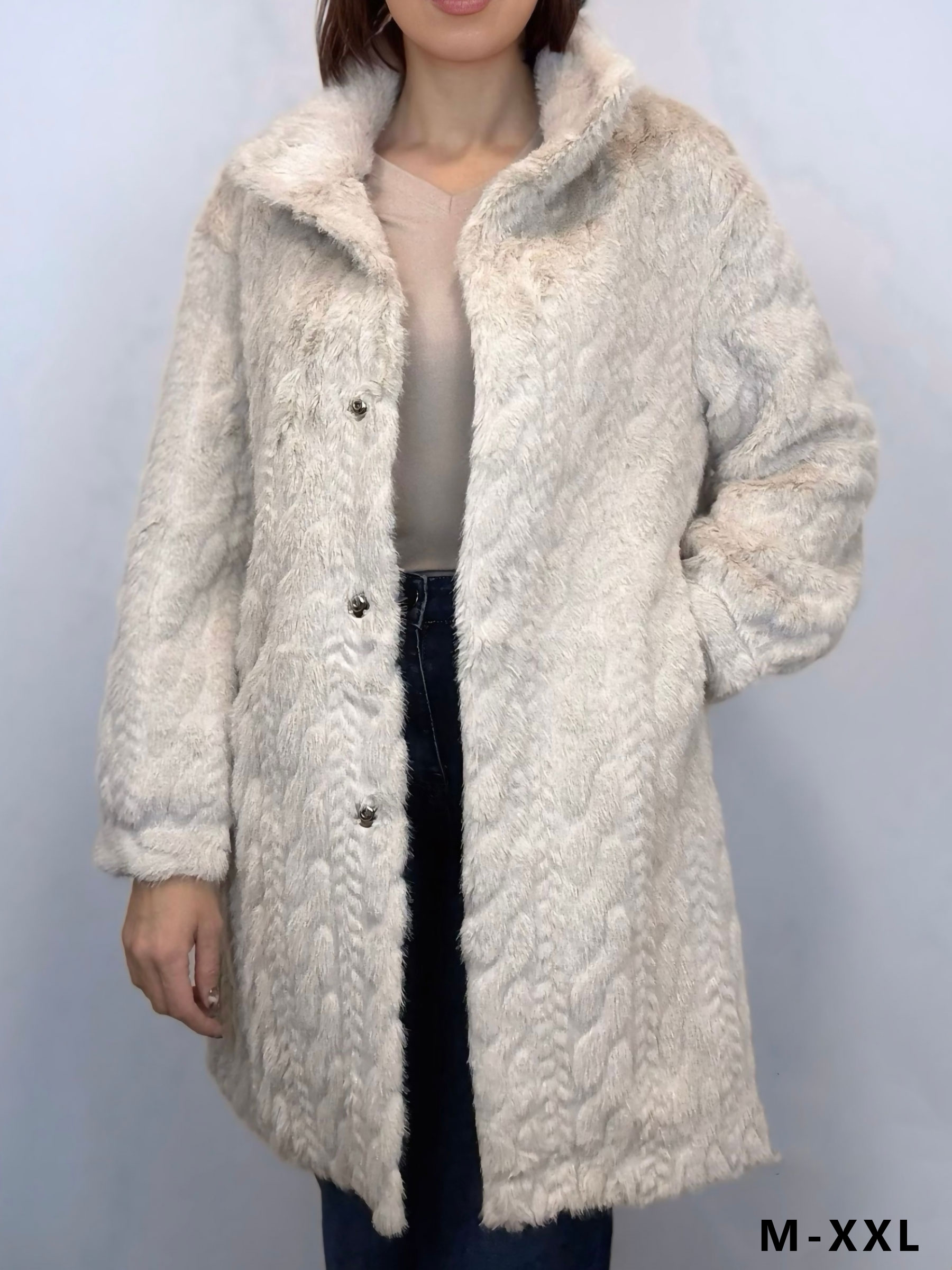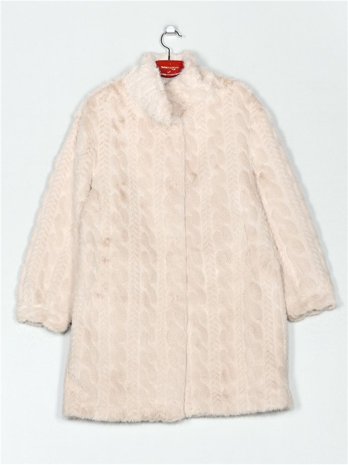 Abrigo amplio de pelo trenzado. Acabado interior efecto ante combinado a tono. Bolsillos laterales. Cuello subido. Manga larga. Cierre con botones de presión.