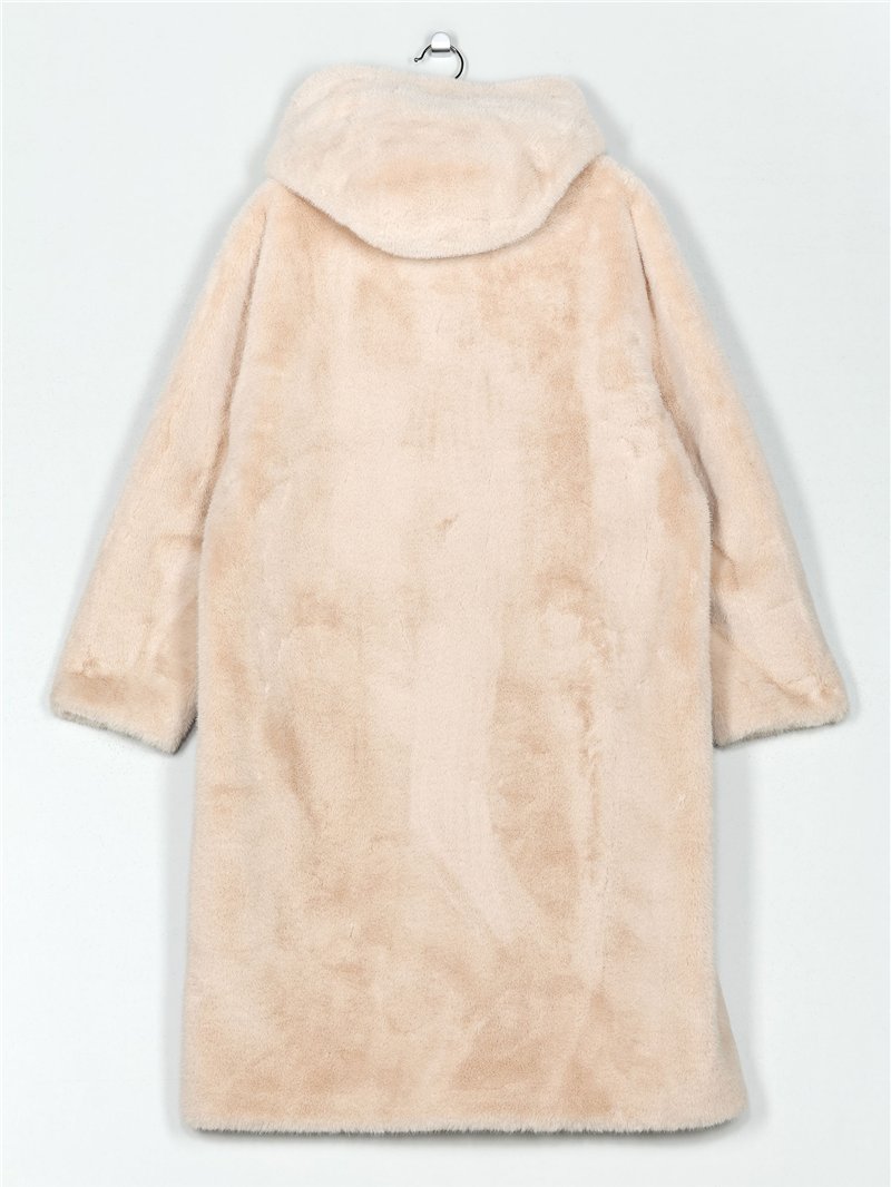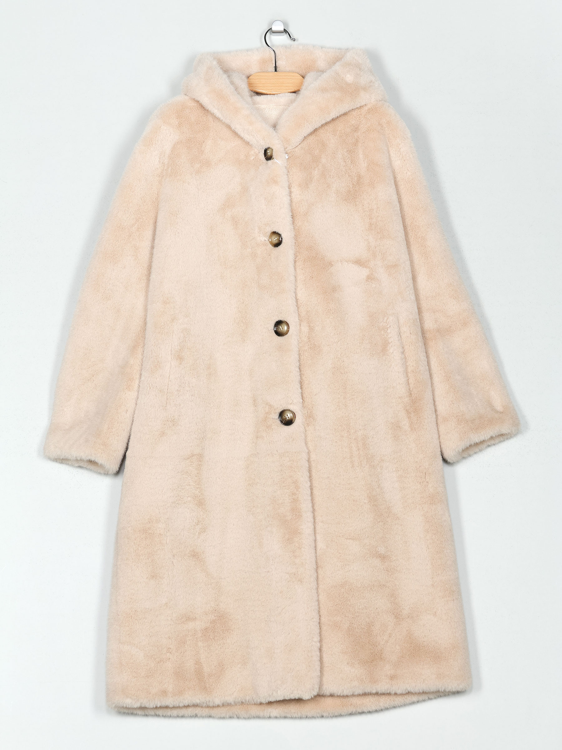 Abrigo largo de pelo con capucha. Acabado interior efecto ante combinado a tono. Bolsillos laterales. Cuello subido. Manga larga. Cierre con botones de presión.