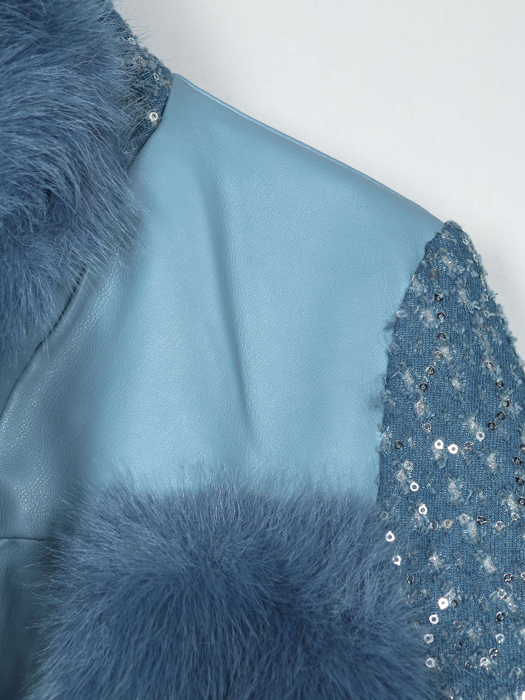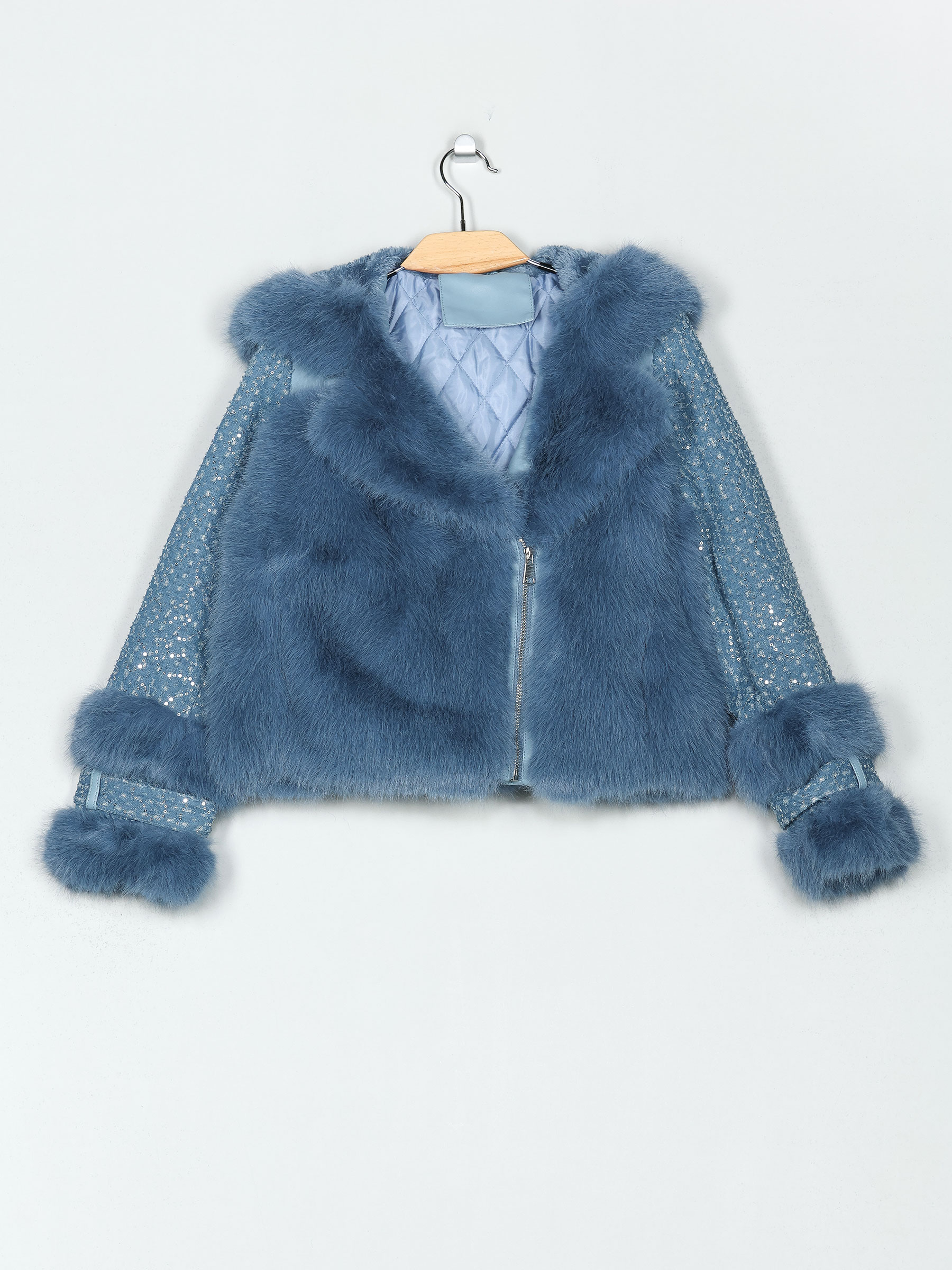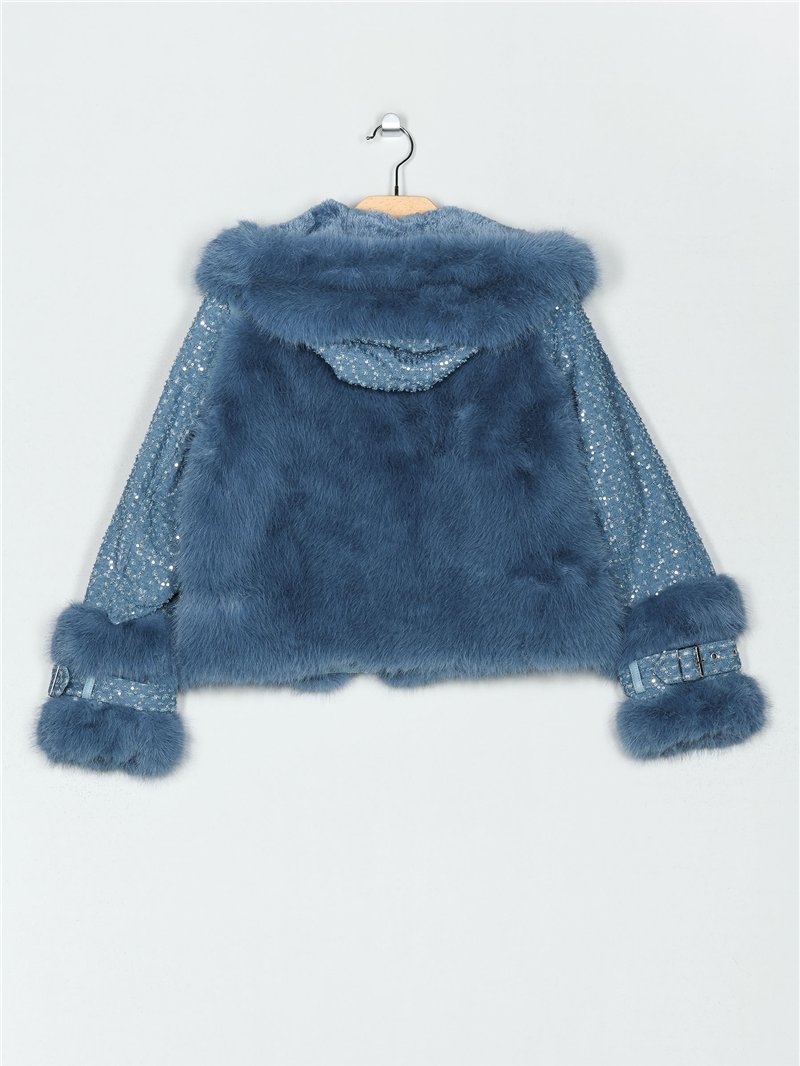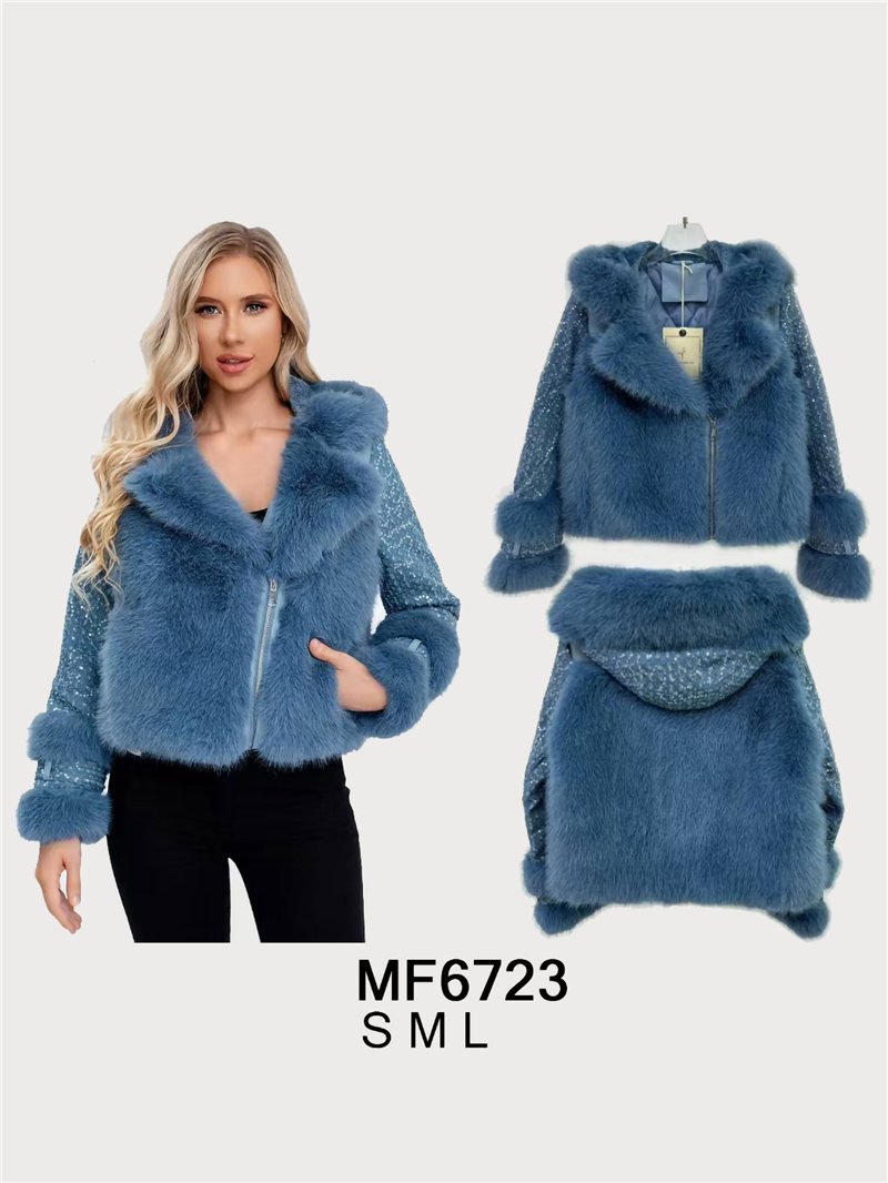 Detalles de chaqueta biker acolchada pelo y lentejuelas con capucha MF-MF6723-1-BLUE