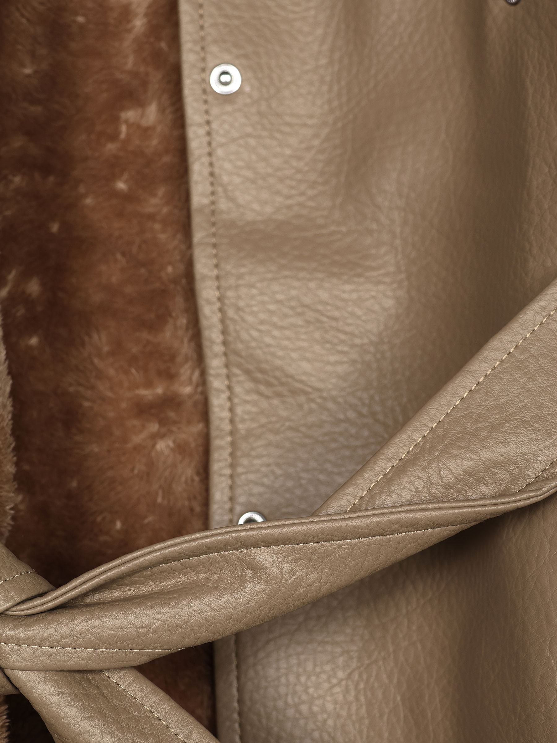 Abrigo largo con cinturón. Efecto piel. Acabado interior efecto pelo combinado a tono. Cuello solapa con pelo extraíble. Manga larga. Doble botonadura frontal con botones de presión.