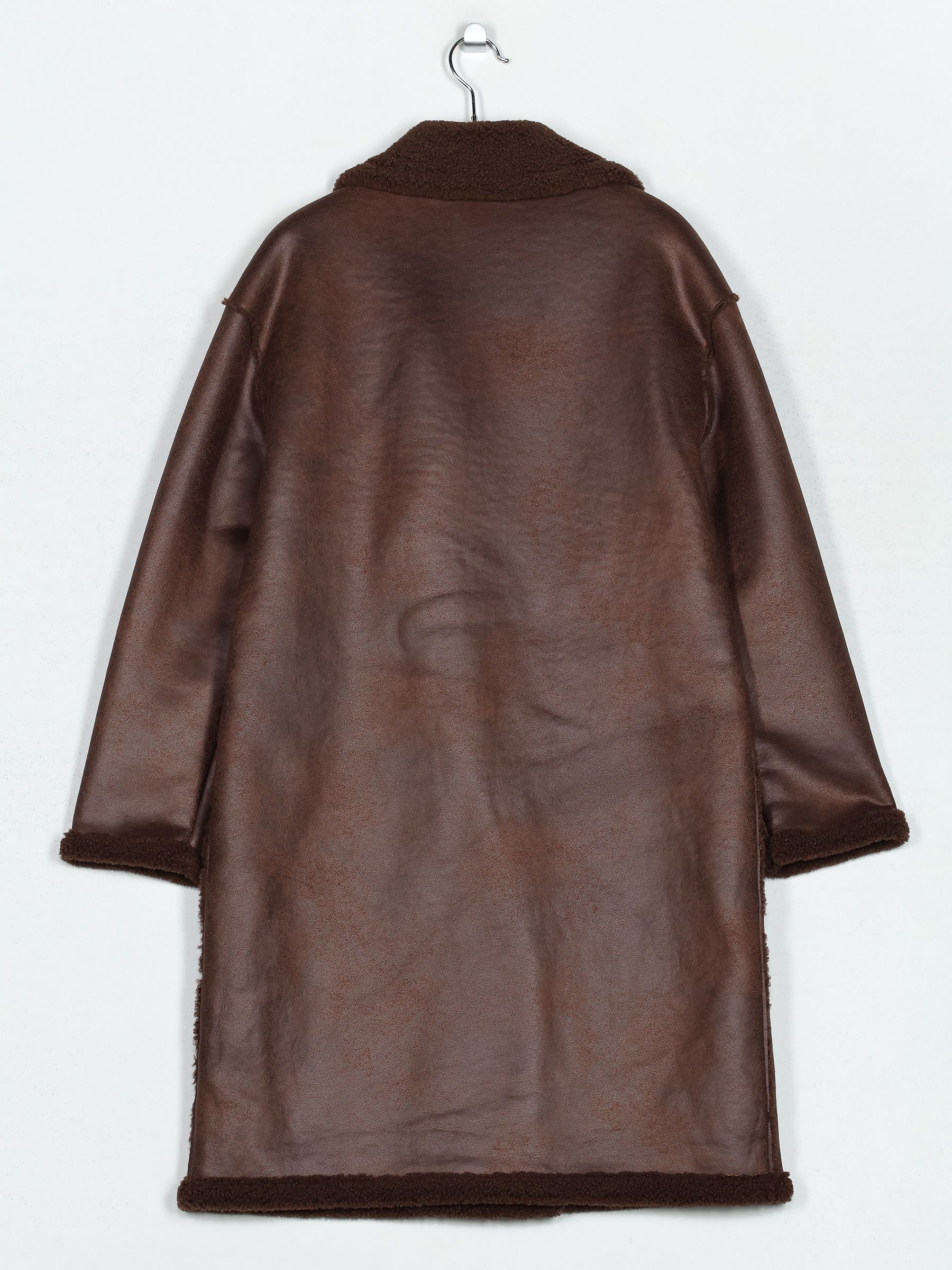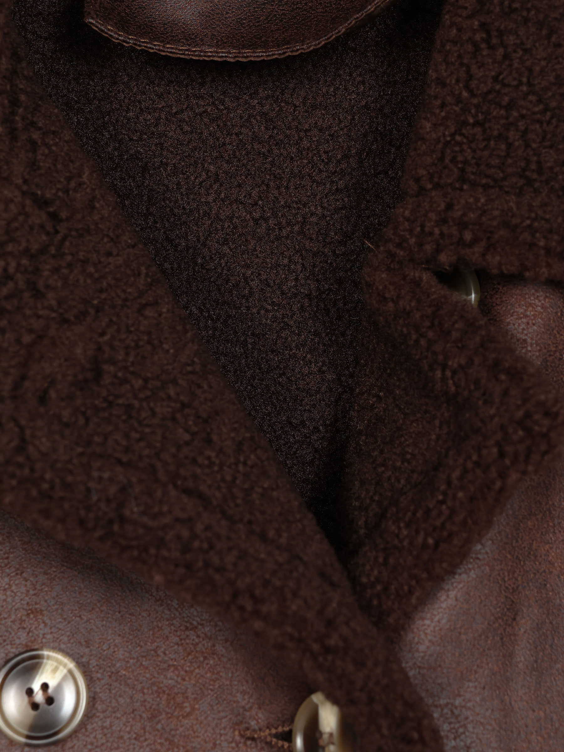 Abrigo largo efecto ante. Acabado interior efecto borrego combinado a tono. Dos bolsillos de parche. Cuello solapa. Manga larga. Cierre mediante doble botonadura frontal.