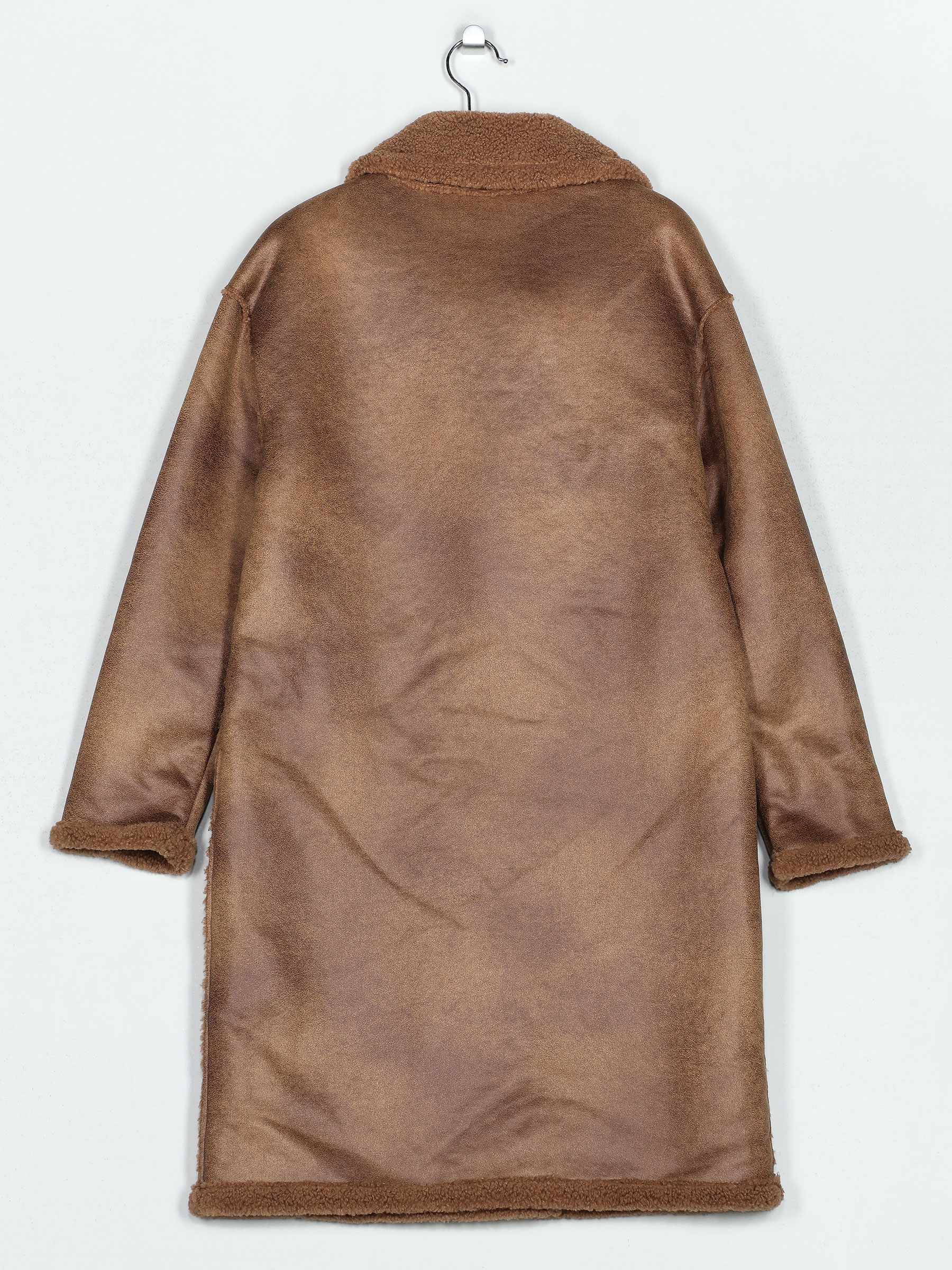 Abrigo largo efecto ante. Acabado interior efecto borrego combinado a tono. Dos bolsillos de parche. Cuello solapa. Manga larga. Cierre mediante doble botonadura frontal.