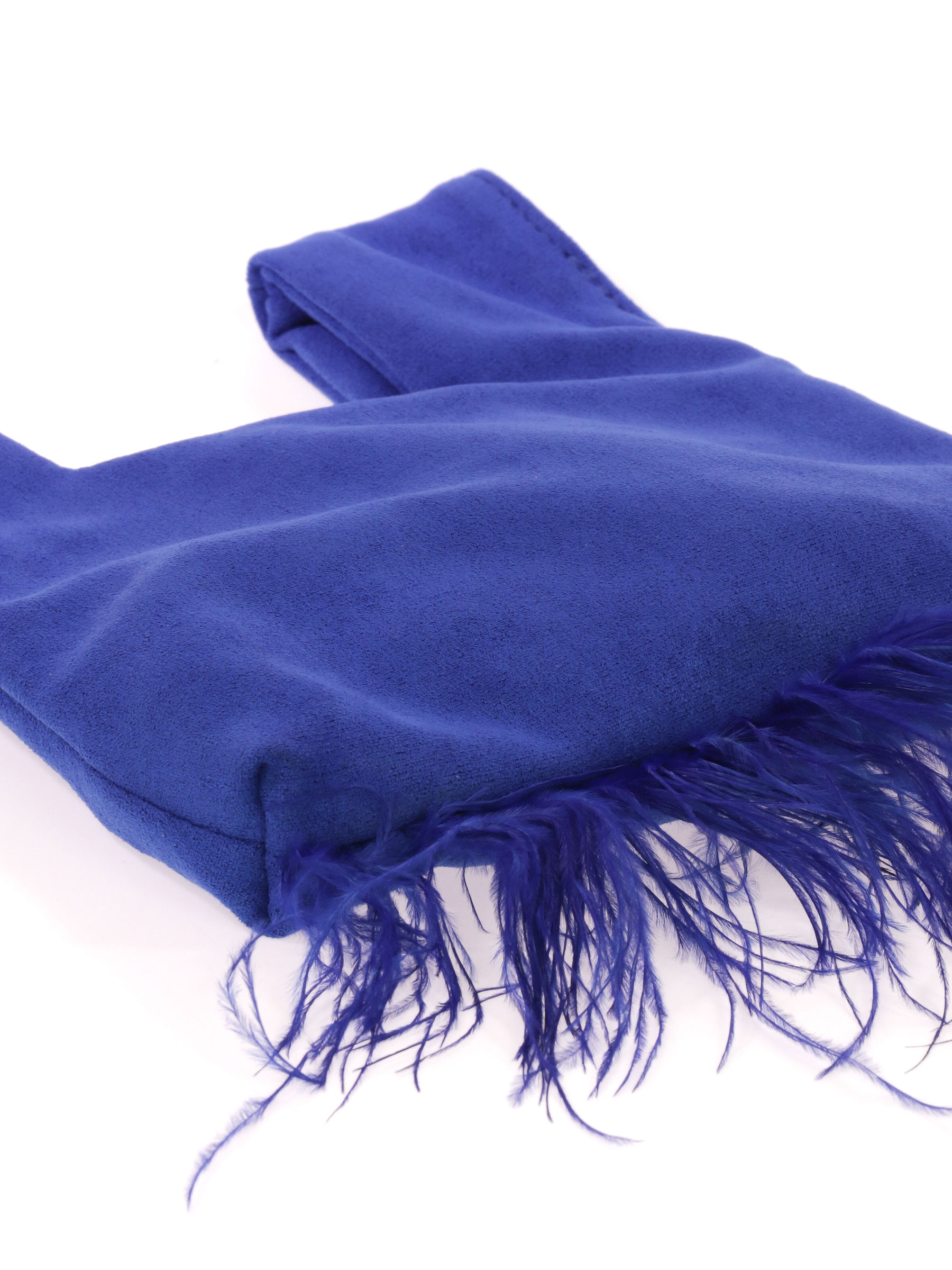 Bolso de fiesta. Efecto ante. Detalle plumas. Forro interior. Cierre sin cierre.
