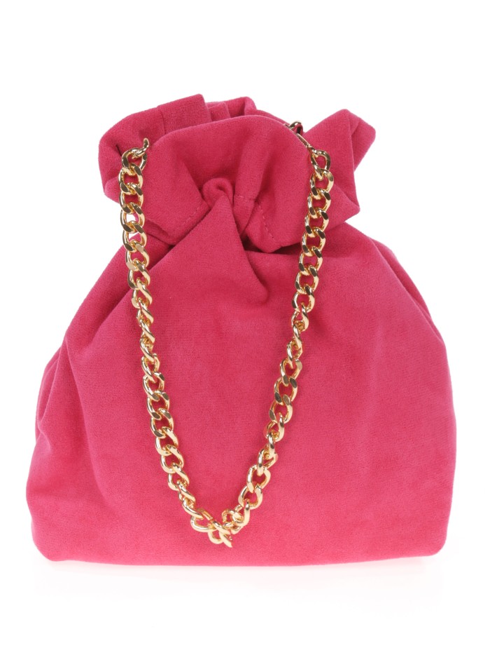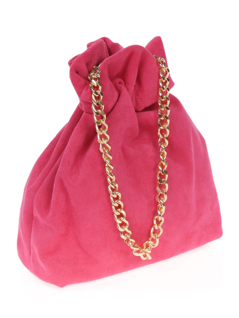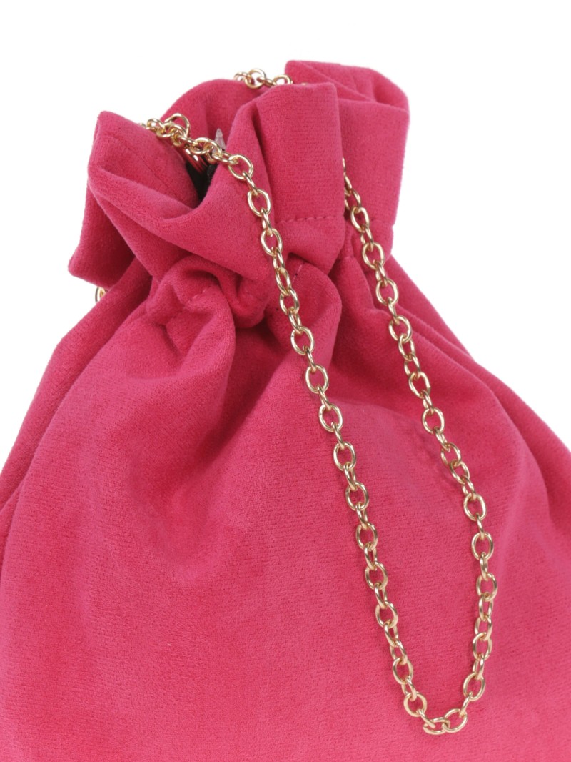 Bolso de fiesta. Efecto ante. Asa de mano y asa de hombro en cadena. Forro con bolsillo interior. Cierre mediante fruncido.