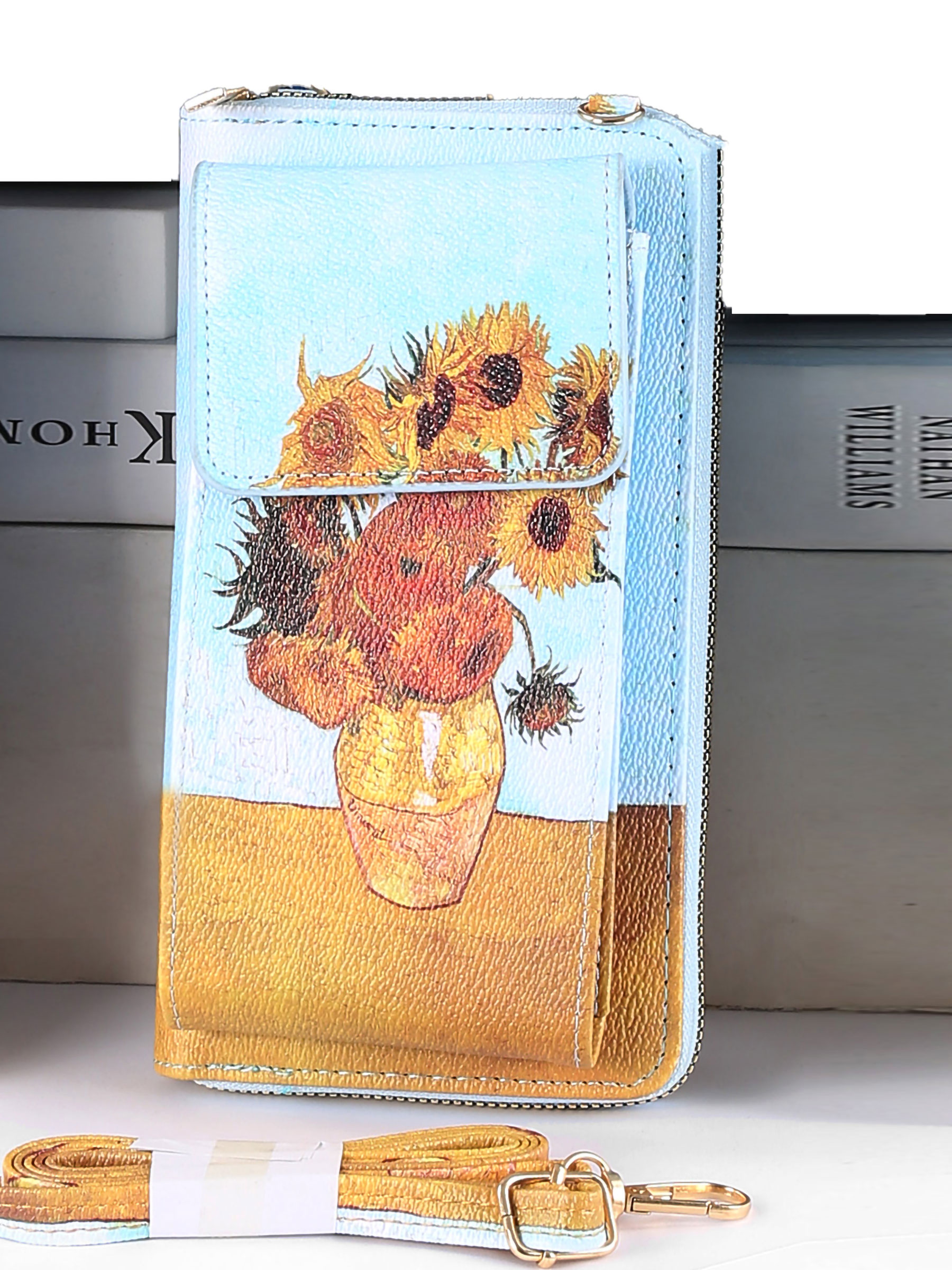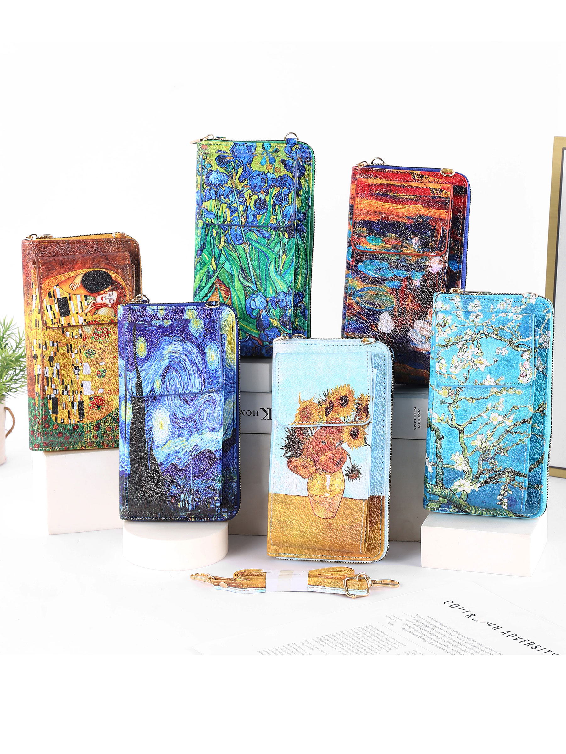 Porta móvil. Estampado de cuadros famosos. Material polipiel. Asa de hombro ajustable y extraíble. Cierre mediante cremallera metálica. Colores surtidos.
