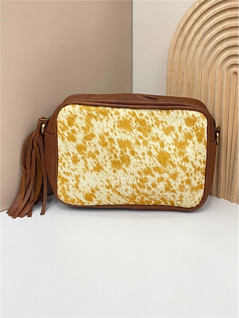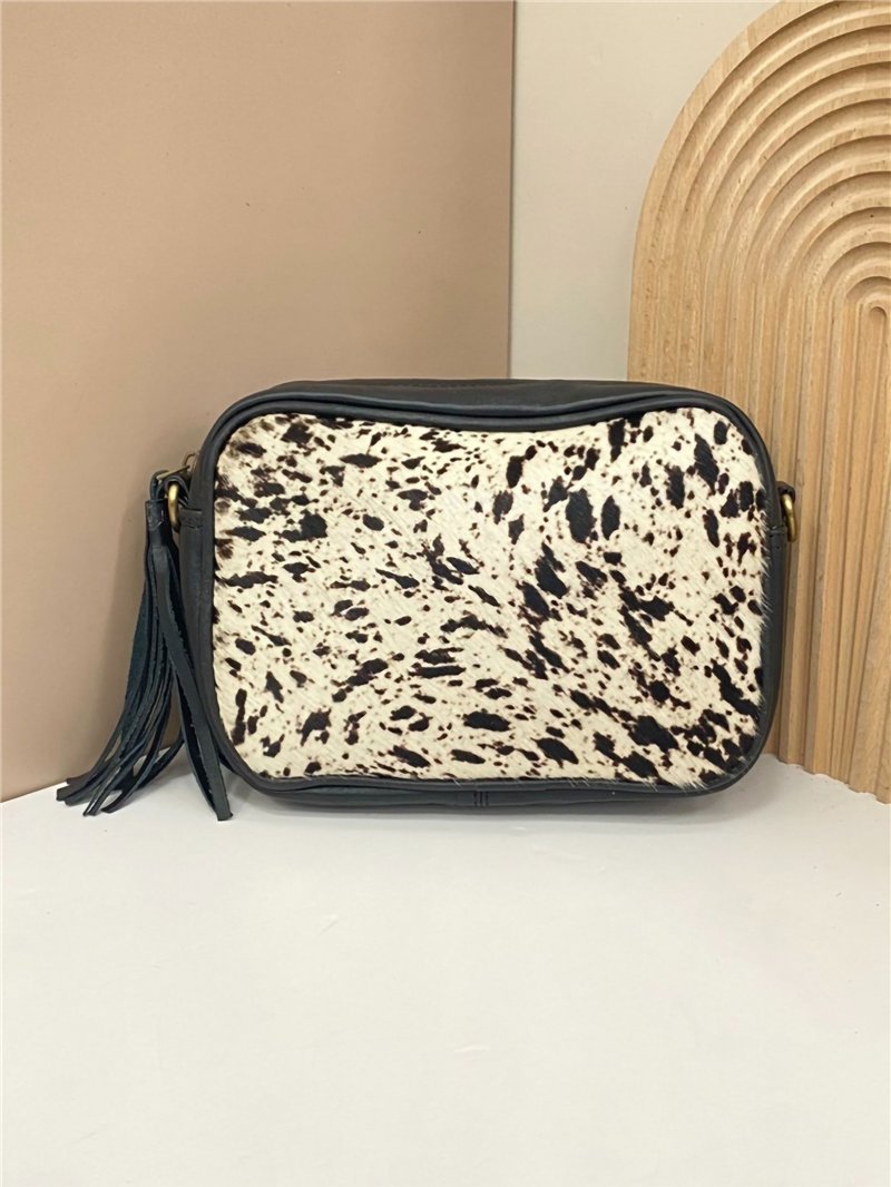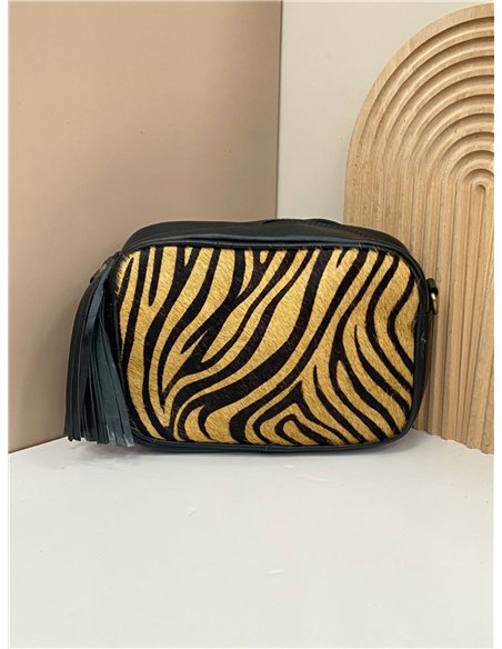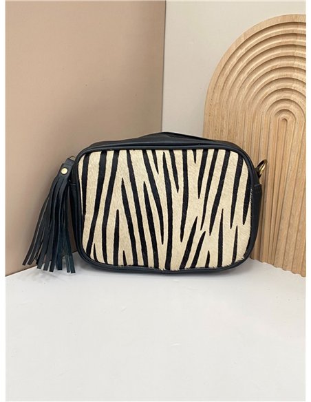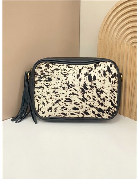 Bolso bandolera de piel con pelo. Detalle borlas. Bolsillo trasero con cremallera. Asa de hombro ajustable. Cierre con cremallera.