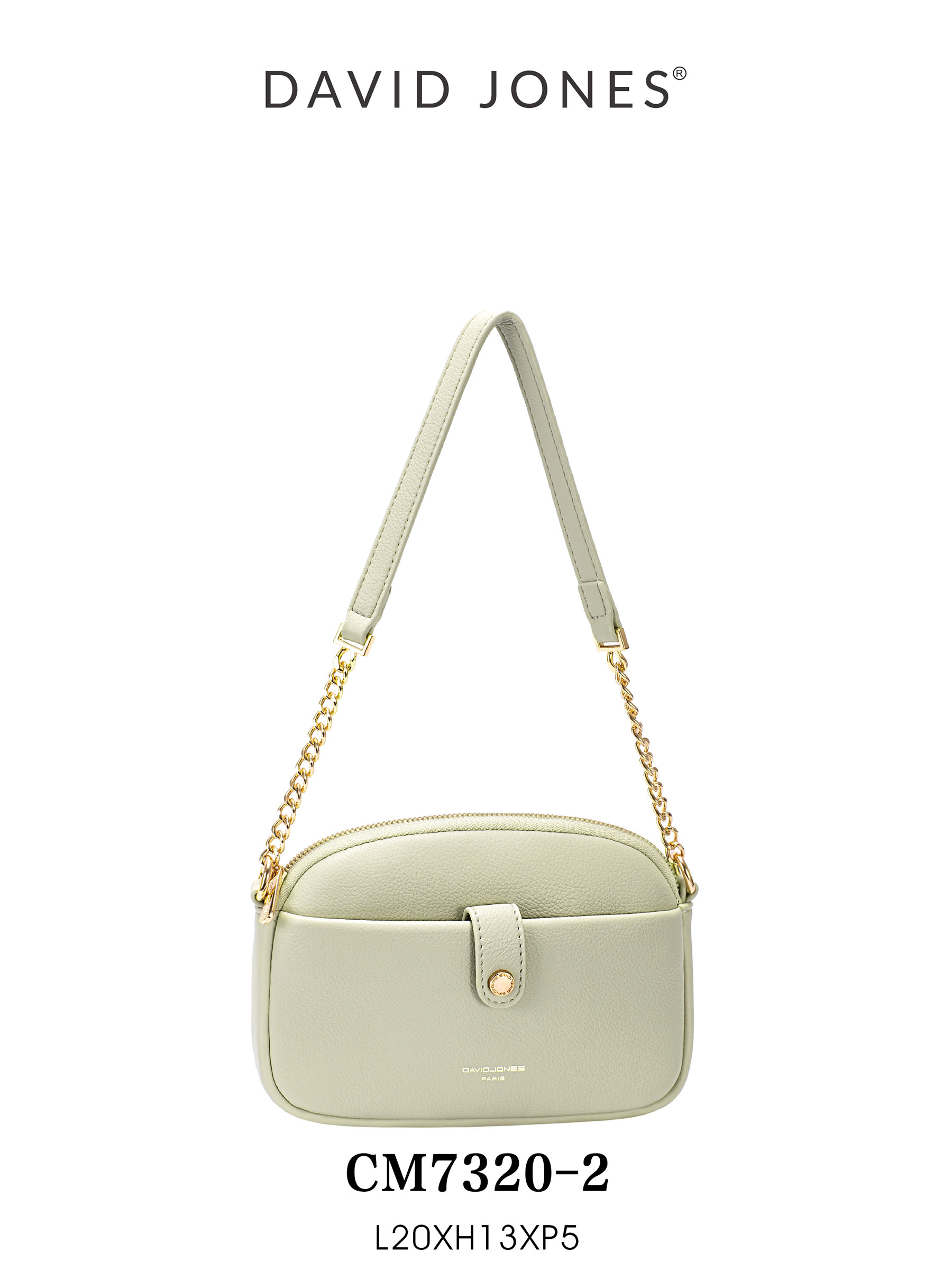 Detalles de DJ-CM7320-2 bolso bandolera con detalle de cadena y bolsillo frontal.