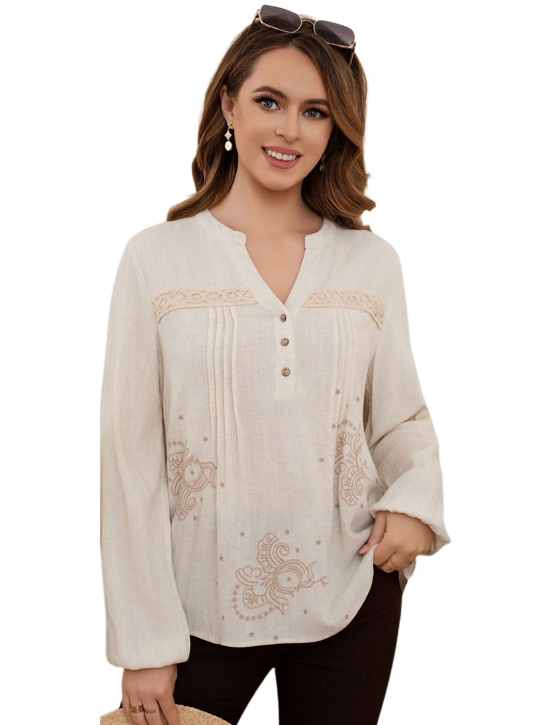 Blusa bordada de efecto lino. Encaje en el pecho. Escote pico. Botones frontales. Manga larga.