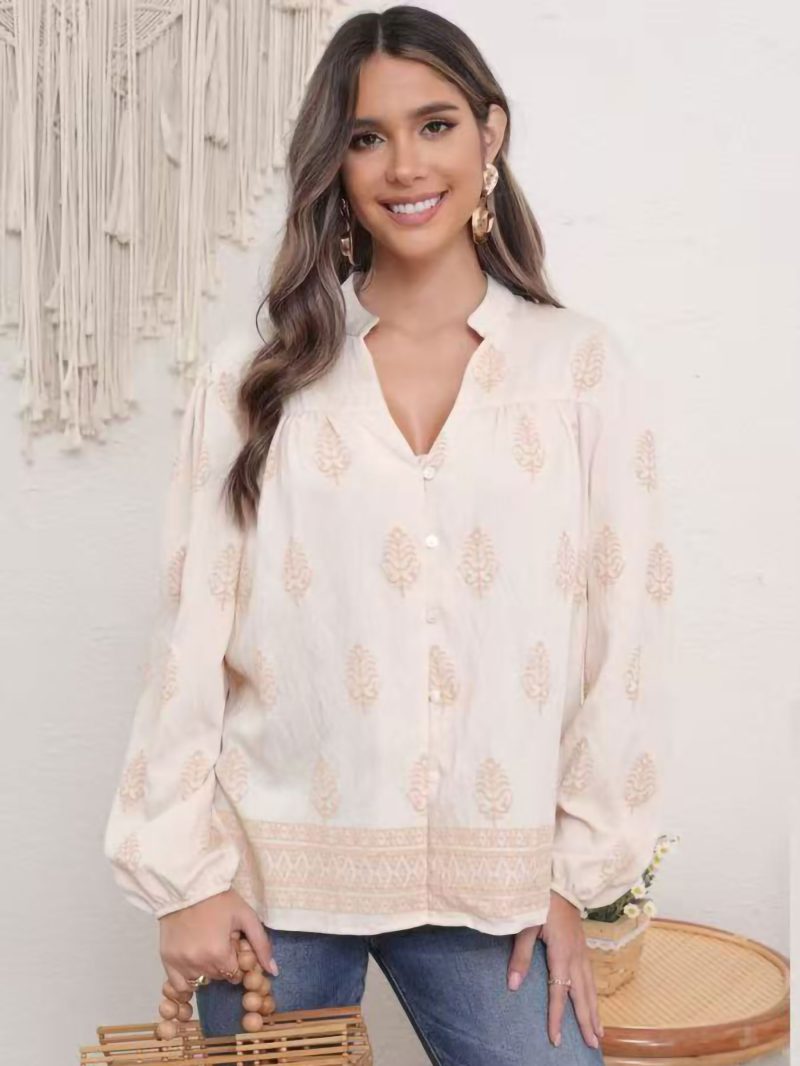Blusa estampada. Escote en v. Manga larga. Puño elástico. Cierre con botones.