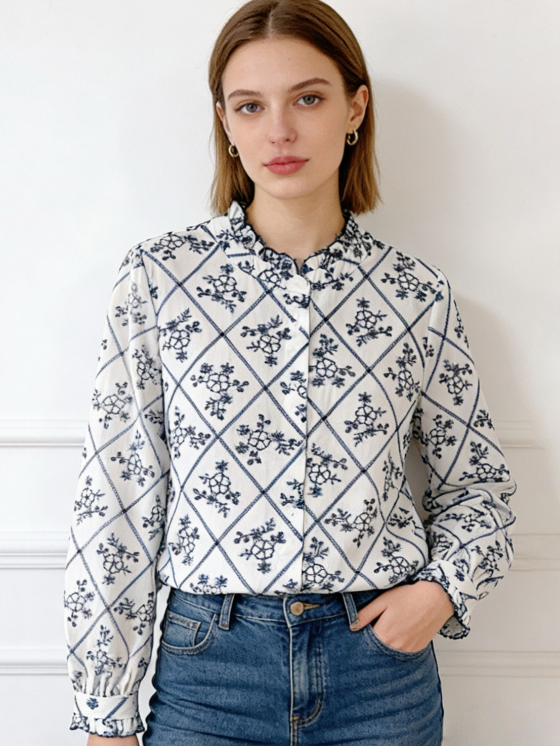 Blusa con cuello fruncido y estampado de rombos con motivo floral. Cierre de botones y manga larga con puño.