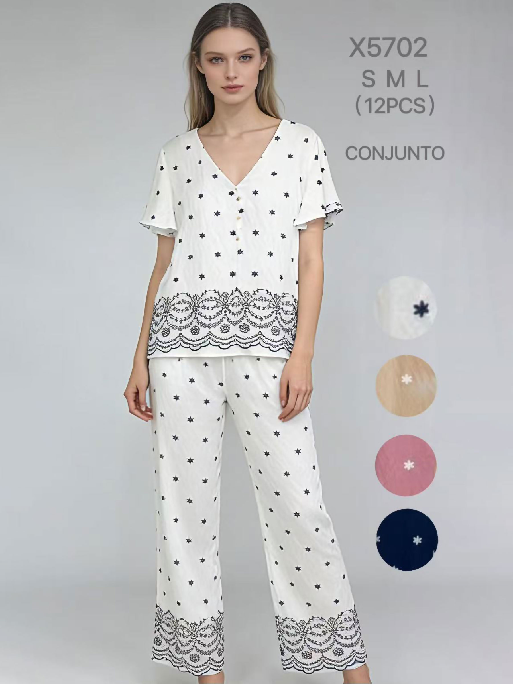 Conjunto de dos piezas. Blusa estampada. Manga corta acampanada. Escote pico. Detalle de botones en el delantero. Pantalón largo. Pierna recta. Cintura elástica.