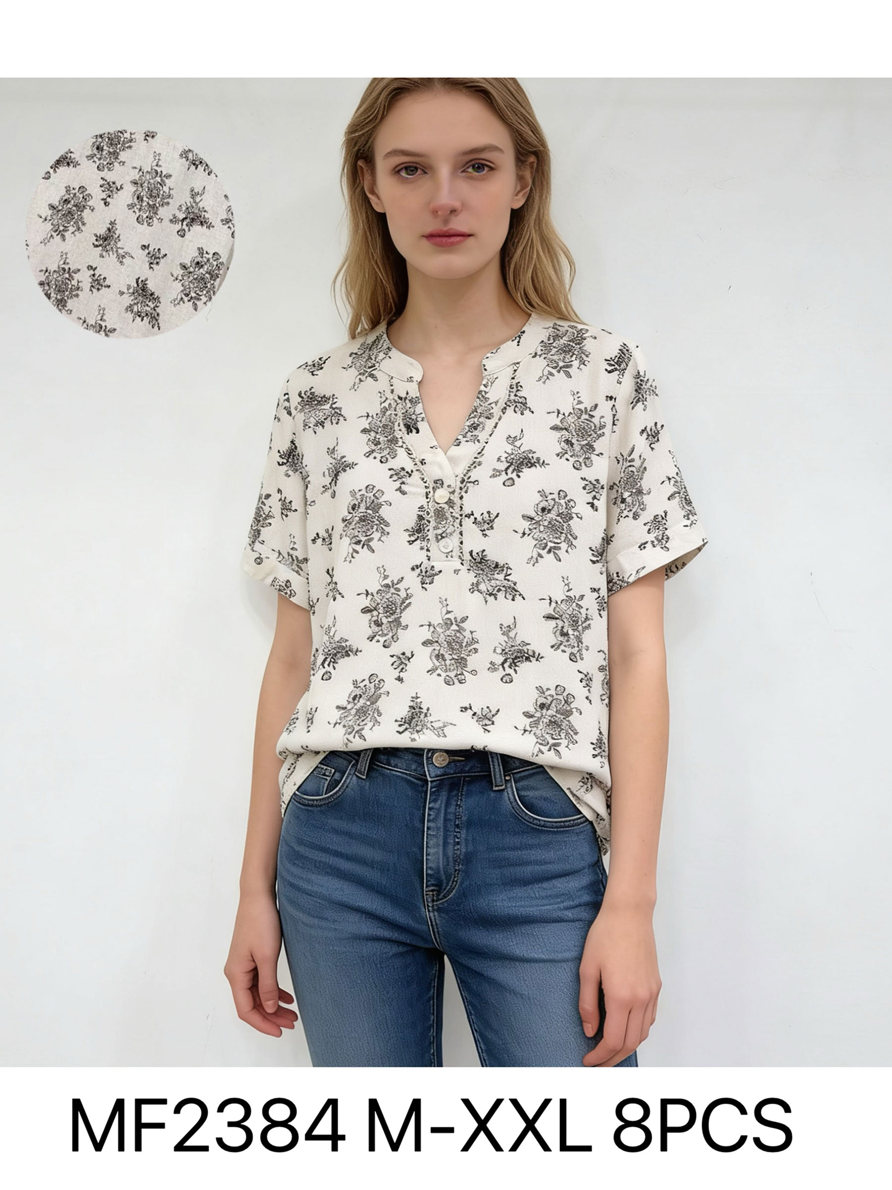 Blusa estampada floral. Cuello pico con botones. Manga corta.