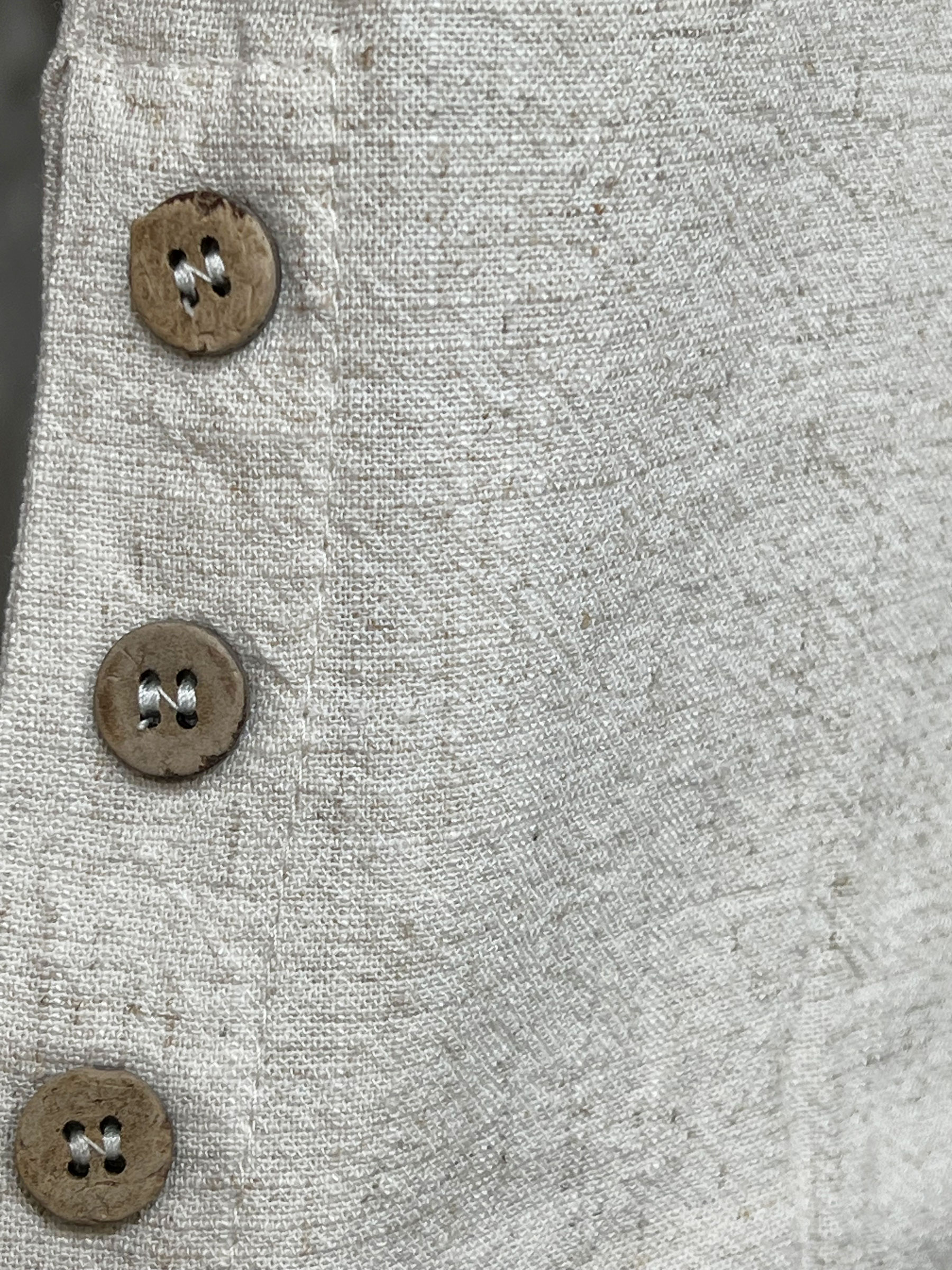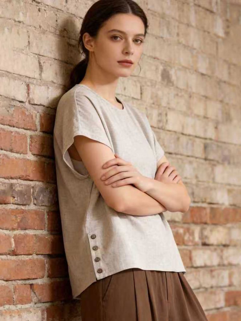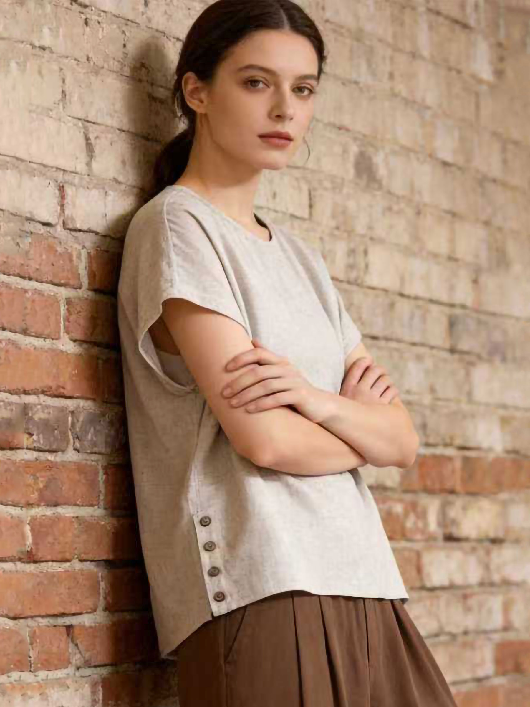Blusa tejido efecto lino con cuello redondo y manga corta. Detalle de botones laterales en el bajo.