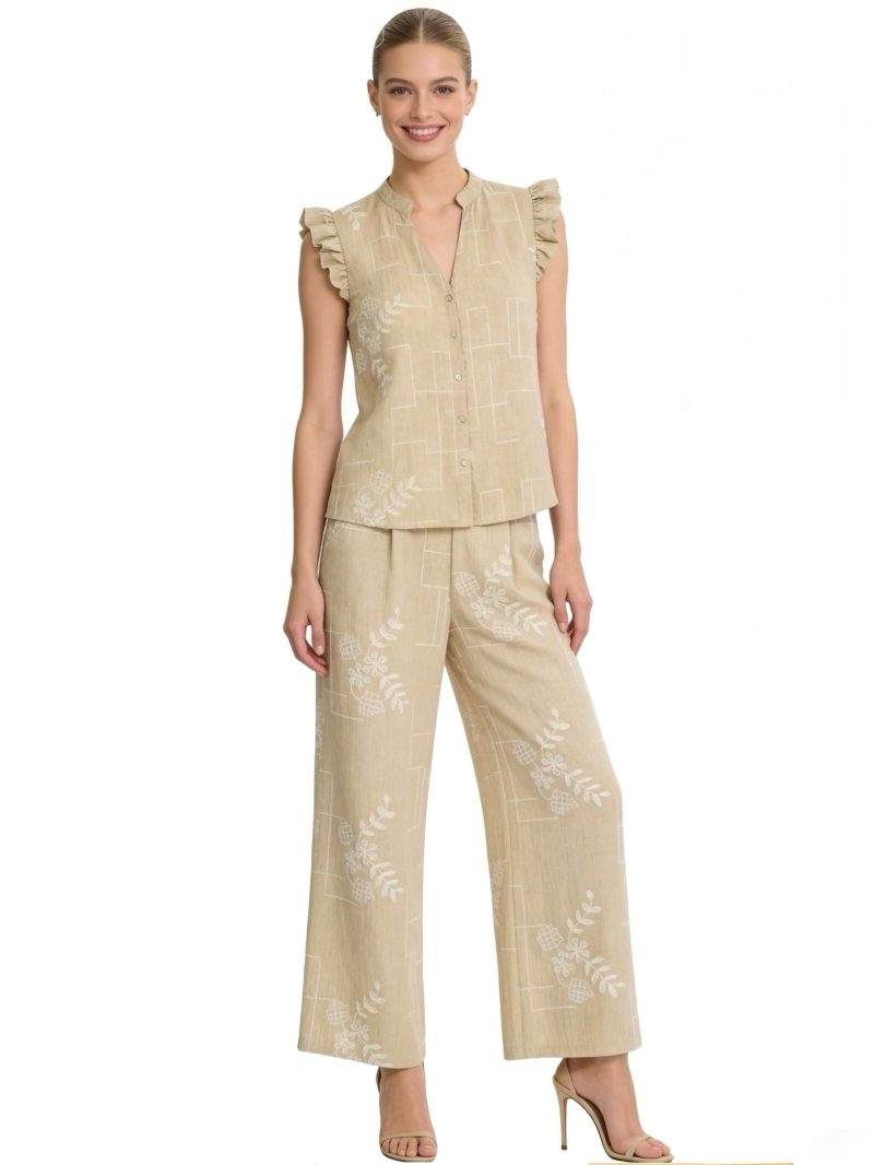 Conjunto efecto lino: Blusa estampada con strass + Pantalón