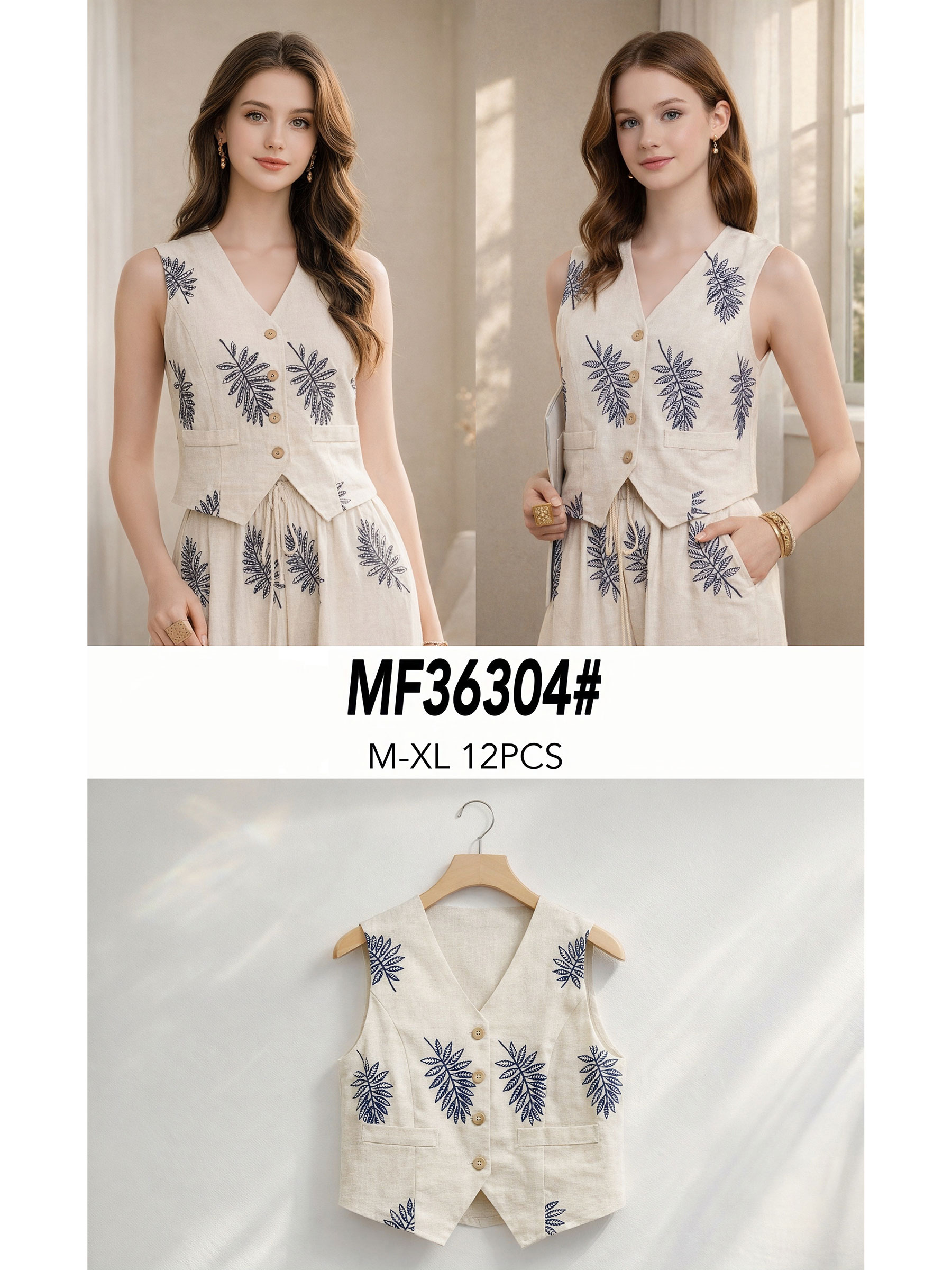 Nuevo Mín. 6 Blusas Conjunto efecto lino bordado: blusa con escote pico y pantalón DB-X5750 Tallas: M-L-XL.Colección: Primavera/Verano 2026. Ver precio