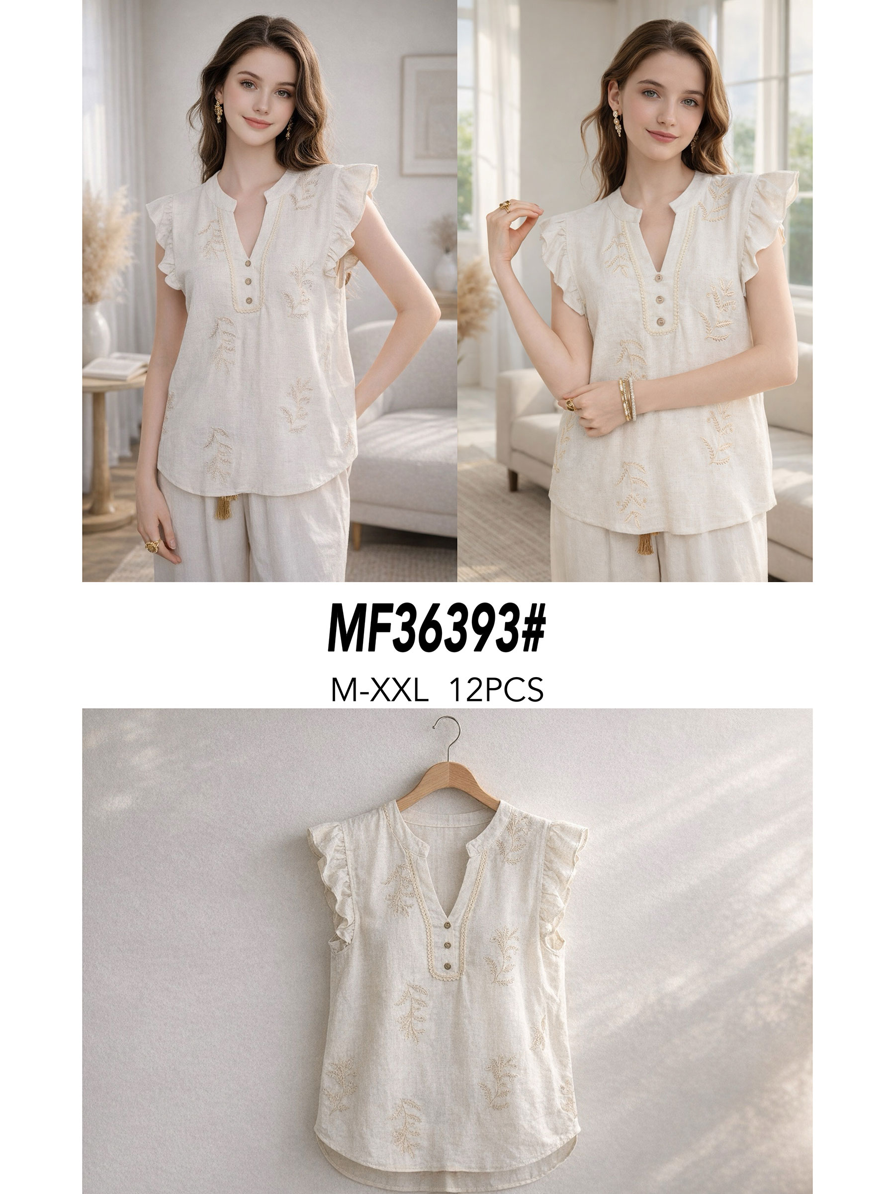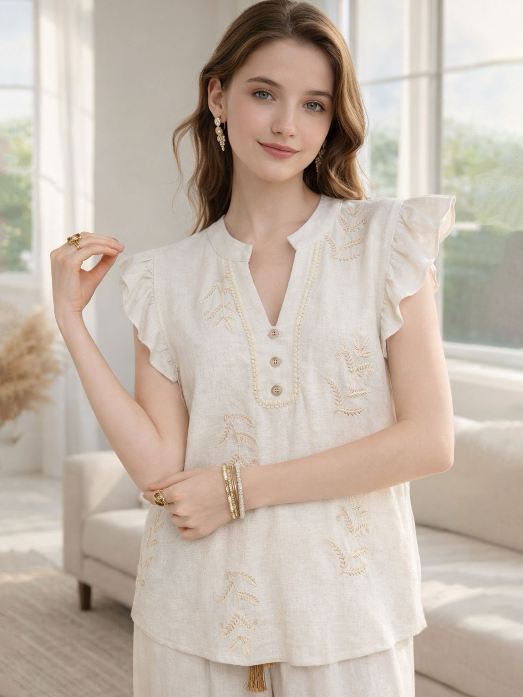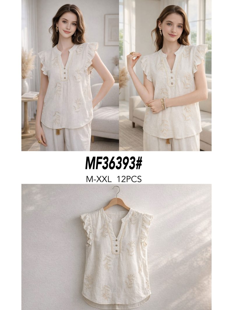 Blusa lino con bordado volante en hombros