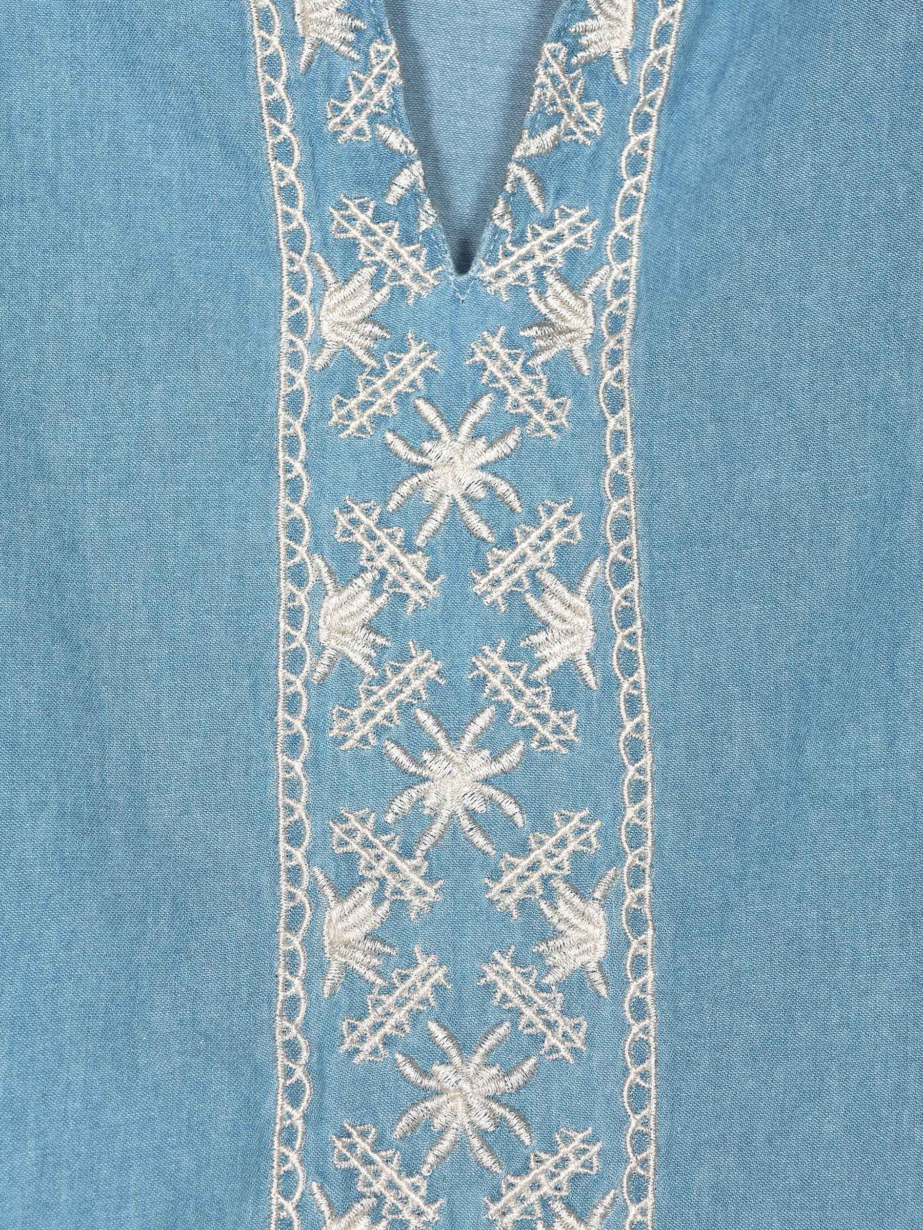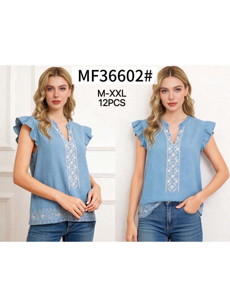 Blusa símil denim bordado y volantes