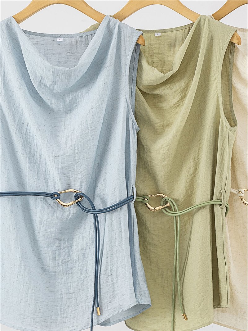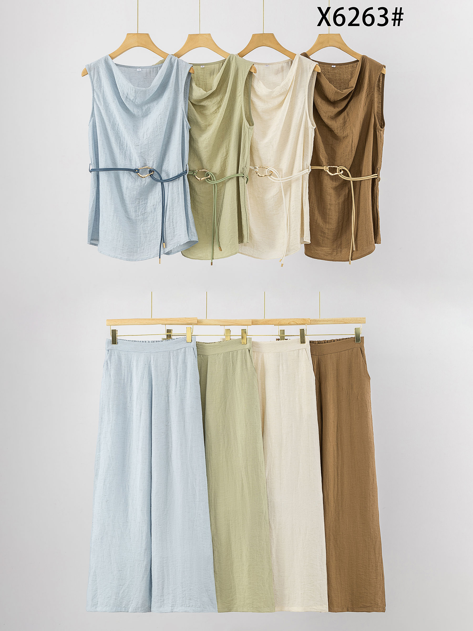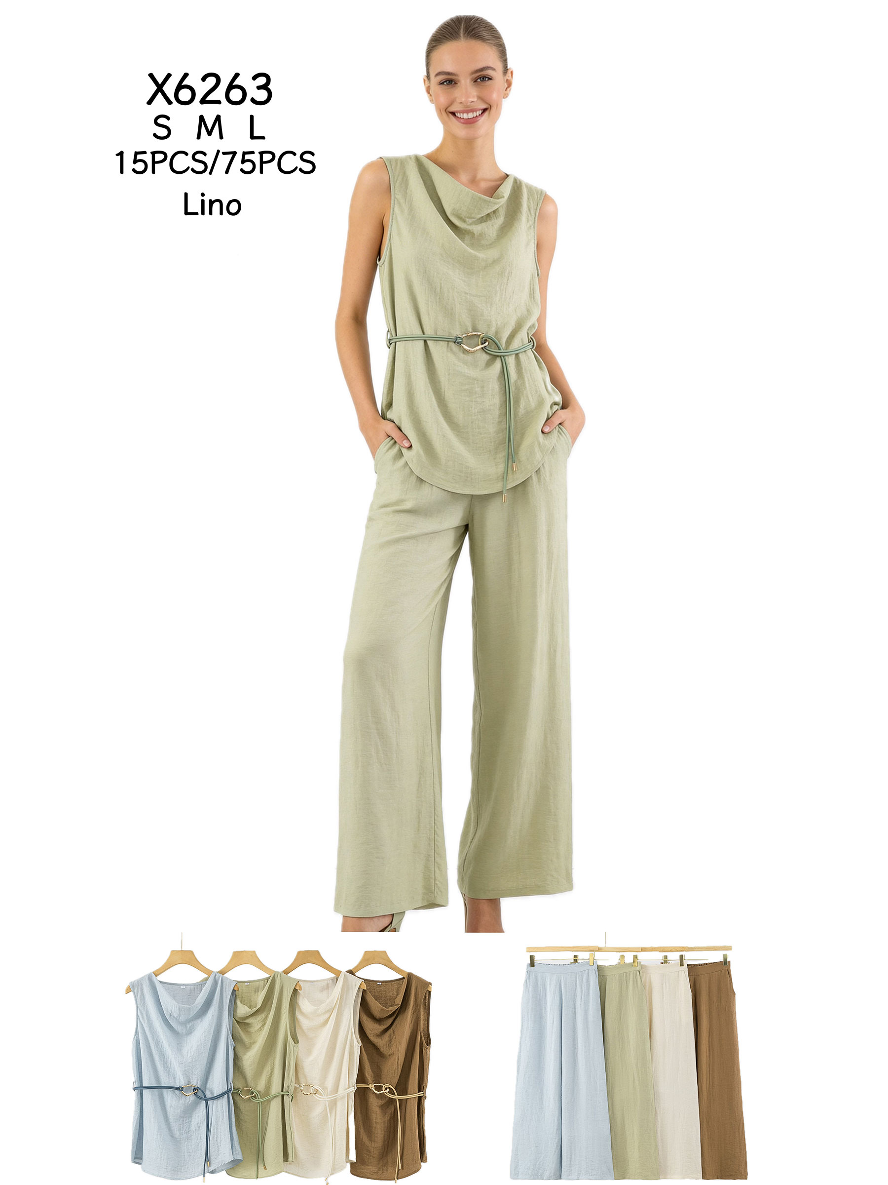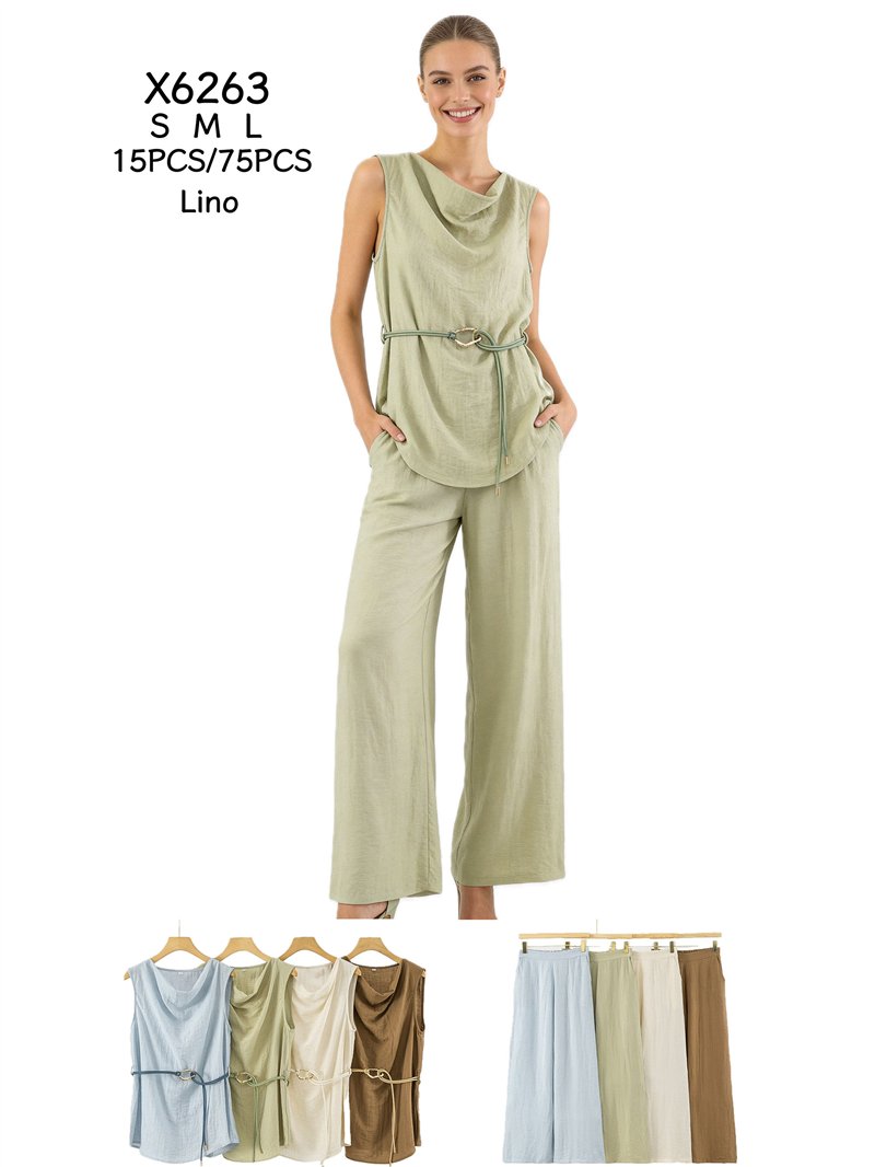Conjunto de lino top drapeado con cinturón y pantalón ancho