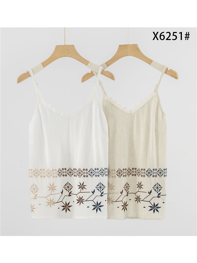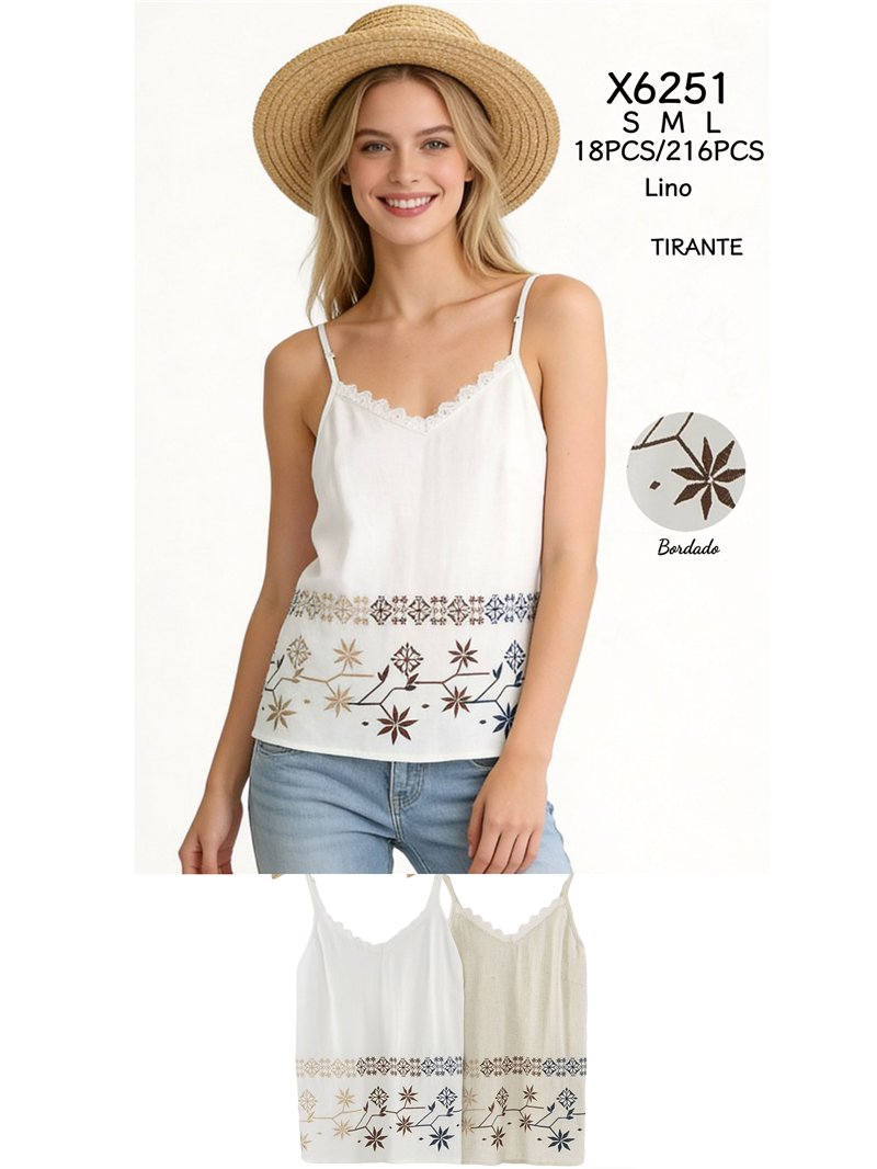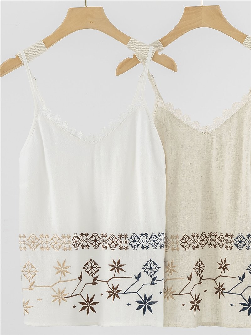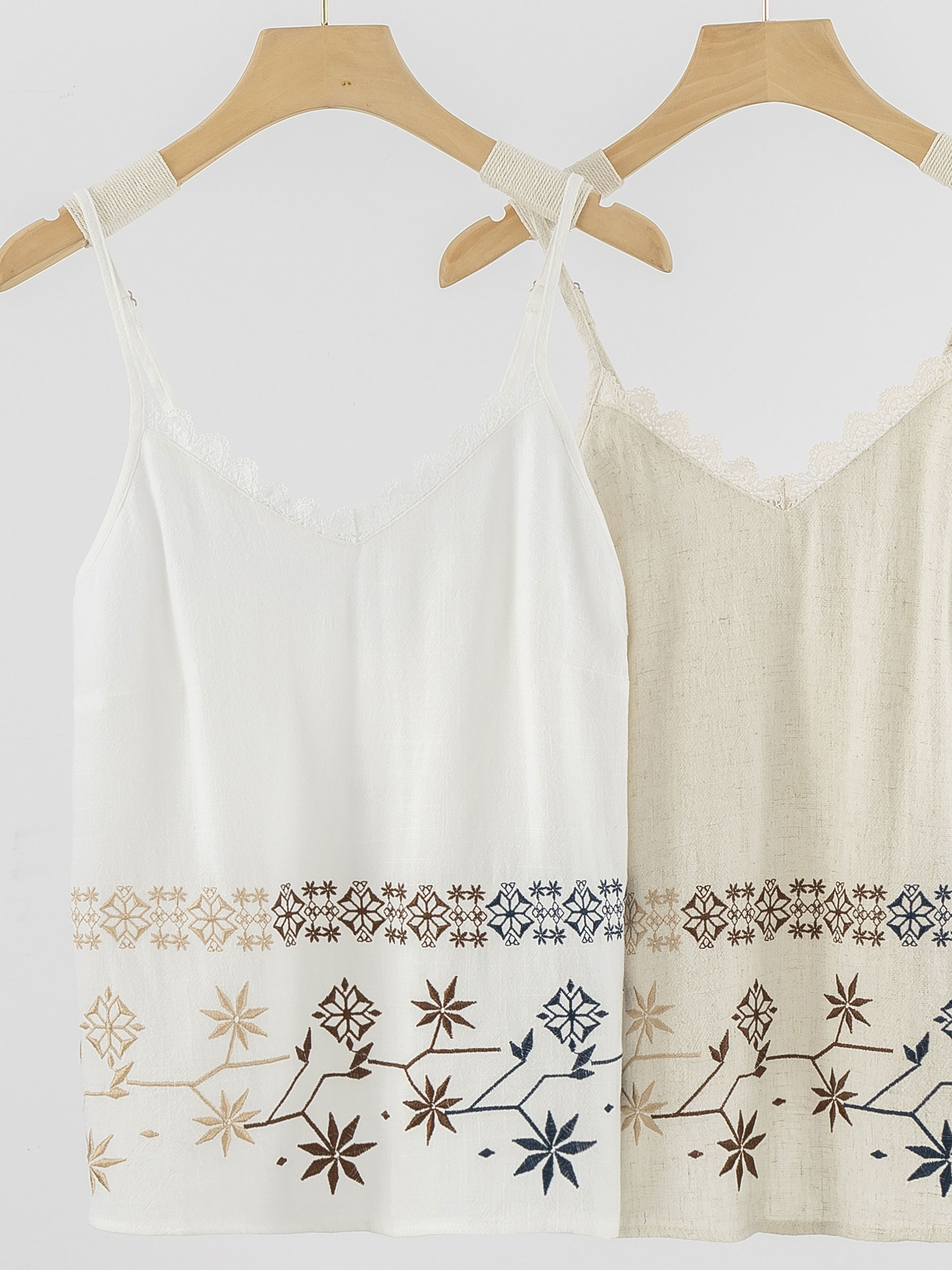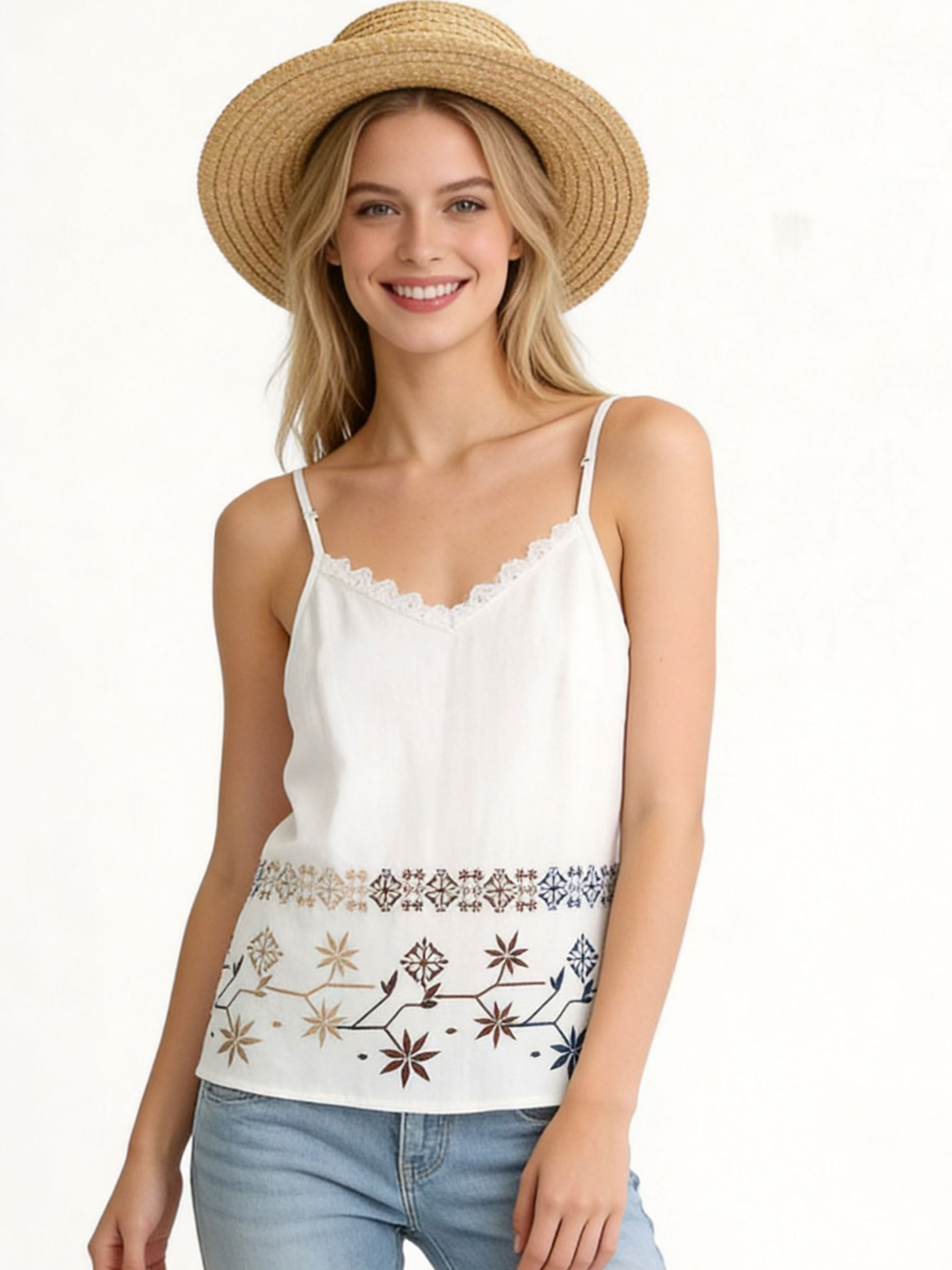 Top de tirantes con bordado geométrico multicolor y puntillas