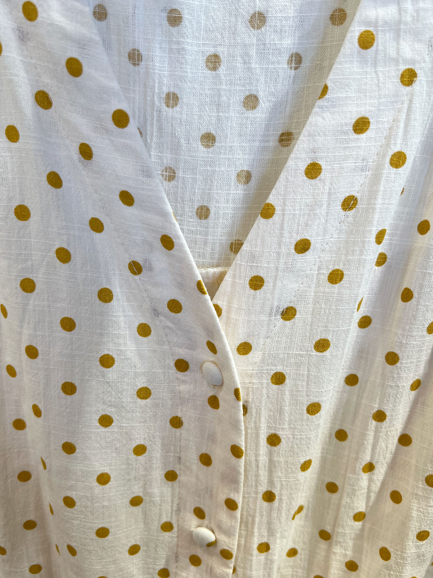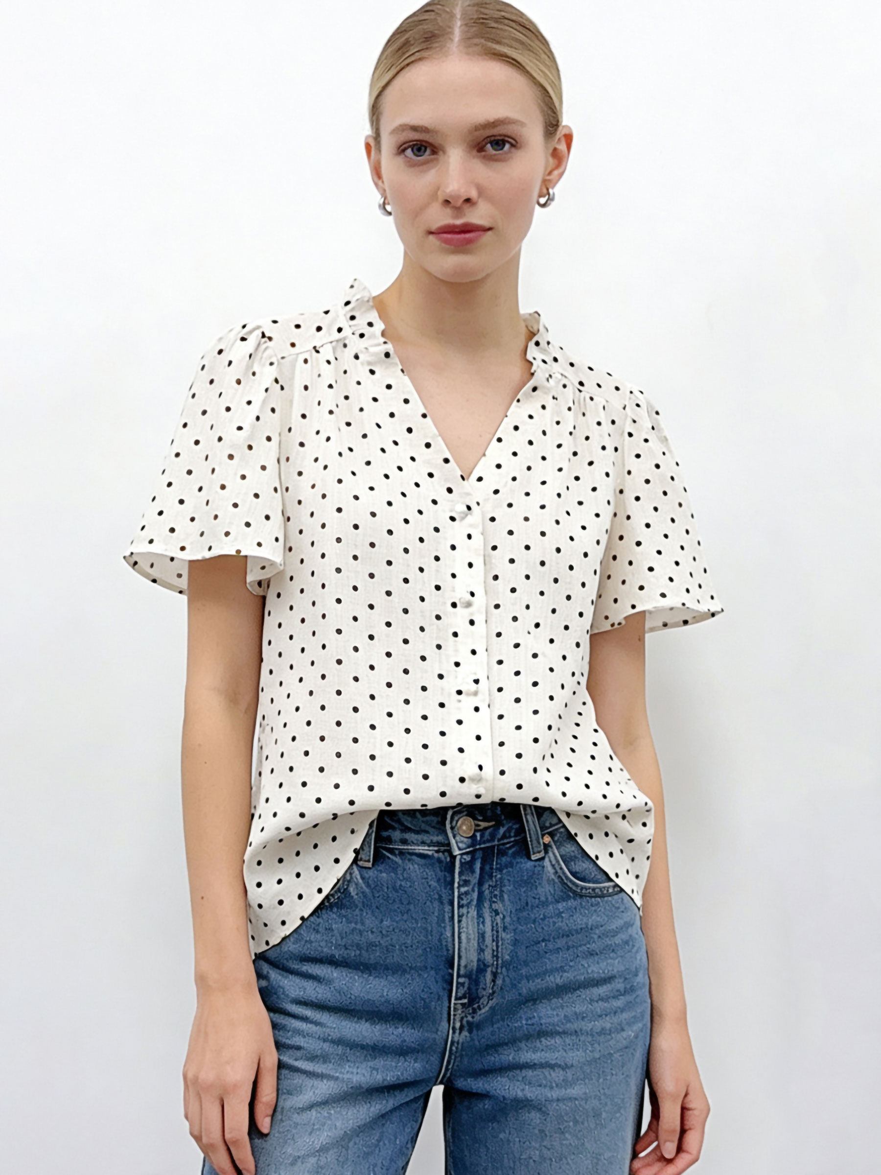 Blusa de lunares. Cuello pico con volante. Manga corta amplia. Cierre mediante botones.