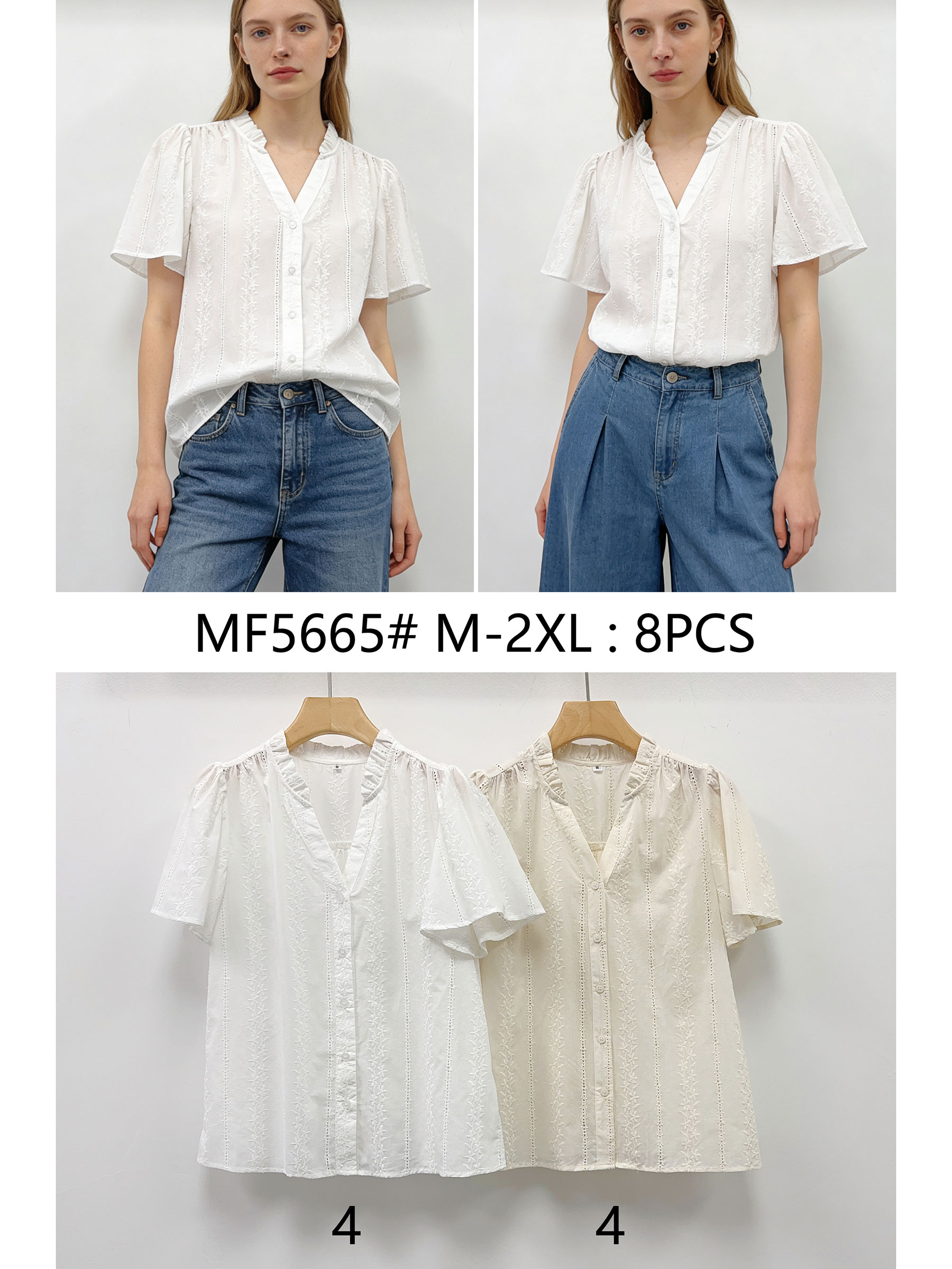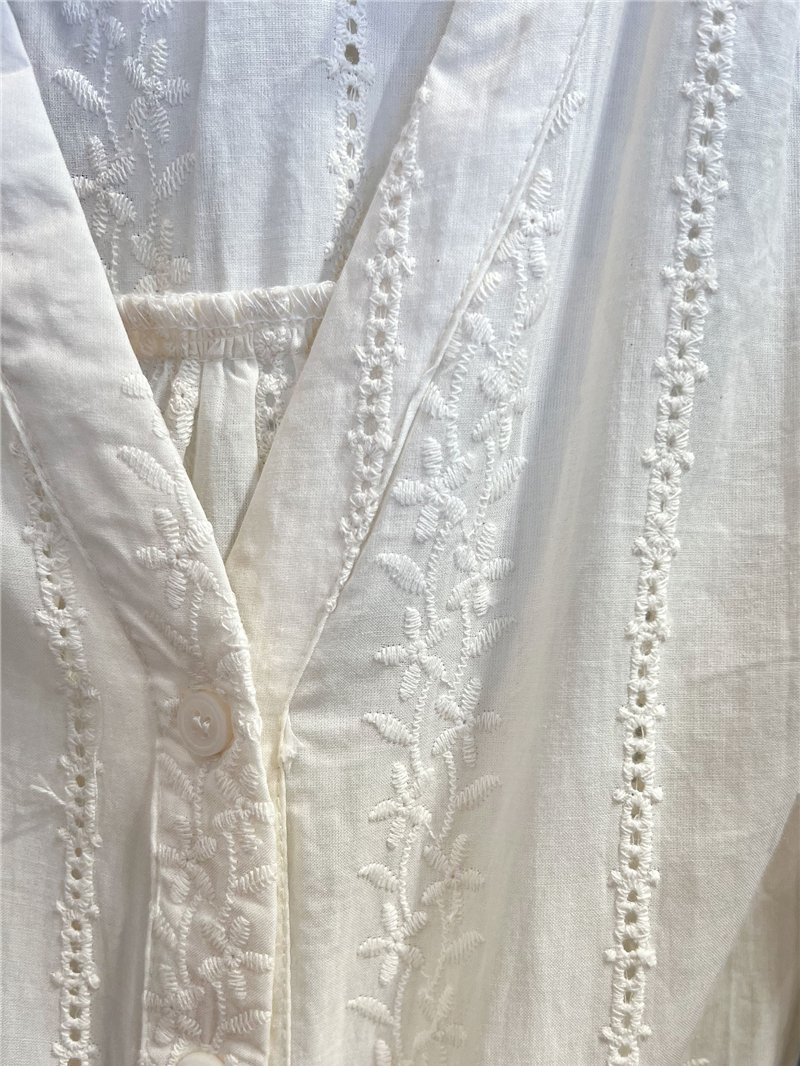 Blusa bordada de flores. Detalle calado vertical. Cuello pico con volante. Manga corta evasé. Cierre mediante botones.