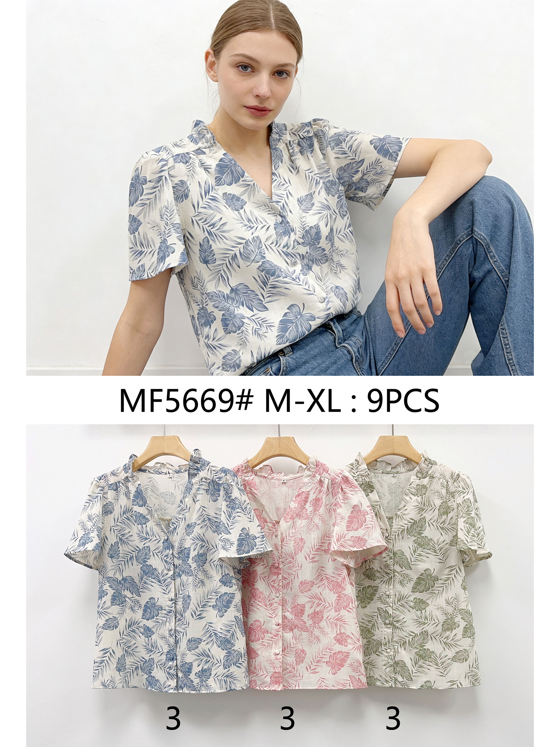 Blusa estampada de hojas. Cuello pico con volante. Manga corta. Cierre mediante botones.