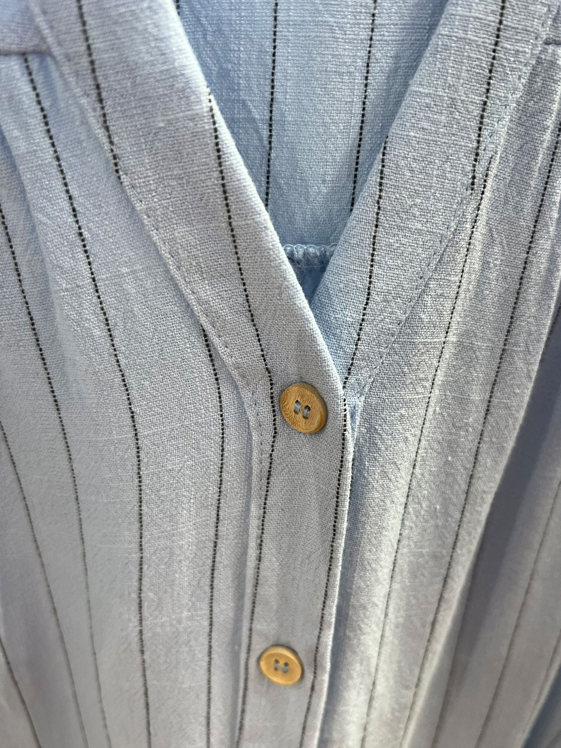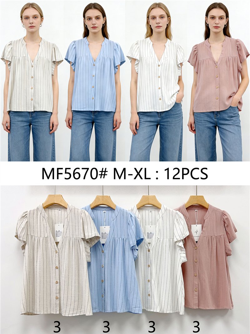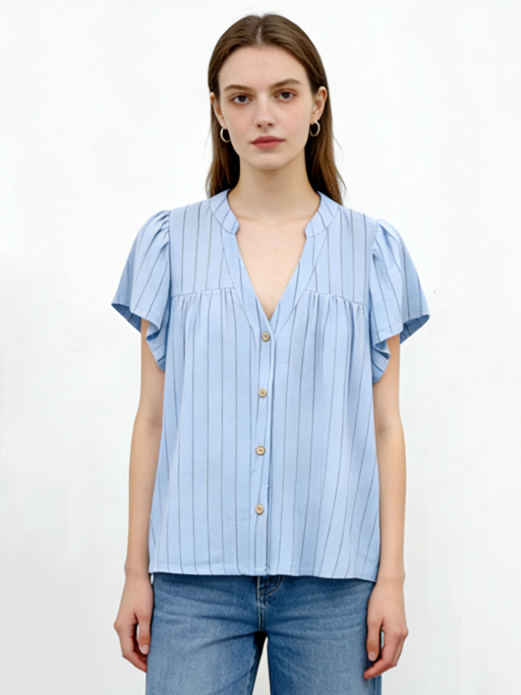Blusa de rayas. Cuello pico. Manga corta con volante. Fruncido frontal. Cierre mediante botones.