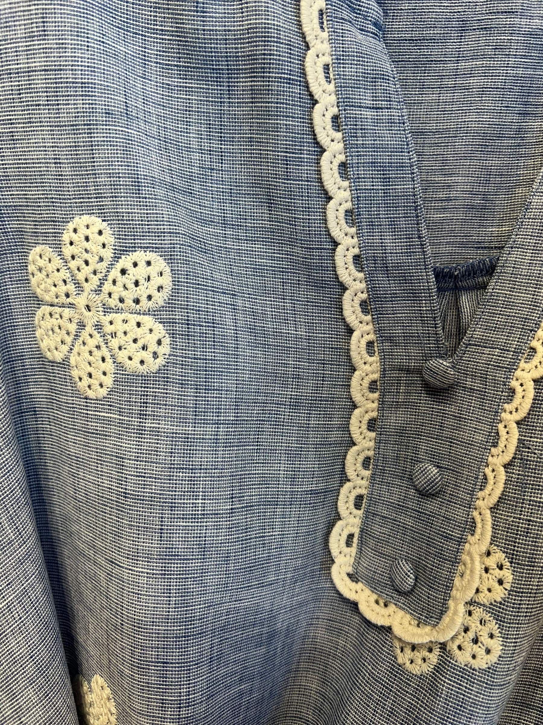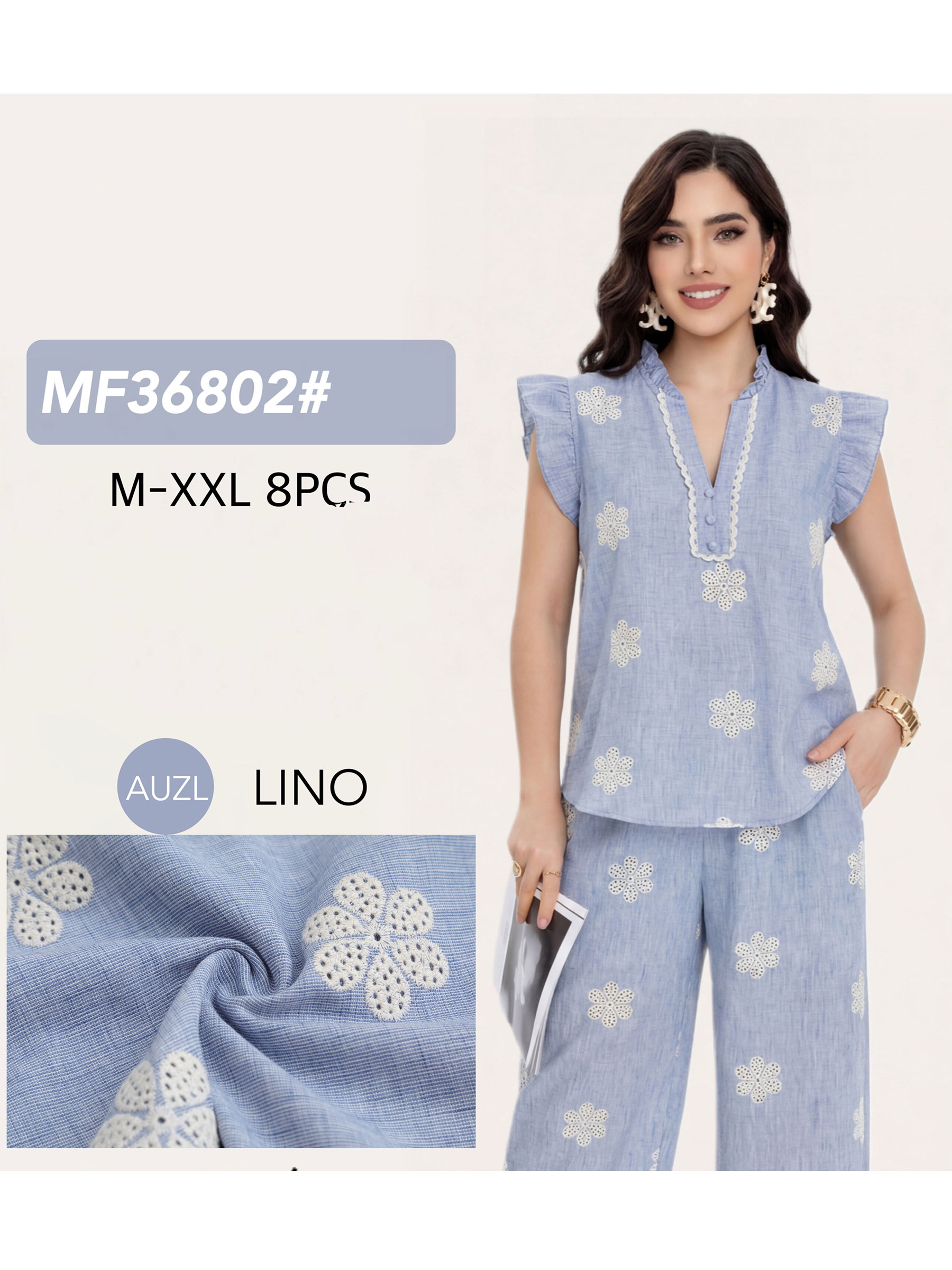 Blusa lino. Escote pico. Manga sisa con volante. Detalle flores caladas. Tapeta con botones.