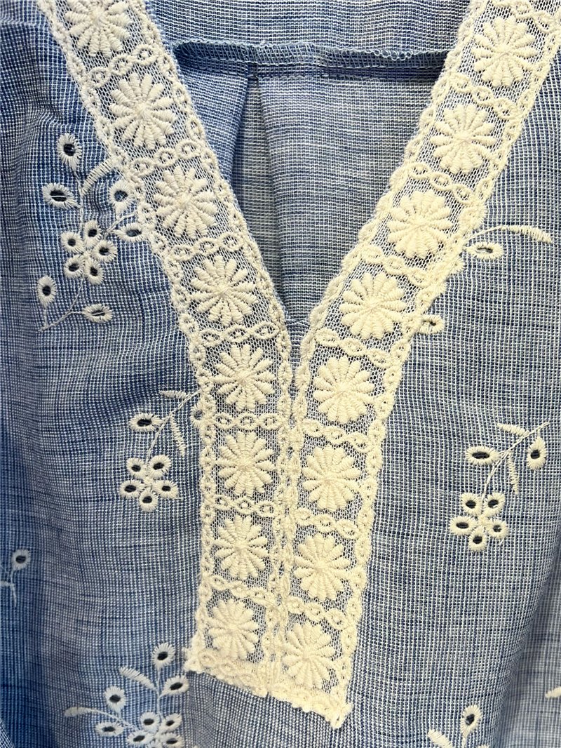 Blusa bordada lino. Escote pico. Sin mangas. Hombro con volante. Detalle puntilla.