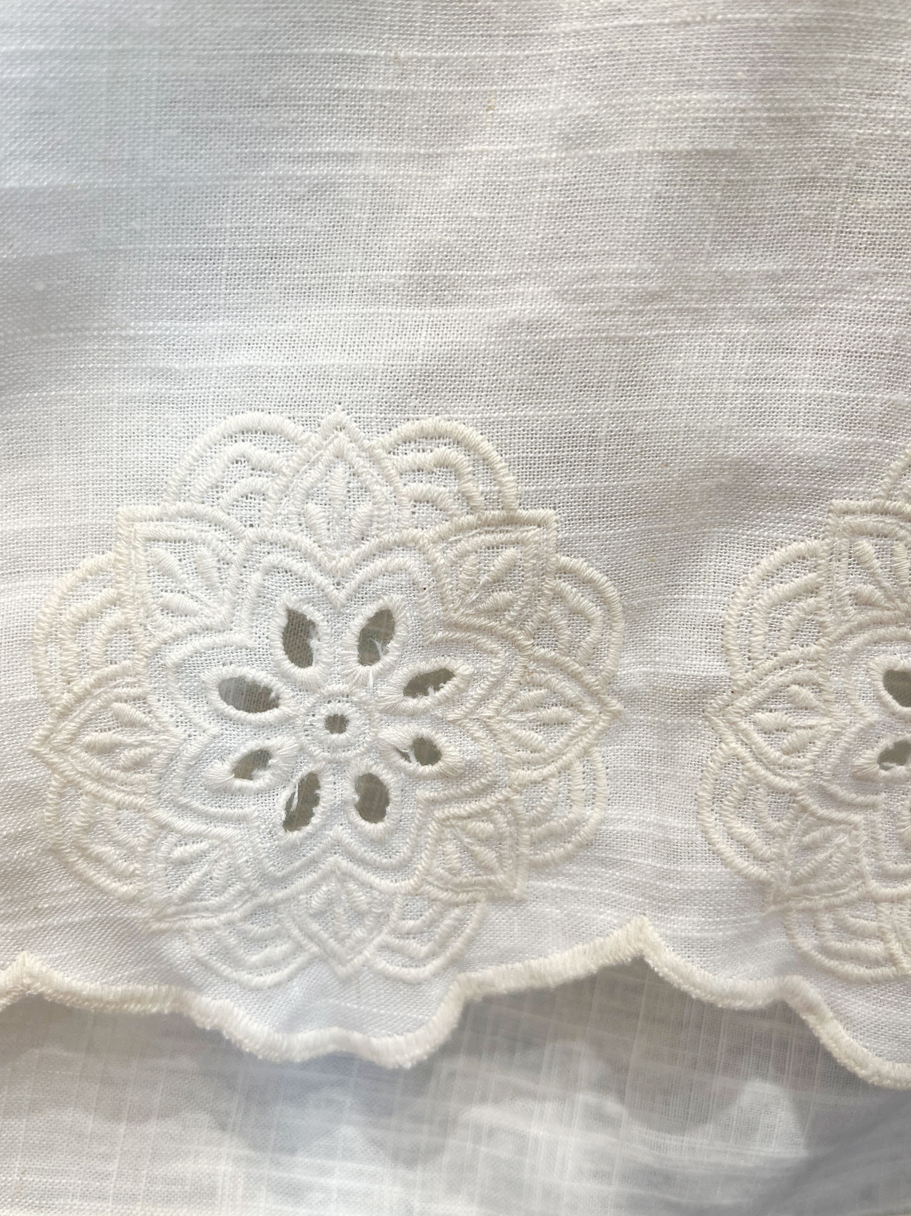 Blusa de lino. Escote pico. Manga sisa con volante. Bordado calado en el bajo. Bajo festoneado.