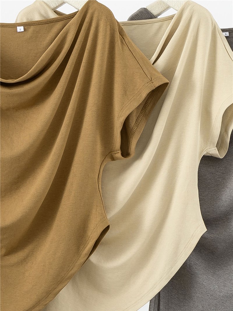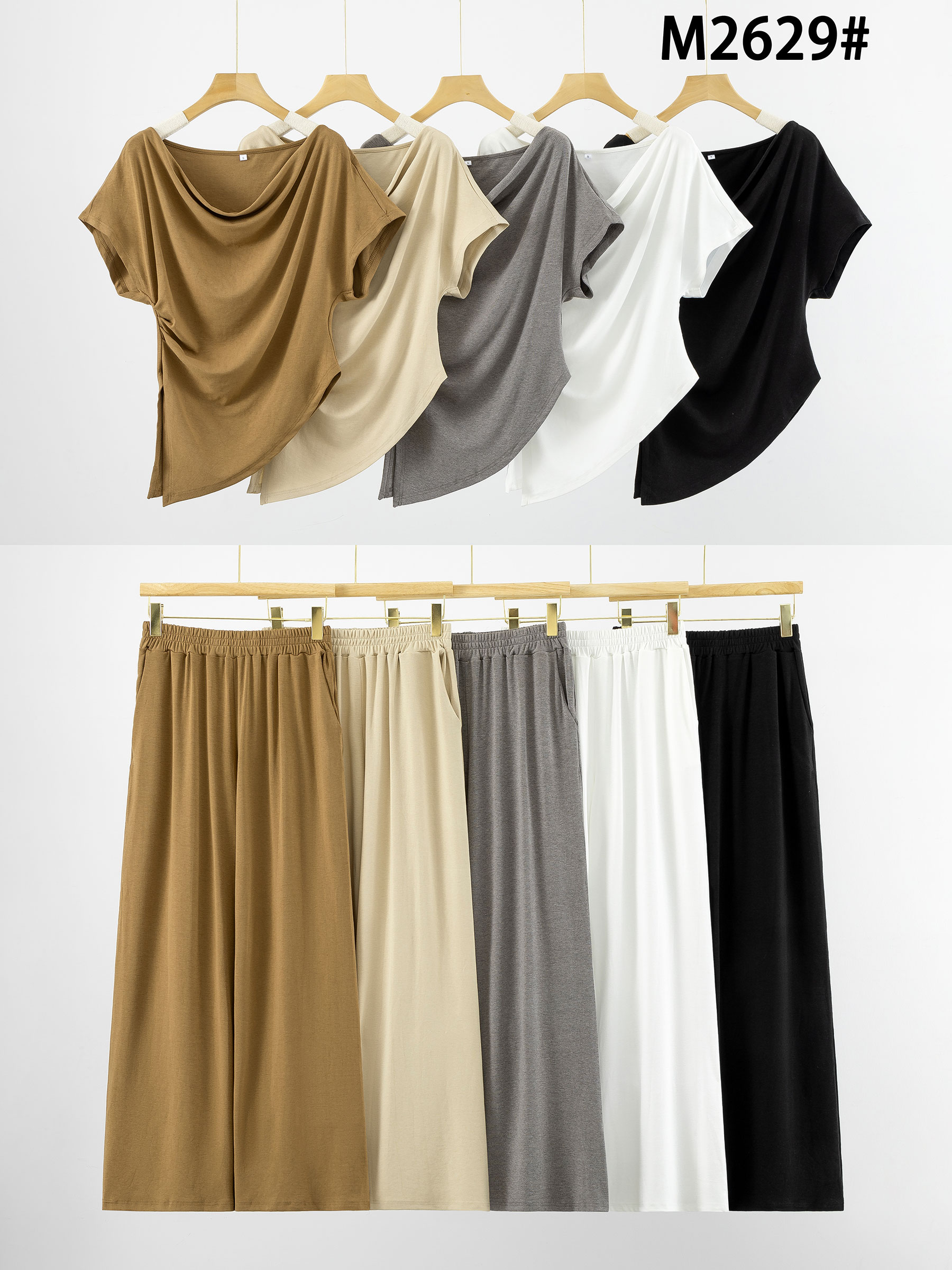 Conjunto de dos piezas. Top drapeado asimétrico. Manga corta caída. Pantalón palazzo. Cintura elástica. Tejido fluido.