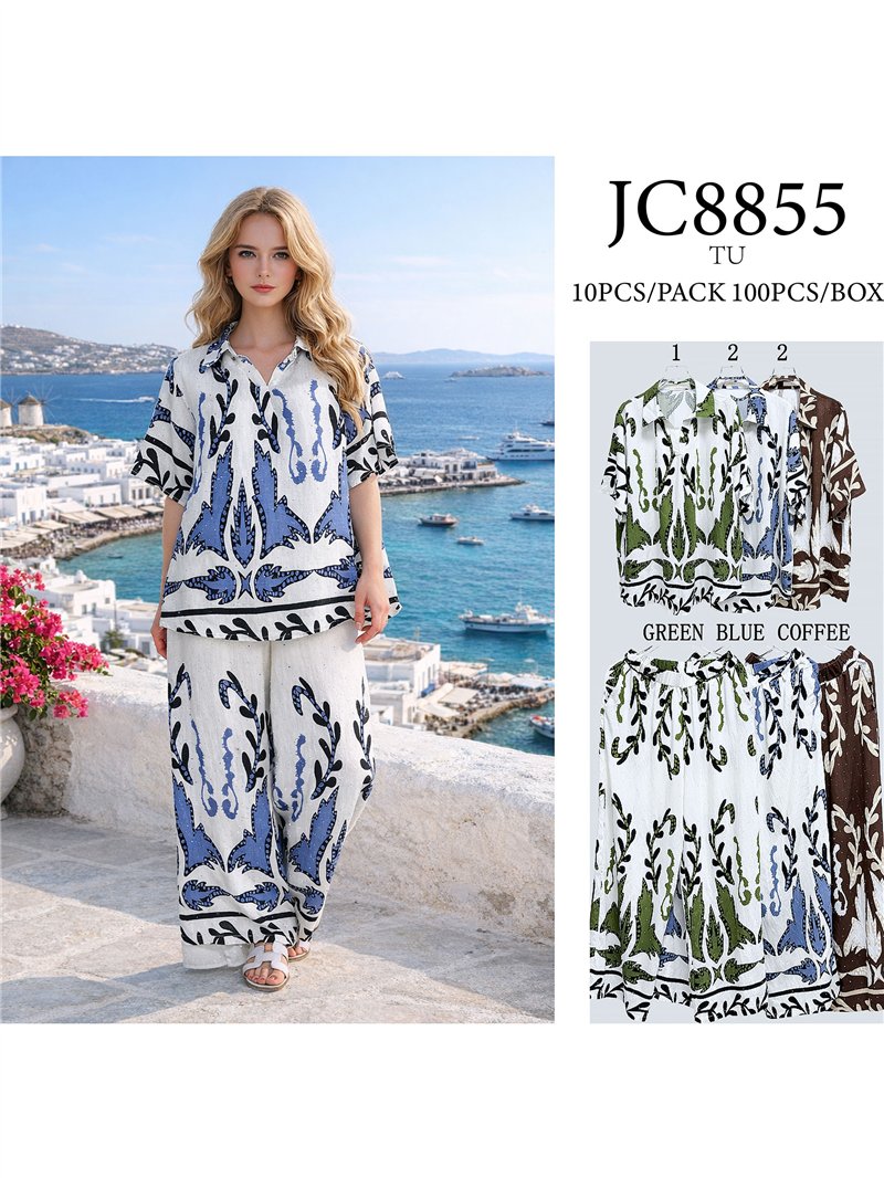 Conjunto talla grande blusa estampada abstracta con strass y pantalón wide-leg.