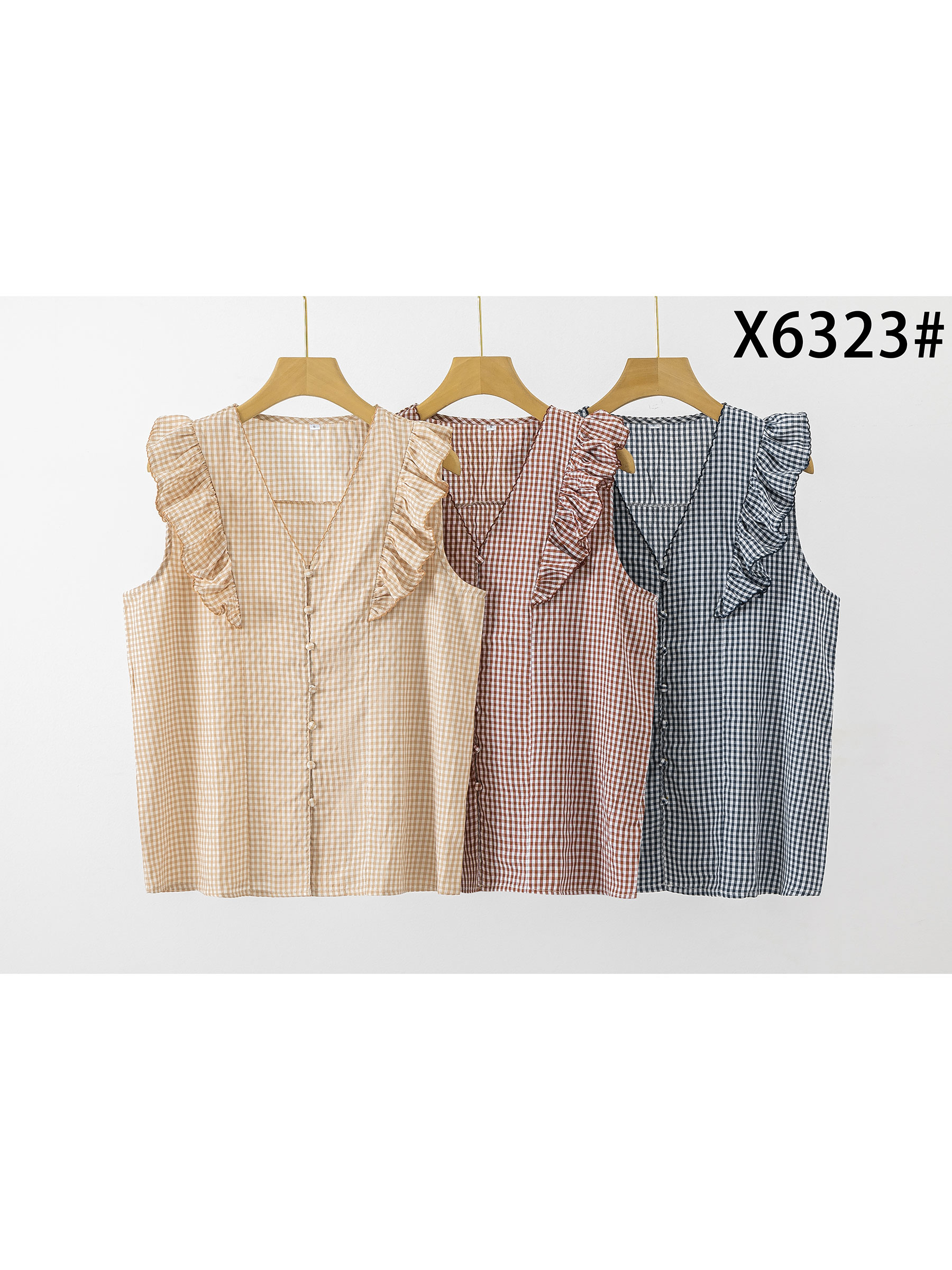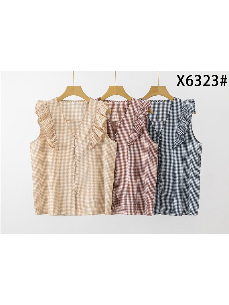 Nuevo Mín. 6 Blusas Blusa cuadros con volante DB-X6275 Tallas: S-M-L.Colección: Primavera/Verano 2026. Ver precio