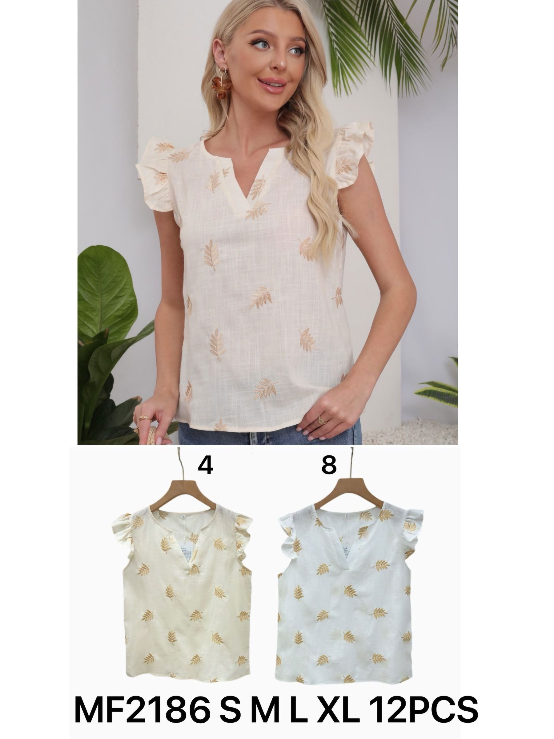 Blusa bordada. Motivo de hojas. Escote pico. Sin mangas con volante. Tejido de algodón. Bajo recto.