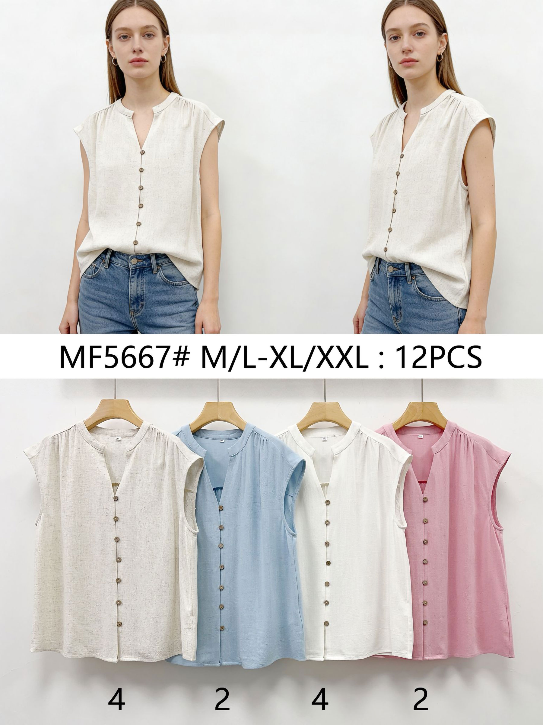 Blusa lisa. Escote pico. Sin mangas. Cierre frontal con botones.