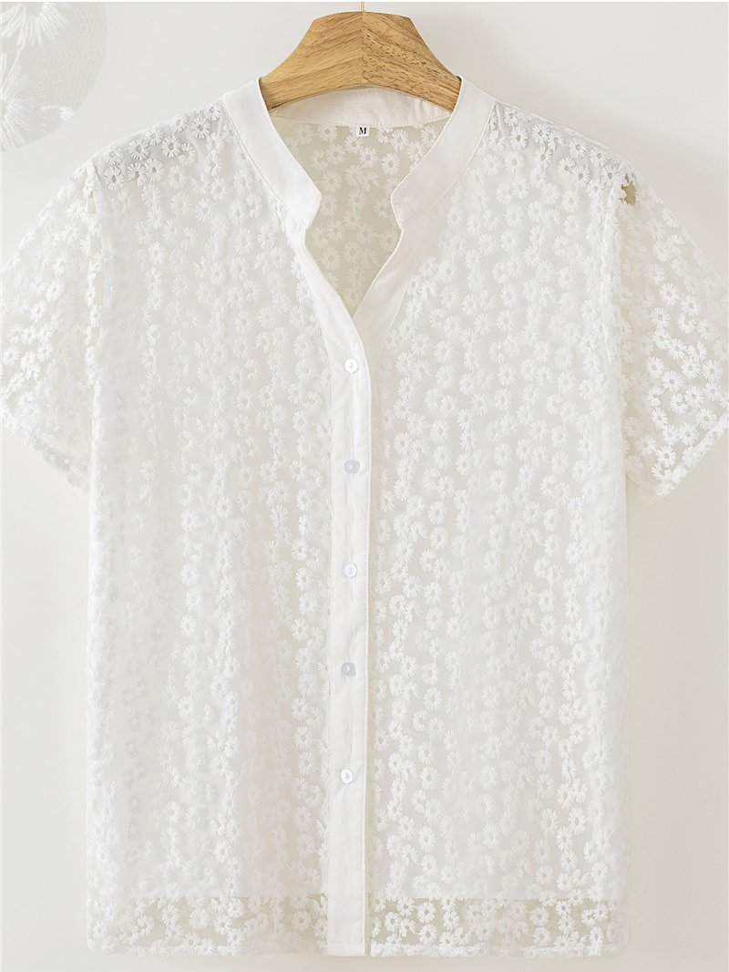 Blusa de encaje floral con manga corta y cuello mao abierto.