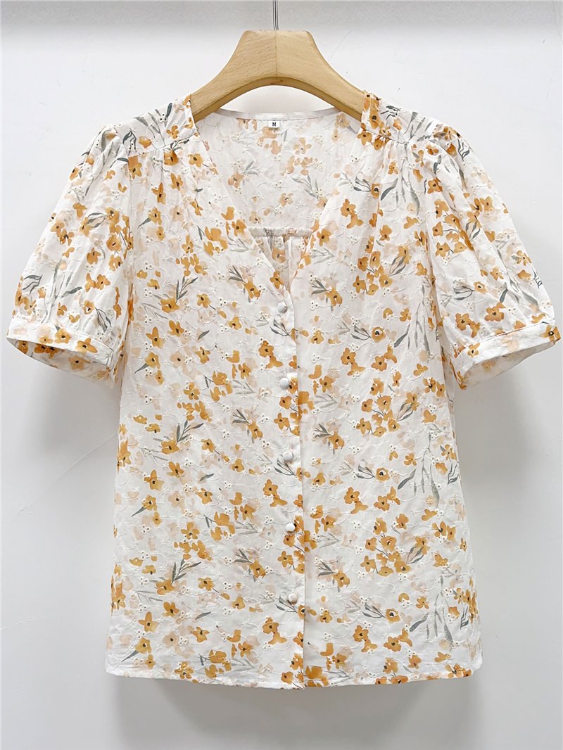 Blusa estampada con escote en pico y manga corta abullonada.